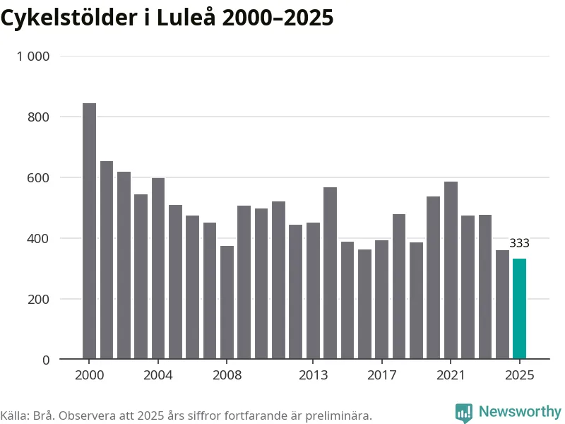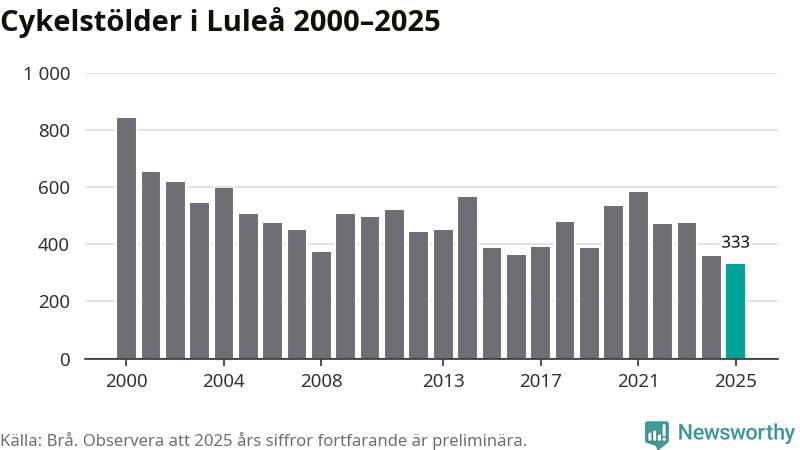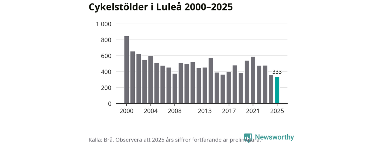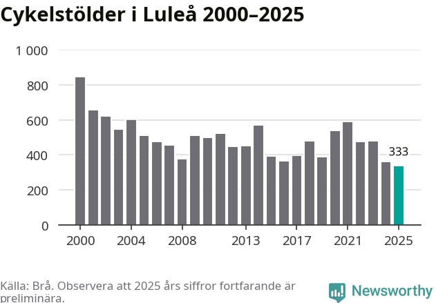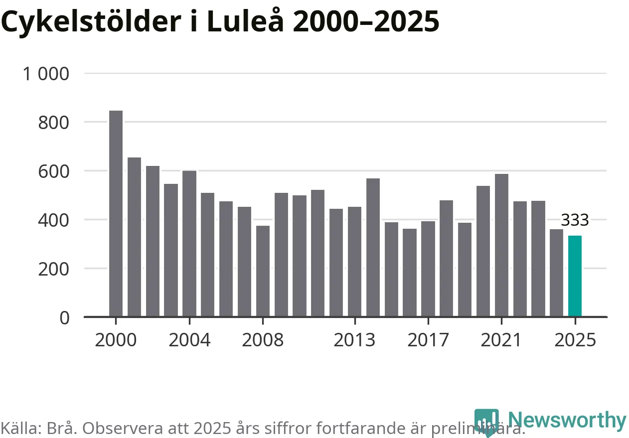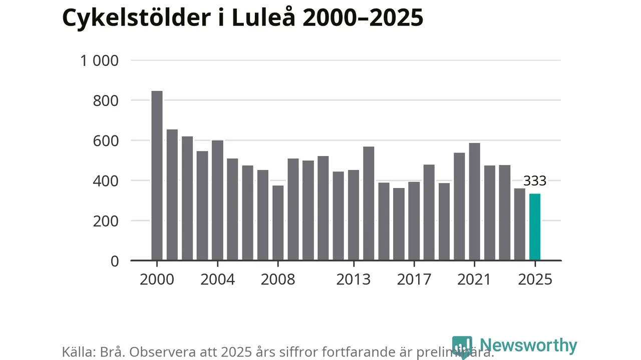 I Luleå kommun noterades det lägsta antalet cykelstölder under hela 2000-talet år 2025, även om det fortfarande är preliminära siffror. Under de senaste 25 åren har det som mest anmälts 844 cykelstölder på ett år (2000).