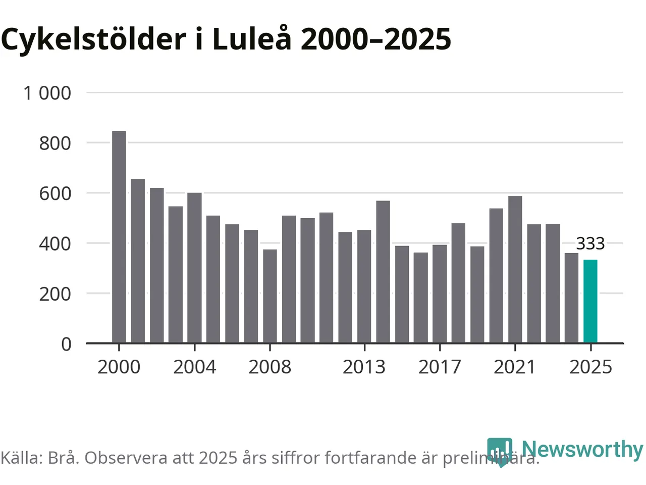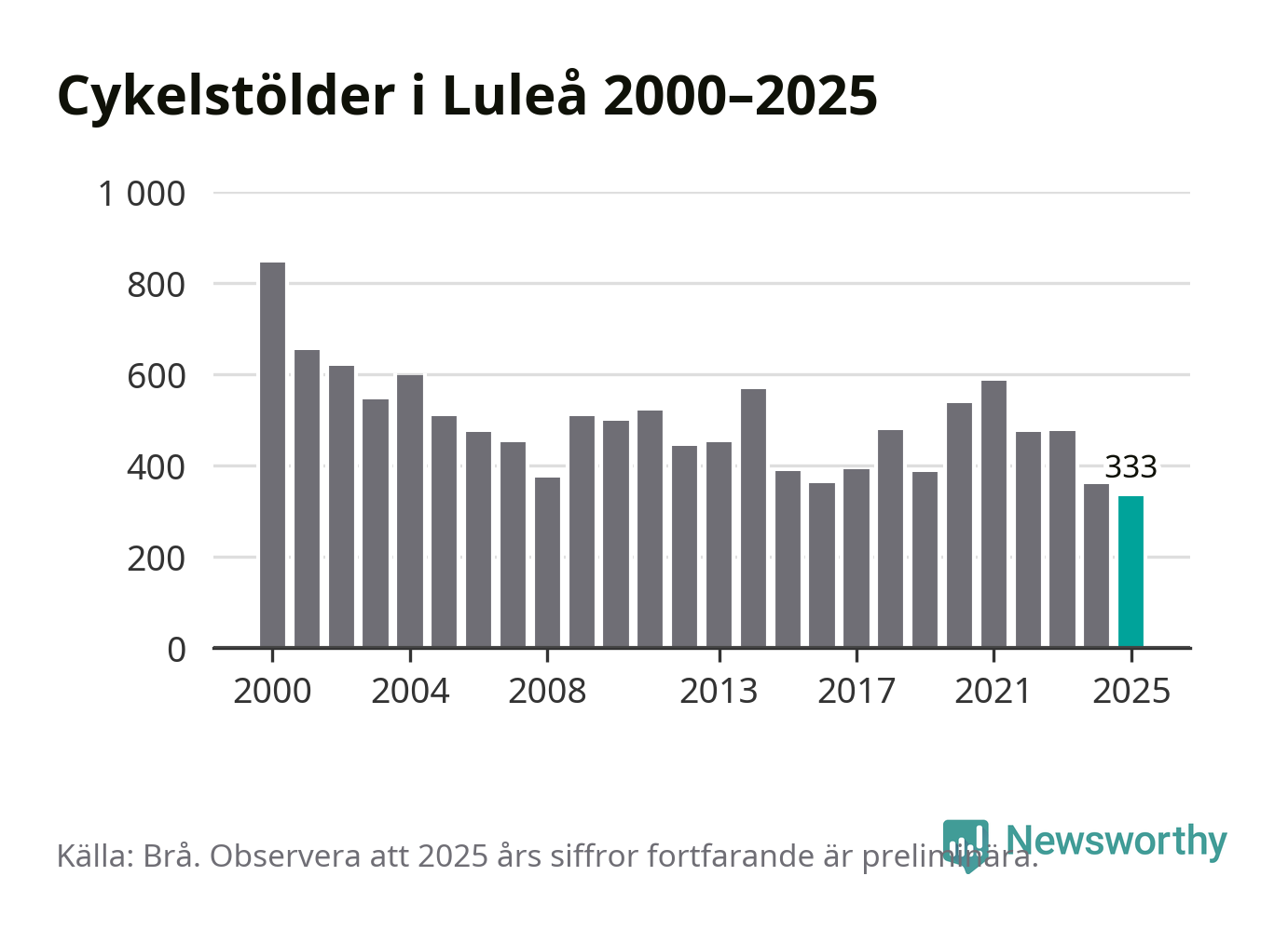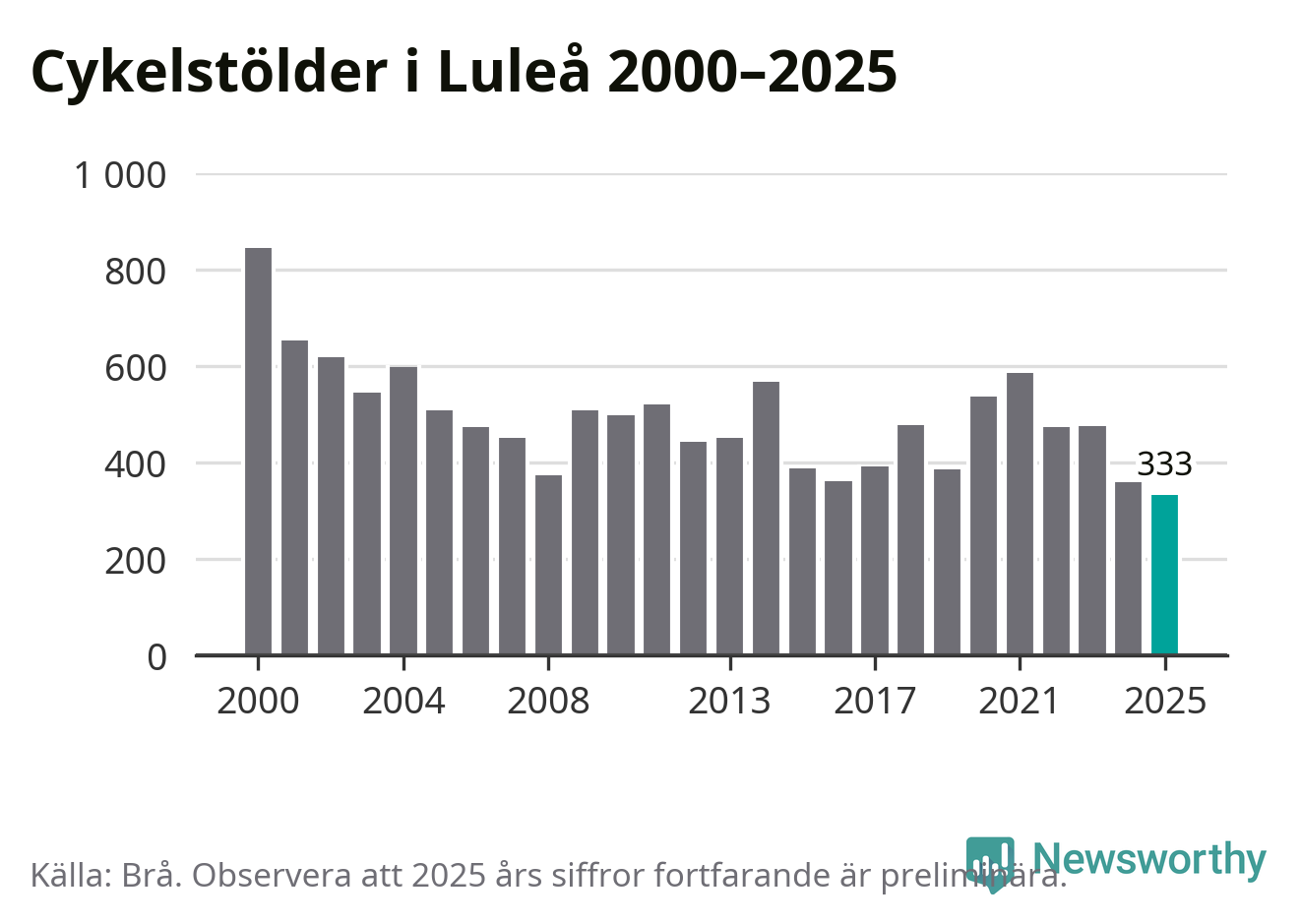 I Luleå kommun noterades det lägsta antalet cykelstölder under hela 2000-talet år 2025, även om det fortfarande är preliminära siffror. Under de senaste 25 åren har det som mest anmälts 844 cykelstölder på ett år (2000).