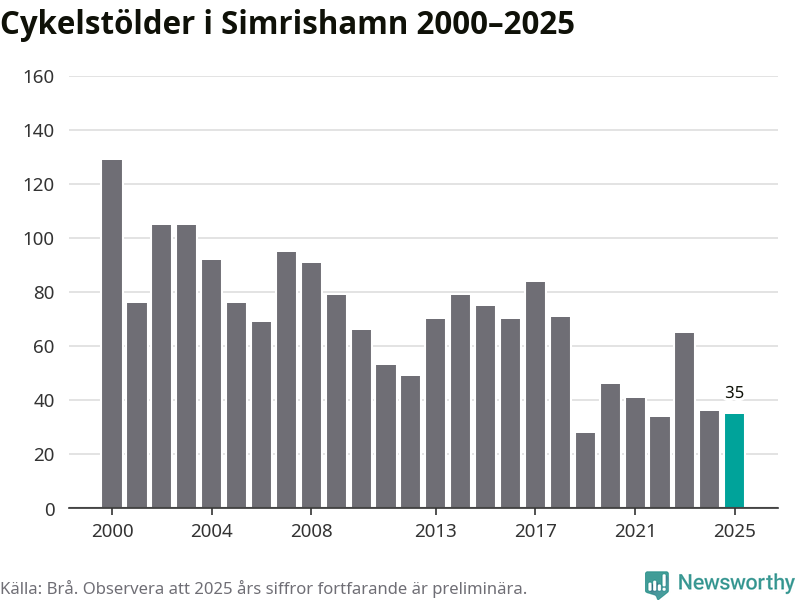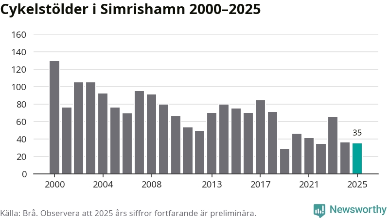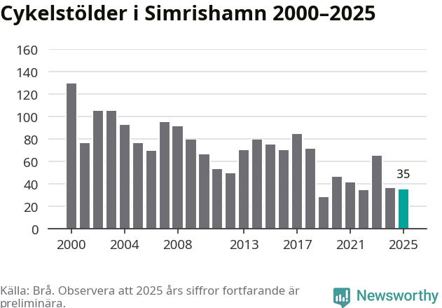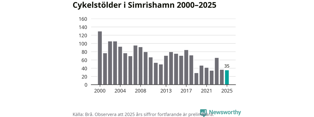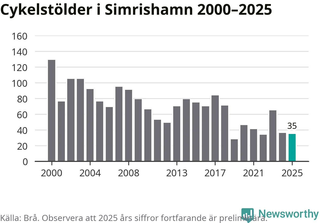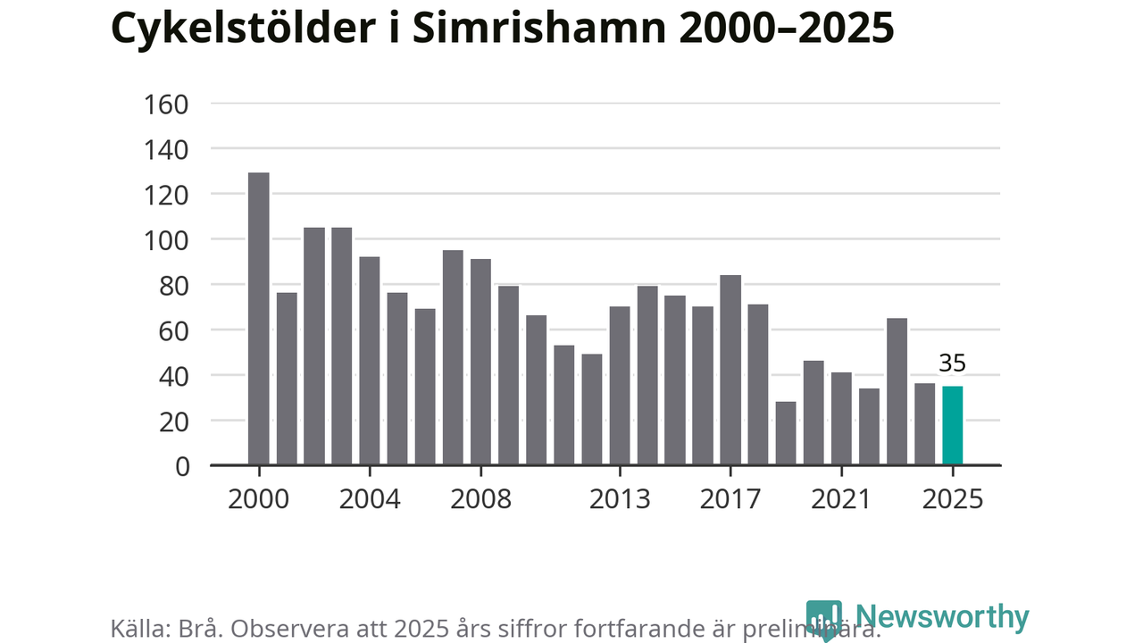 Av de 35 stöldanmälningar i Simrishamn 2025 gällde sju elcyklar, det motsvarar 20 procent. Brå särredovisar elcyklar sedan 2020 och i riket som helhet ökade anmälningarna om stulna elcyklar kraftigt de första åren, för att de senaste tre åren ha legat relativt stilla. Eftersom antalet cykelstölder totalt har minskat under samma tid har andelen elcyklar ökat. I fjol stod elcyklar för 28 procent av alla anmälda cykelstölder i landet.