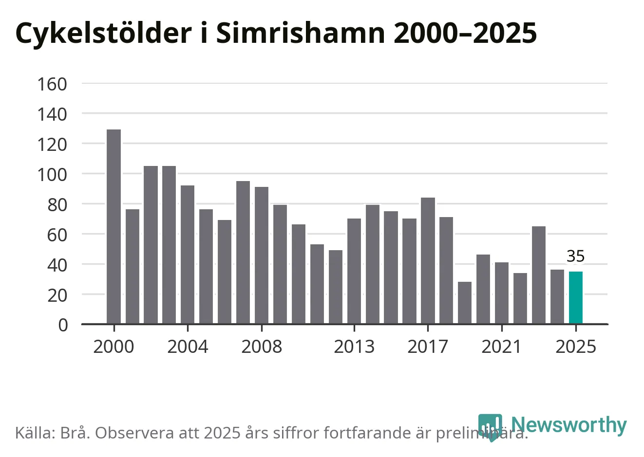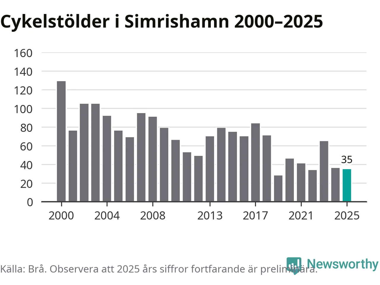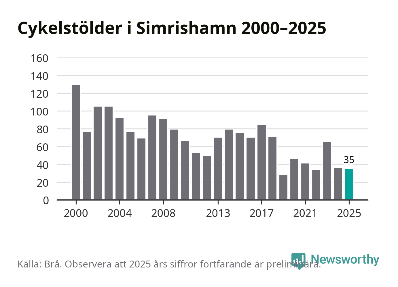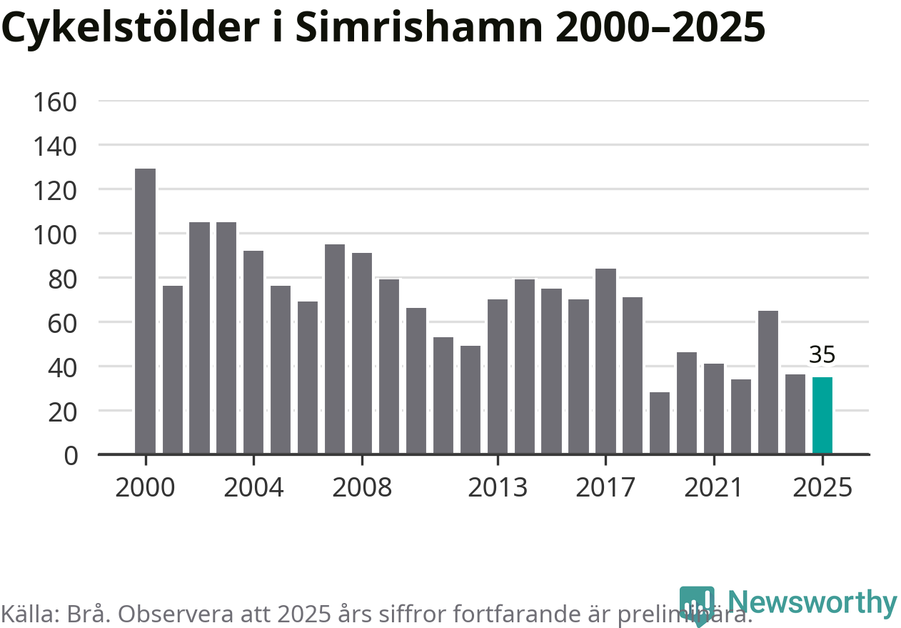 I Simrishamns kommun var antalet cykelstölder relativt få i en historisk kontext år 2025, även om det fortfarande är preliminära siffror. Under de senaste 25 åren har det som mest anmälts 129 cykelstölder på ett år (2000), som minst 28 stycken (2019).