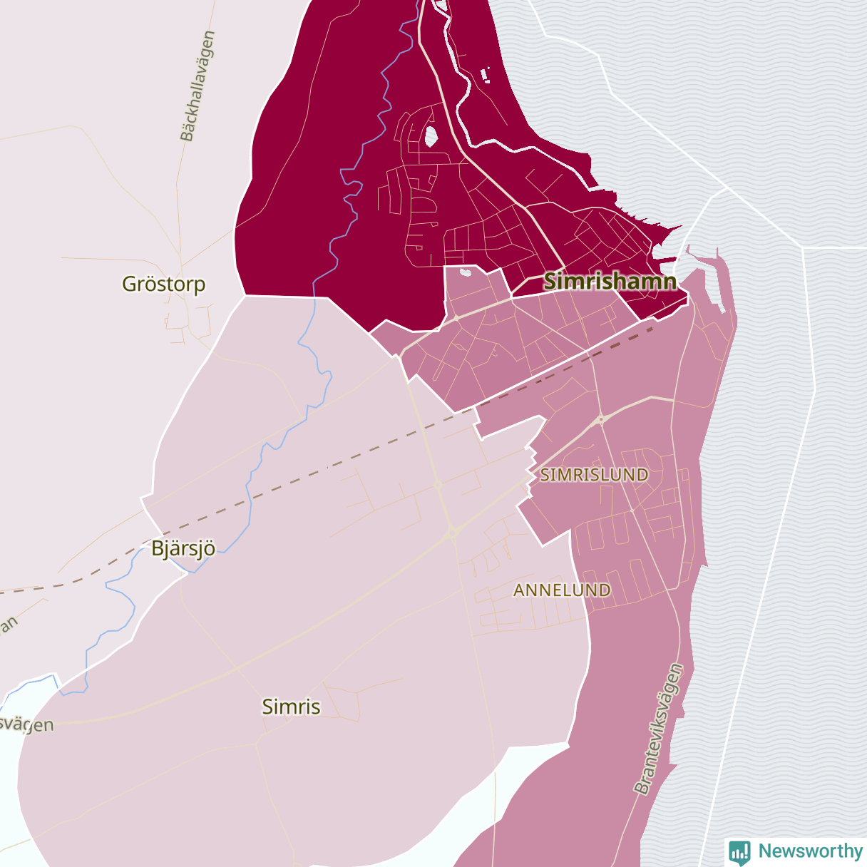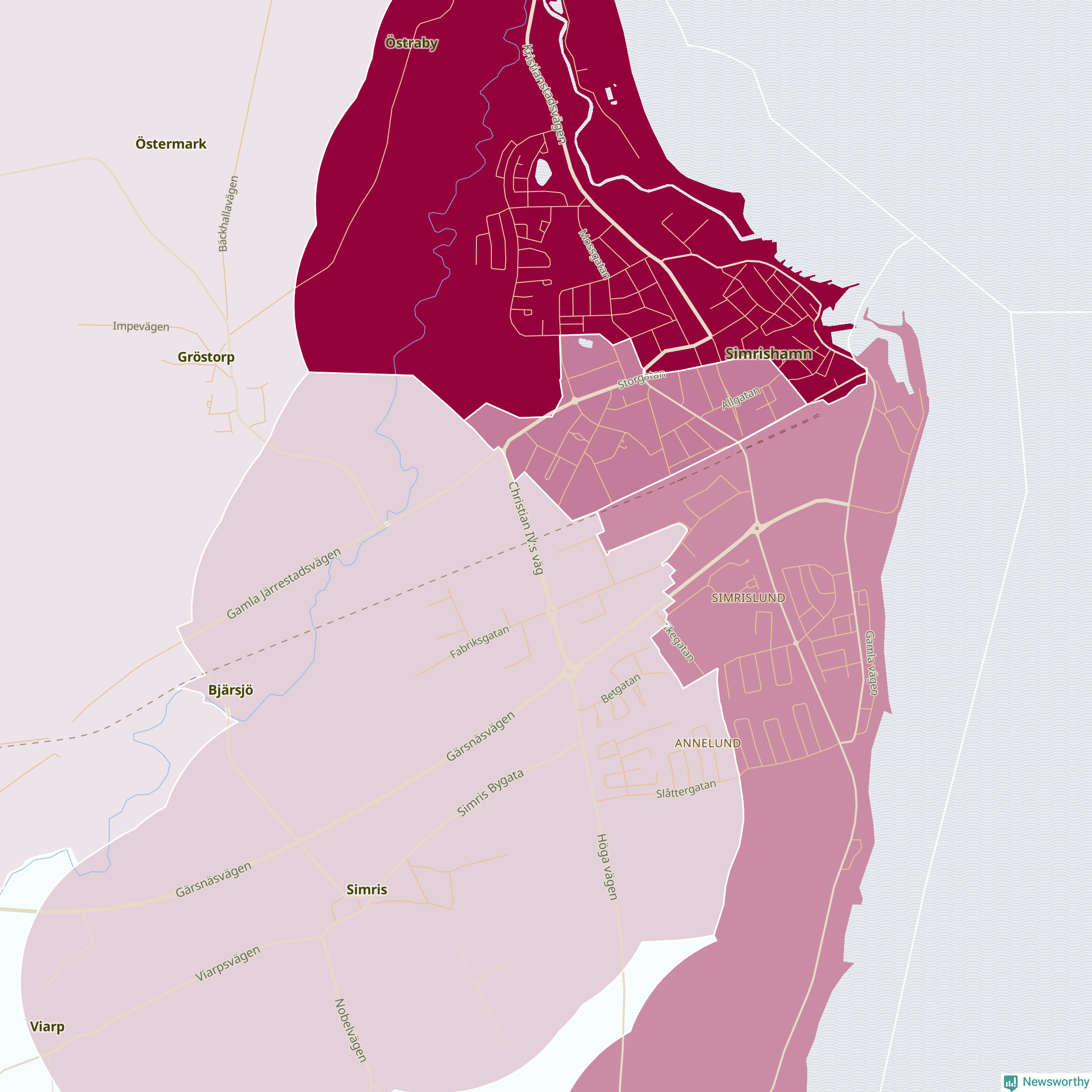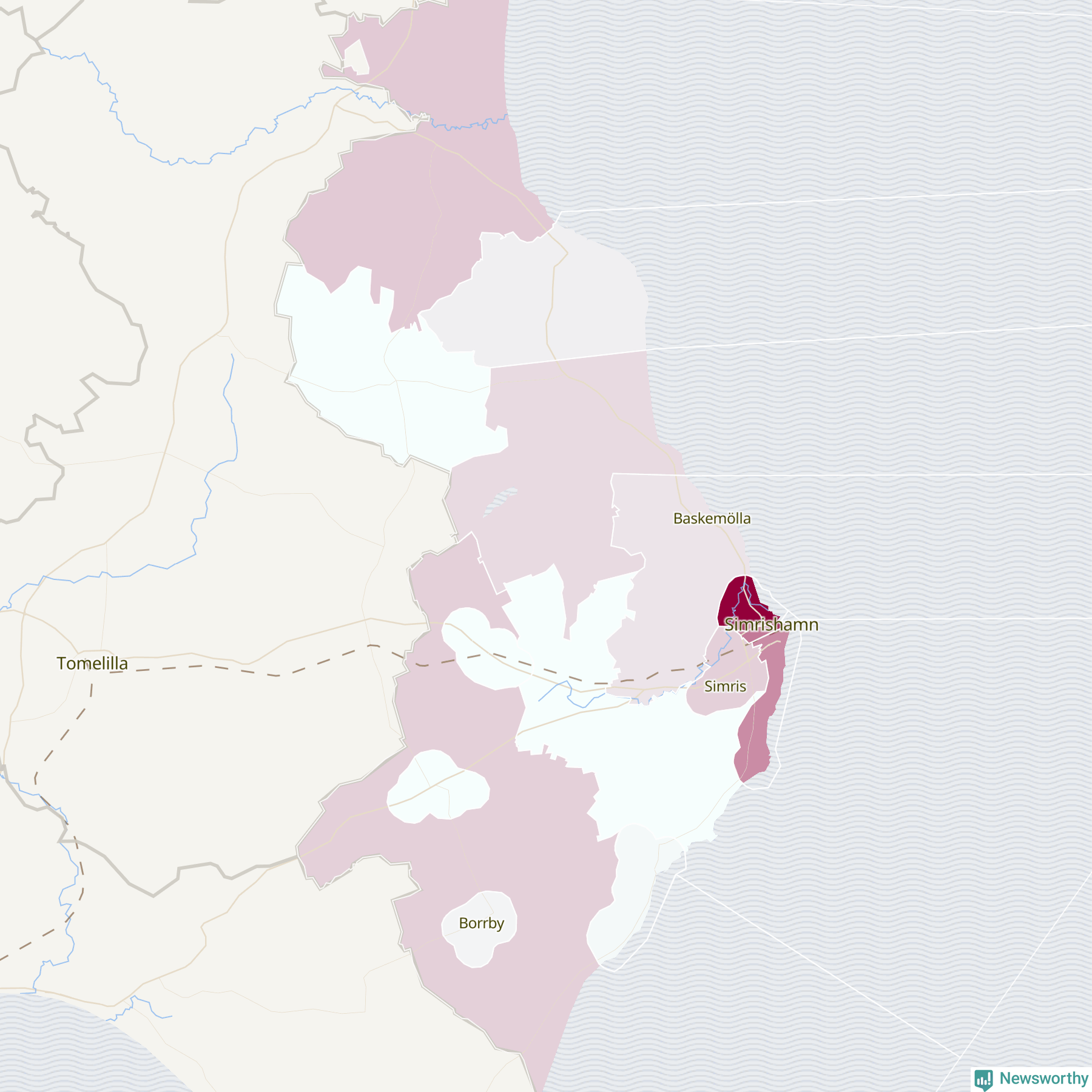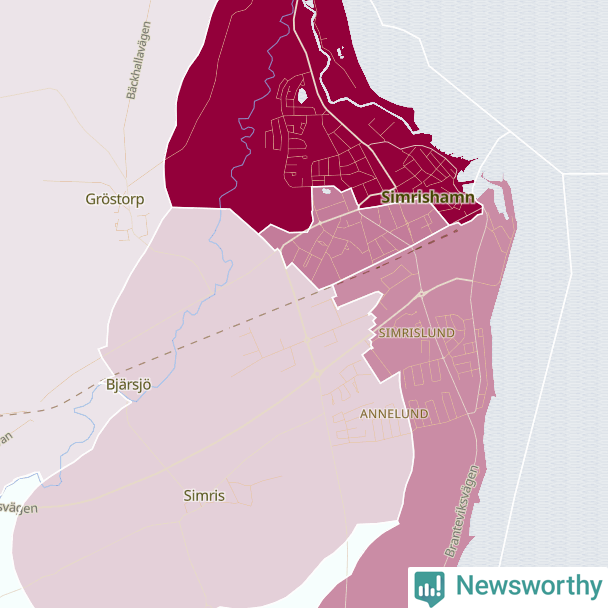 Men alla delar av Simrishamn är inte lika hårt drabbade. Det visar data för de senaste fem åren, som Newsworthy har begärt ut från polisen. De anmälda stölderna har kopplats till SCB:s 15 statistiska områden i kommunen. Det rör sig om mellan en handfull och ett femtiotal anmälda stölder per område.