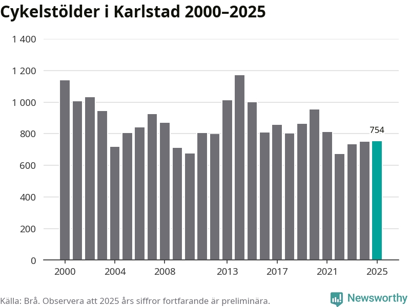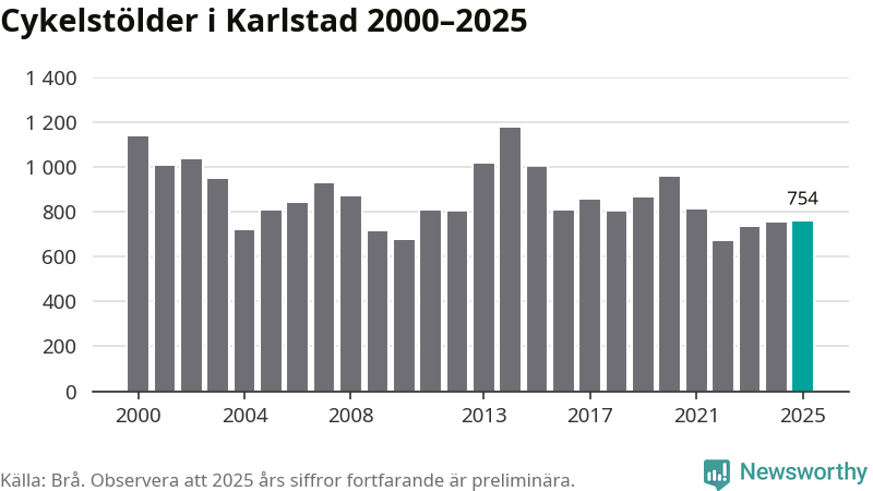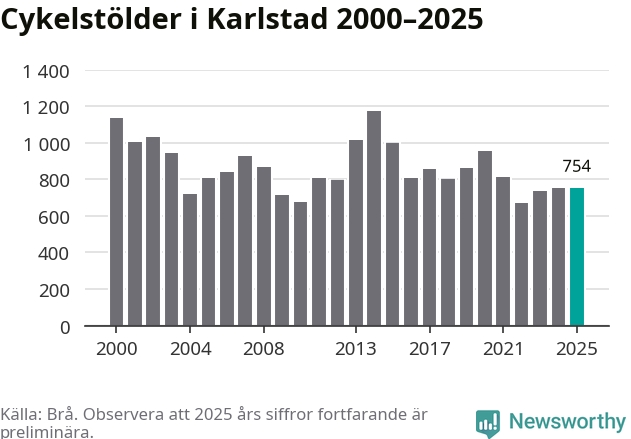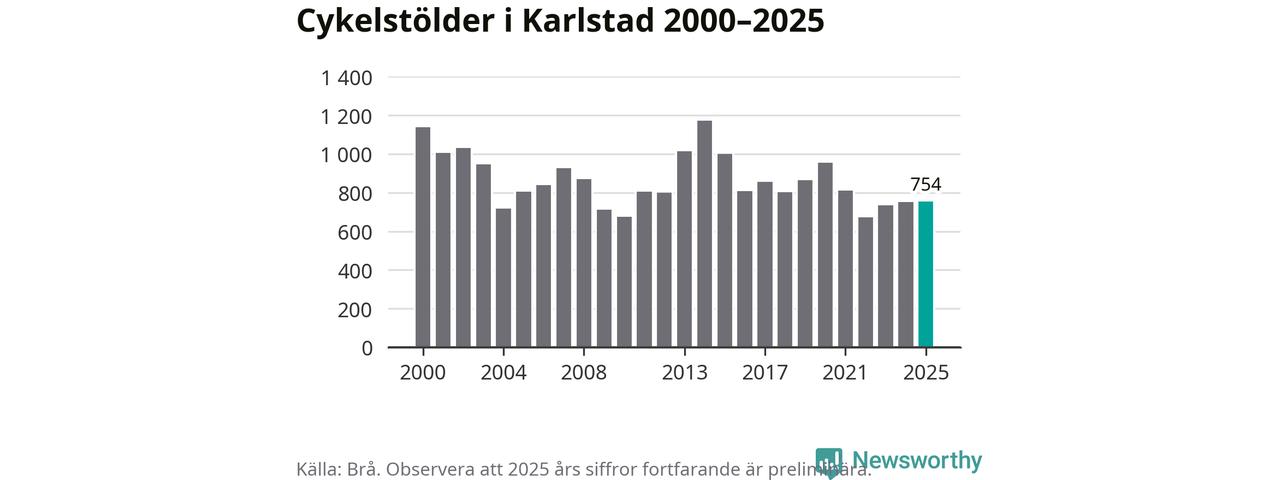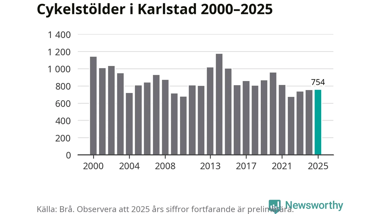 I Karlstads kommun sticker antalet cykelstölder 2025 inte ut i en historisk kontext. Under de senaste 25 åren har det som mest anmälts 1 172 cykelstölder på ett år (2014), som minst 671 stycken (2022).