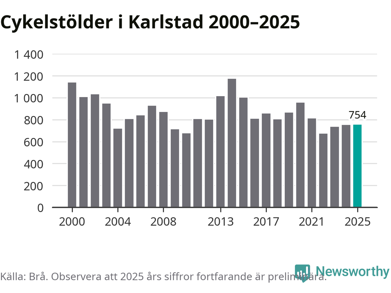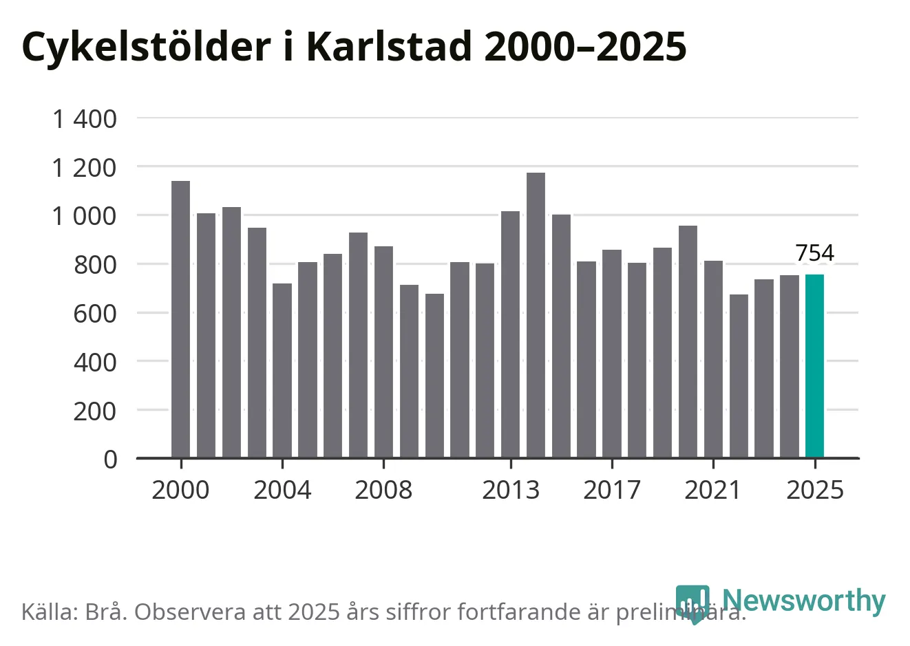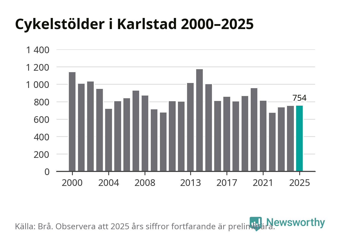 I Karlstads kommun sticker antalet cykelstölder 2025 inte ut i en historisk kontext. Under de senaste 25 åren har det som mest anmälts 1 172 cykelstölder på ett år (2014), som minst 671 stycken (2022).