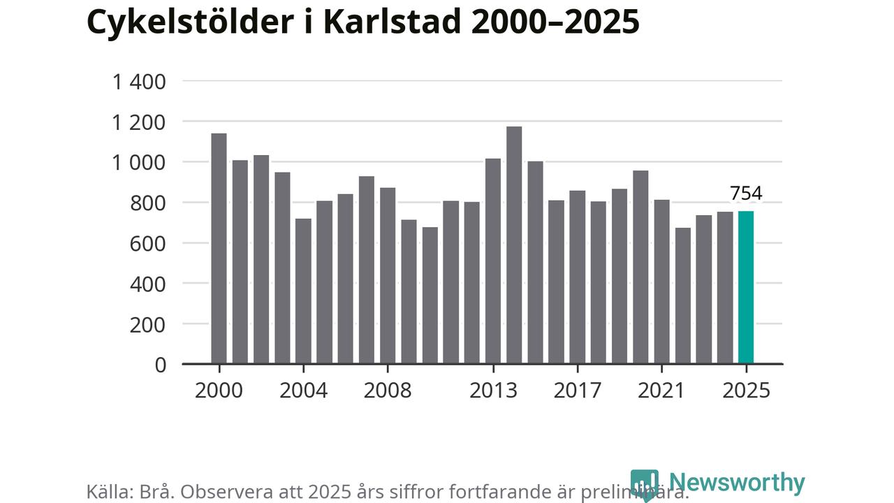 Av de 754 stöldanmälningar i Karlstad 2025 gällde 145 elcyklar, det motsvarar 19 procent. Brå särredovisar elcyklar sedan 2020 och i riket som helhet ökade anmälningarna om stulna elcyklar kraftigt de första åren, för att de senaste tre åren ha legat relativt stilla. Eftersom antalet cykelstölder totalt har minskat under samma tid har andelen elcyklar ökat. I fjol stod elcyklar för 28 procent av alla anmälda cykelstölder i landet.