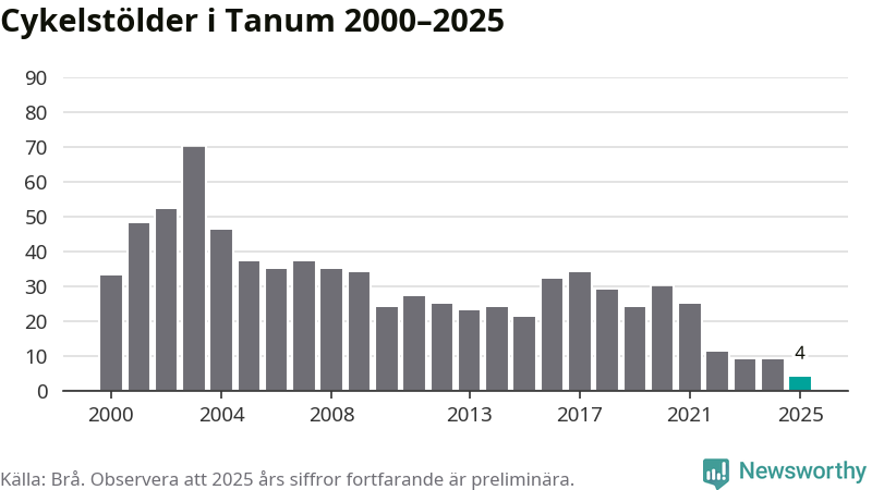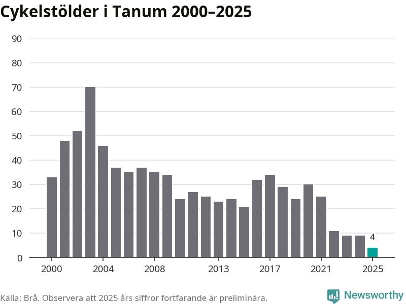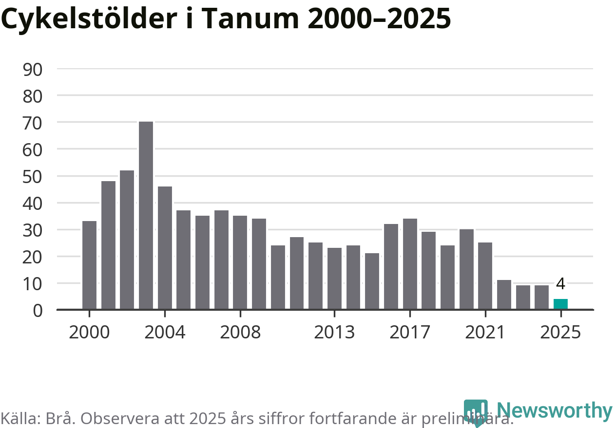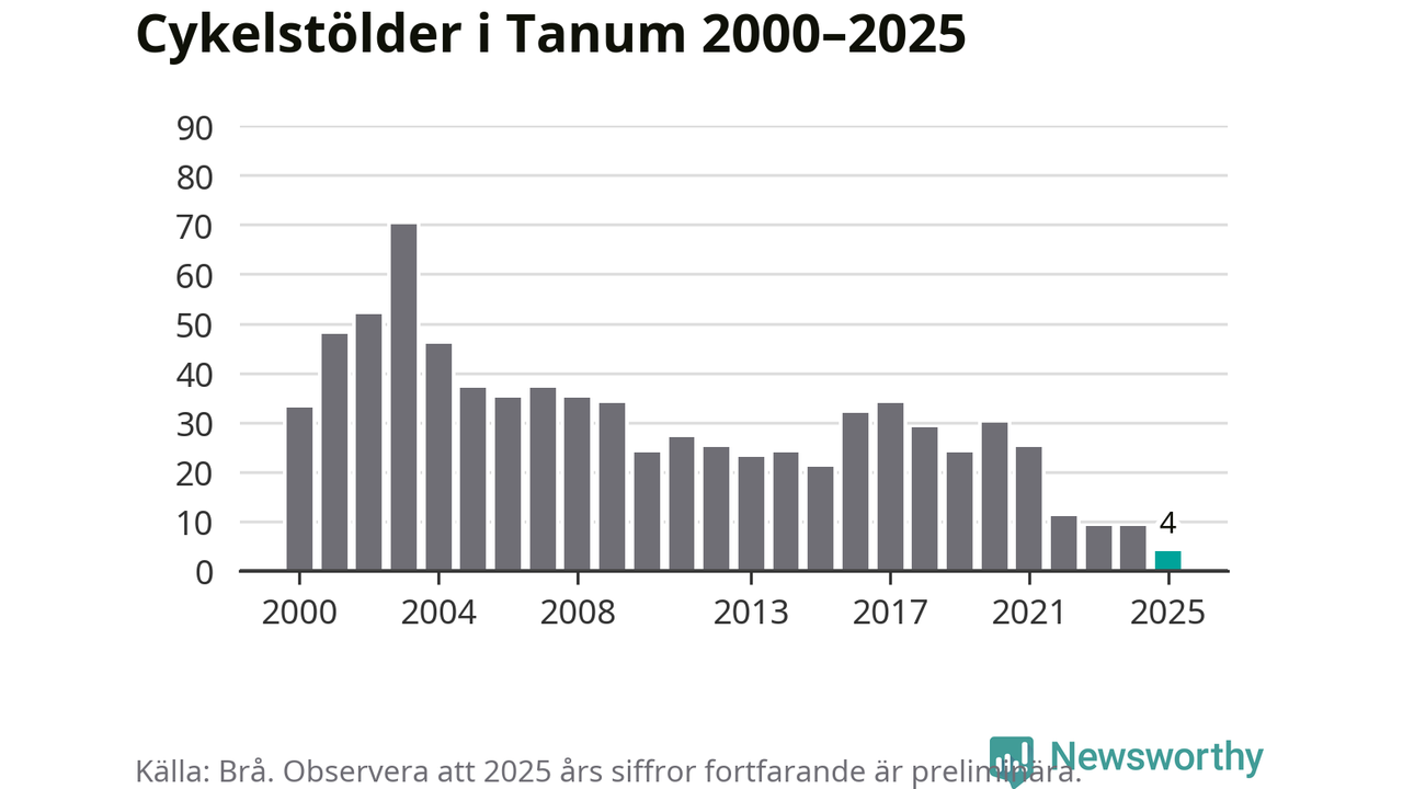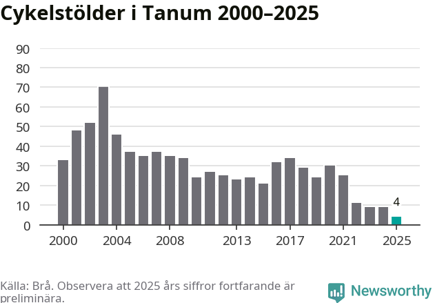 I Tanums kommun noterades det lägsta antalet cykelstölder under hela 2000-talet år 2025, även om det fortfarande är preliminära siffror. Under de senaste 25 åren har det som mest anmälts 70 cykelstölder på ett år (2003).