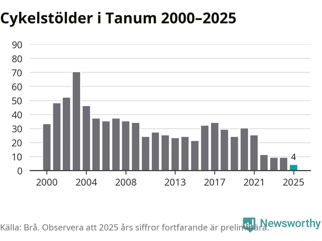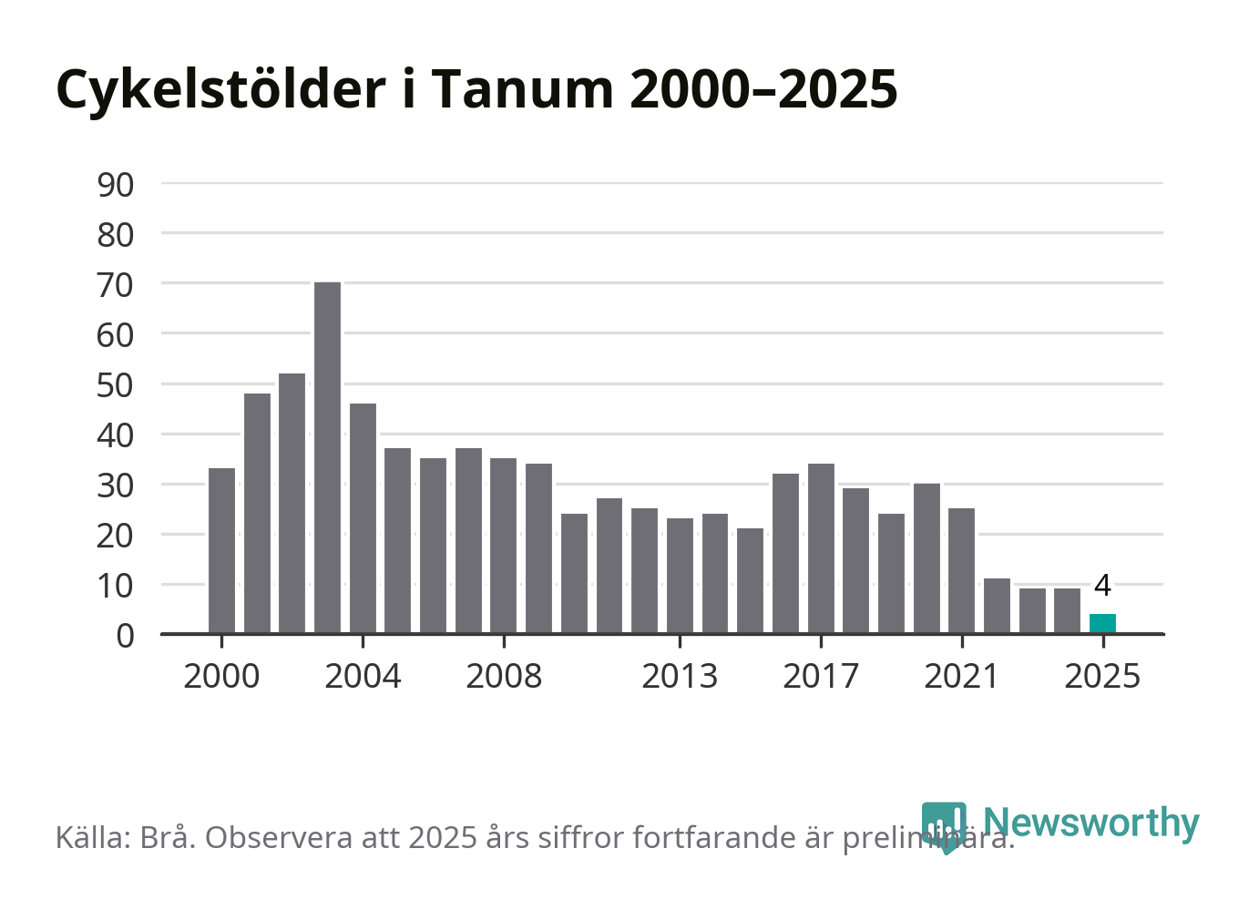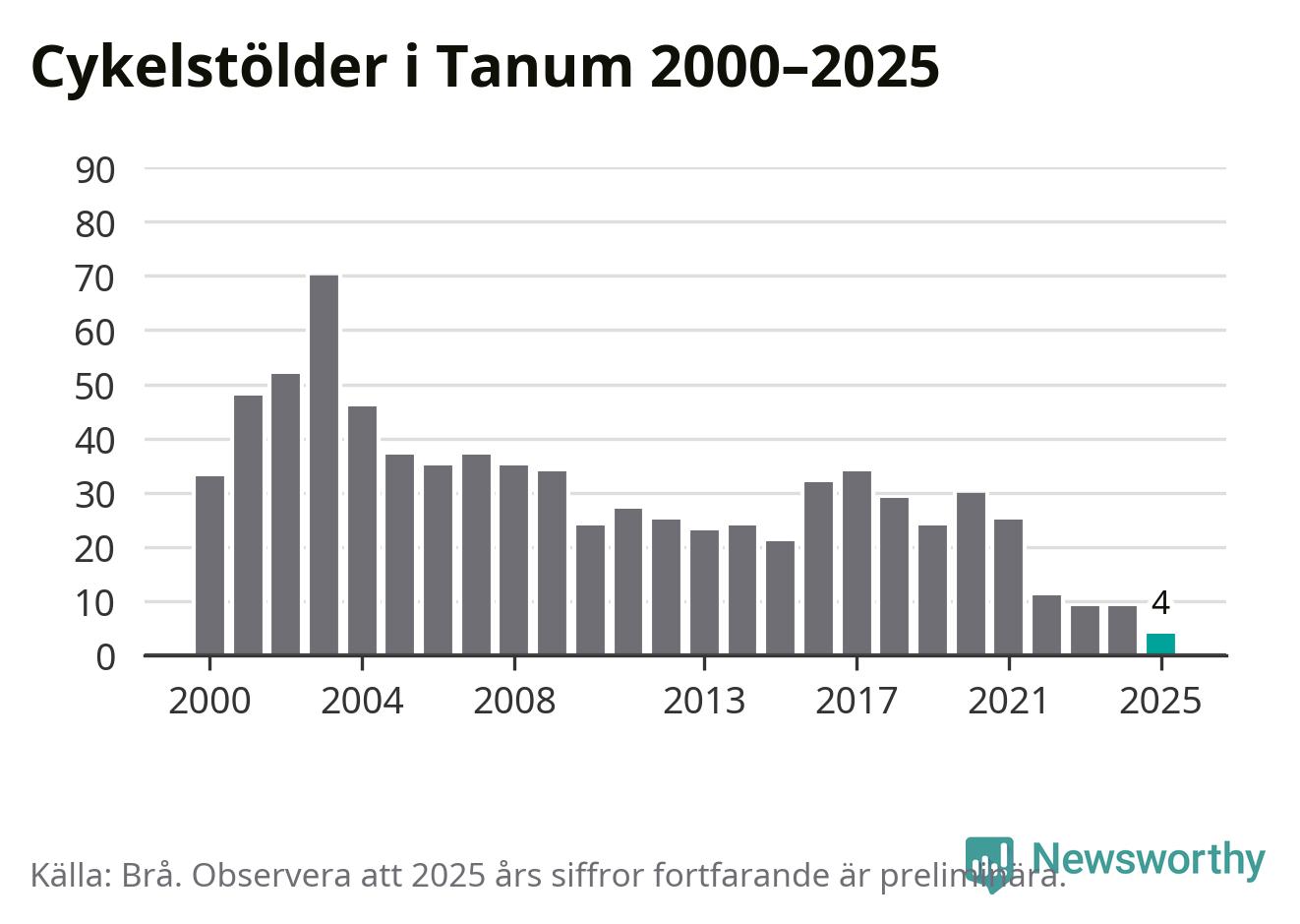 I Tanums kommun noterades det lägsta antalet cykelstölder under hela 2000-talet år 2025, även om det fortfarande är preliminära siffror. Under de senaste 25 åren har det som mest anmälts 70 cykelstölder på ett år (2003).