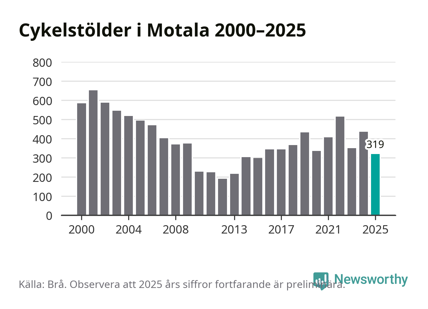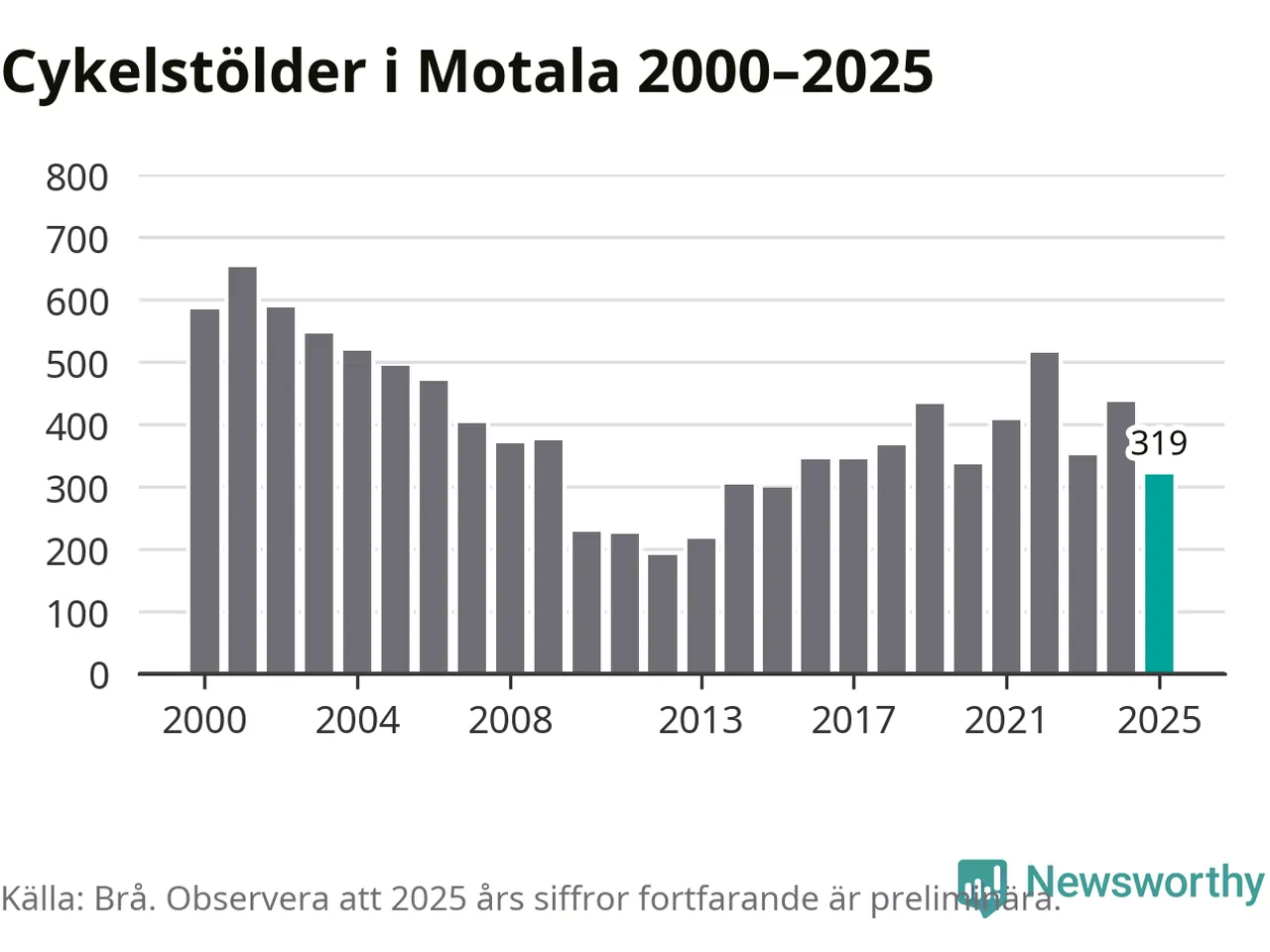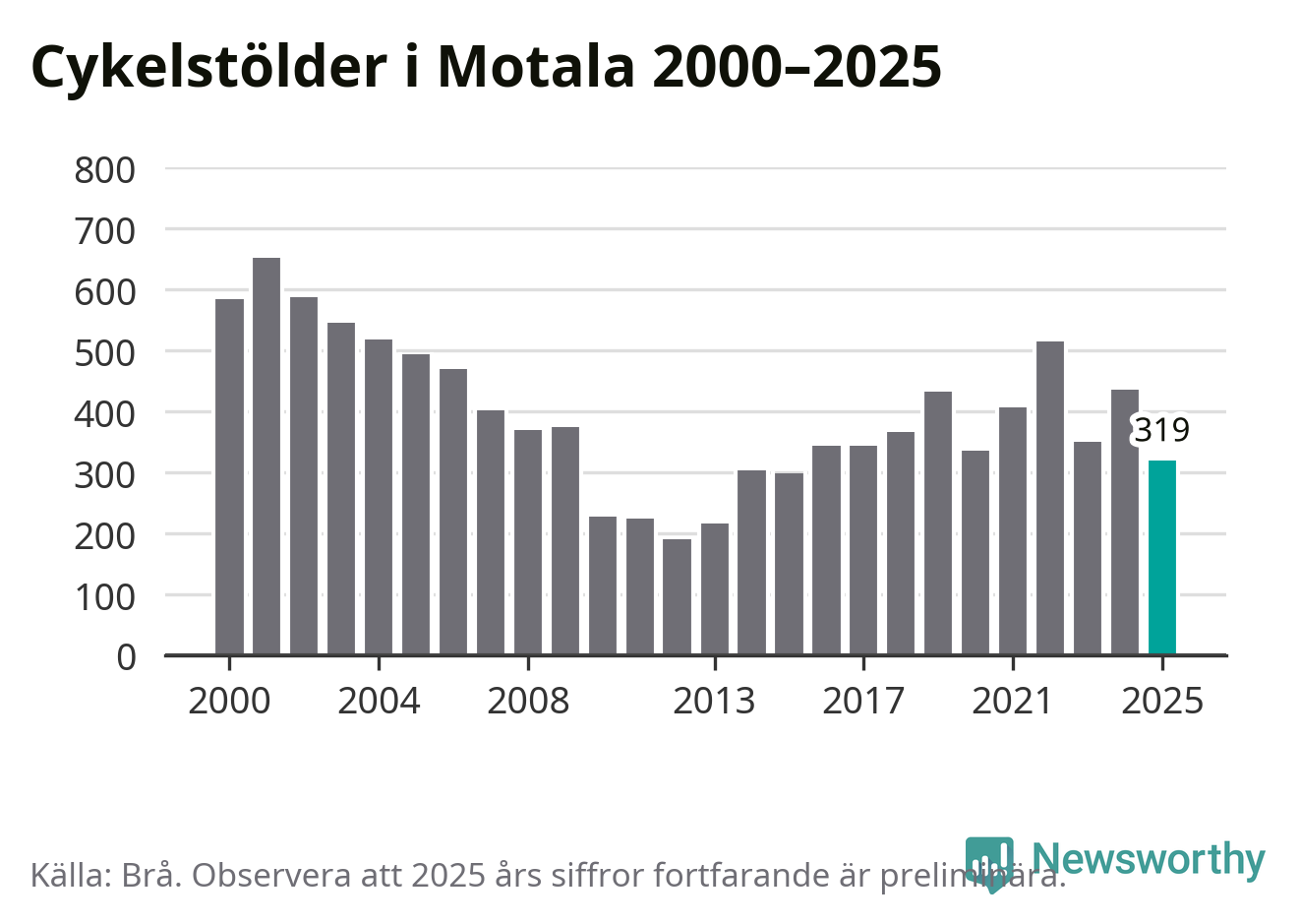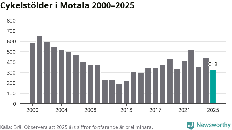 2025 gjordes 319 anmälningar om cykelstölder i kommunen, enligt siffror från Brottsförebyggande rådet, vilket motsvarar 7,3 anmälningar per 1 000 invånare. Det är flest i Östergötland.