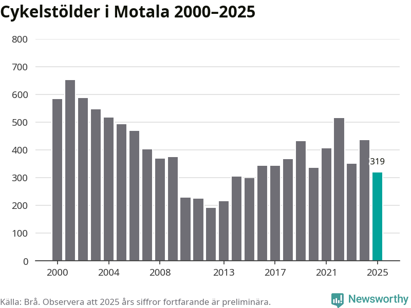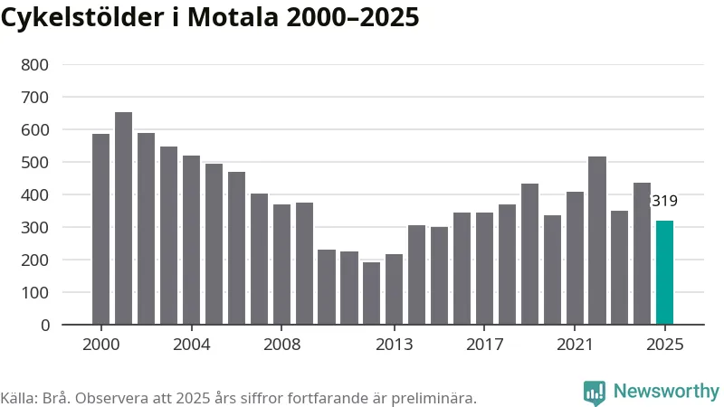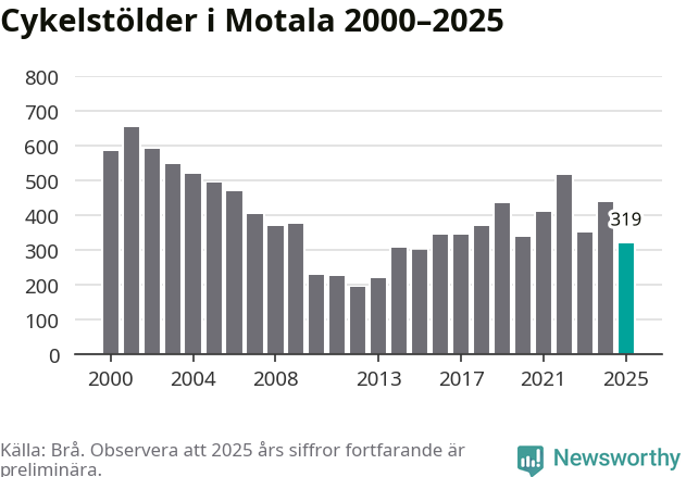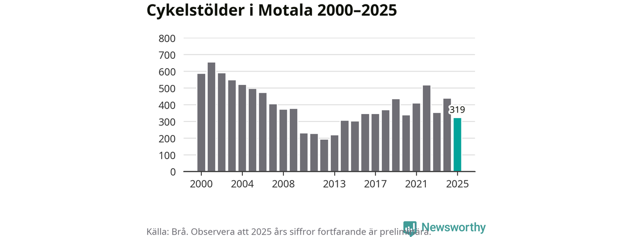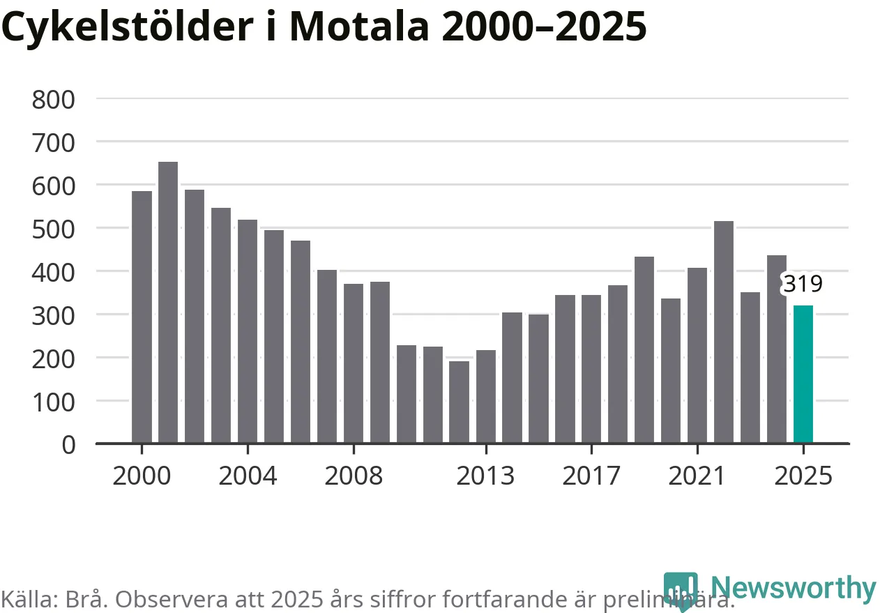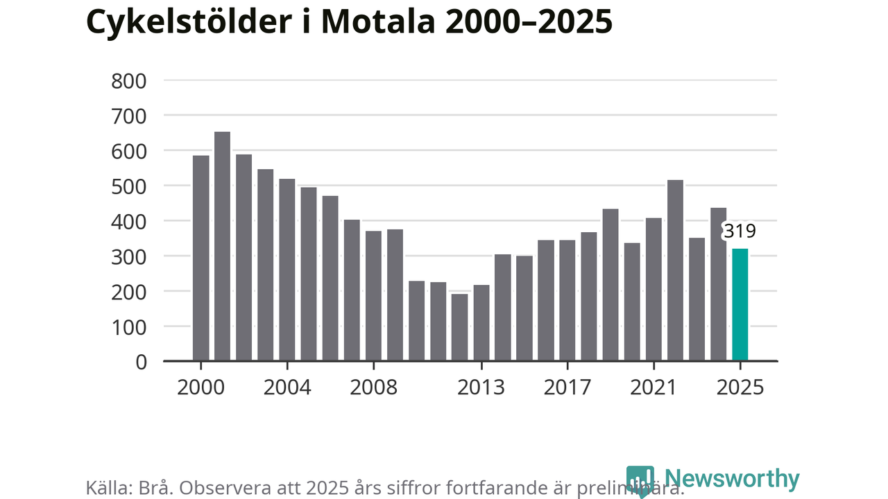 Av de 319 stöldanmälningar i Motala 2025 gällde 98 elcyklar, det motsvarar 31 procent. Brå särredovisar elcyklar sedan 2020 och i riket som helhet ökade anmälningarna om stulna elcyklar kraftigt de första åren, för att de senaste tre åren ha legat relativt stilla. Eftersom antalet cykelstölder totalt har minskat under samma tid har andelen elcyklar ökat. I fjol stod elcyklar för 28 procent av alla anmälda cykelstölder i landet.