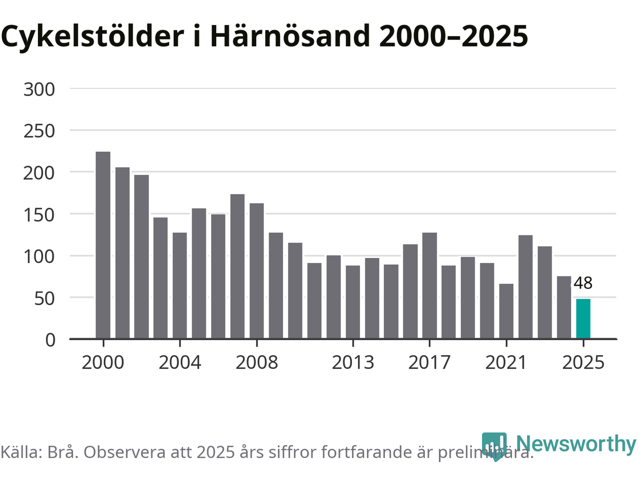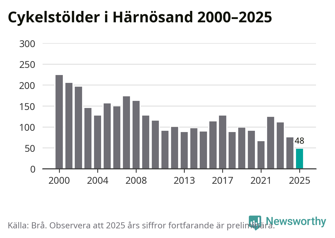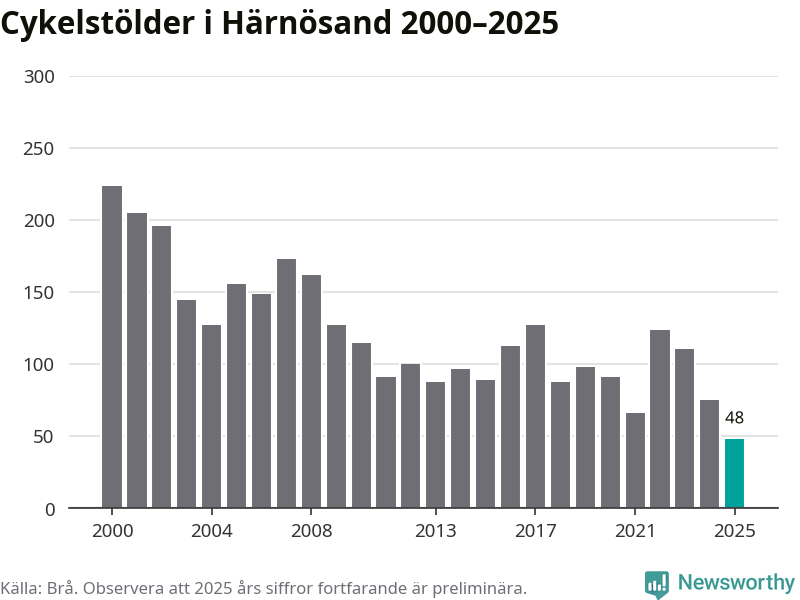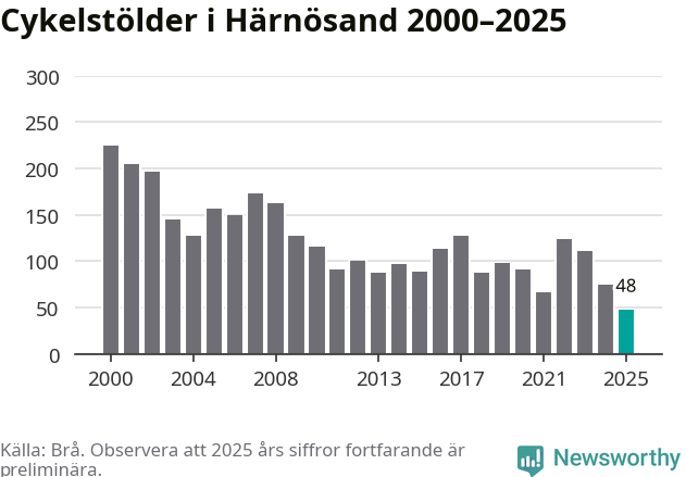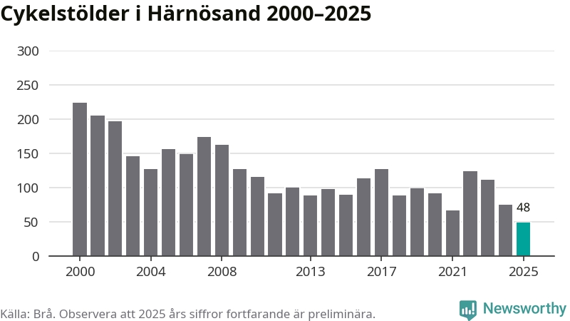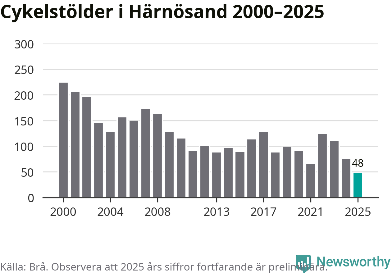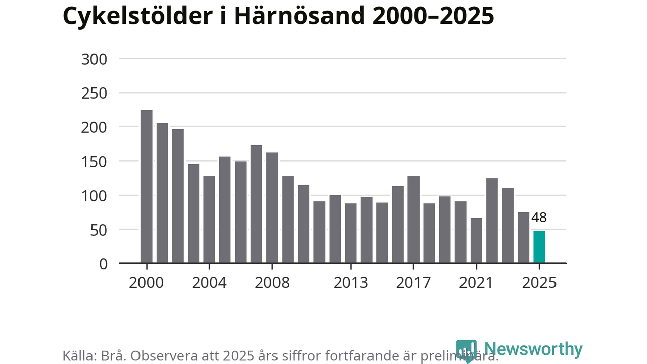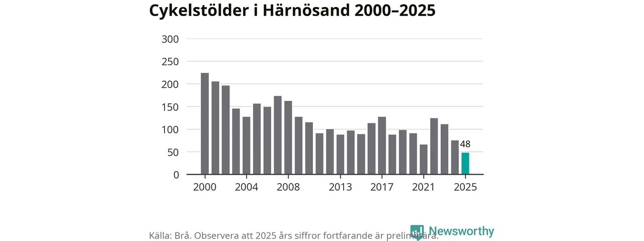 I Härnösands kommun noterades det lägsta antalet cykelstölder under hela 2000-talet år 2025, även om det fortfarande är preliminära siffror. Under de senaste 25 åren har det som mest anmälts 224 cykelstölder på ett år (2000).
