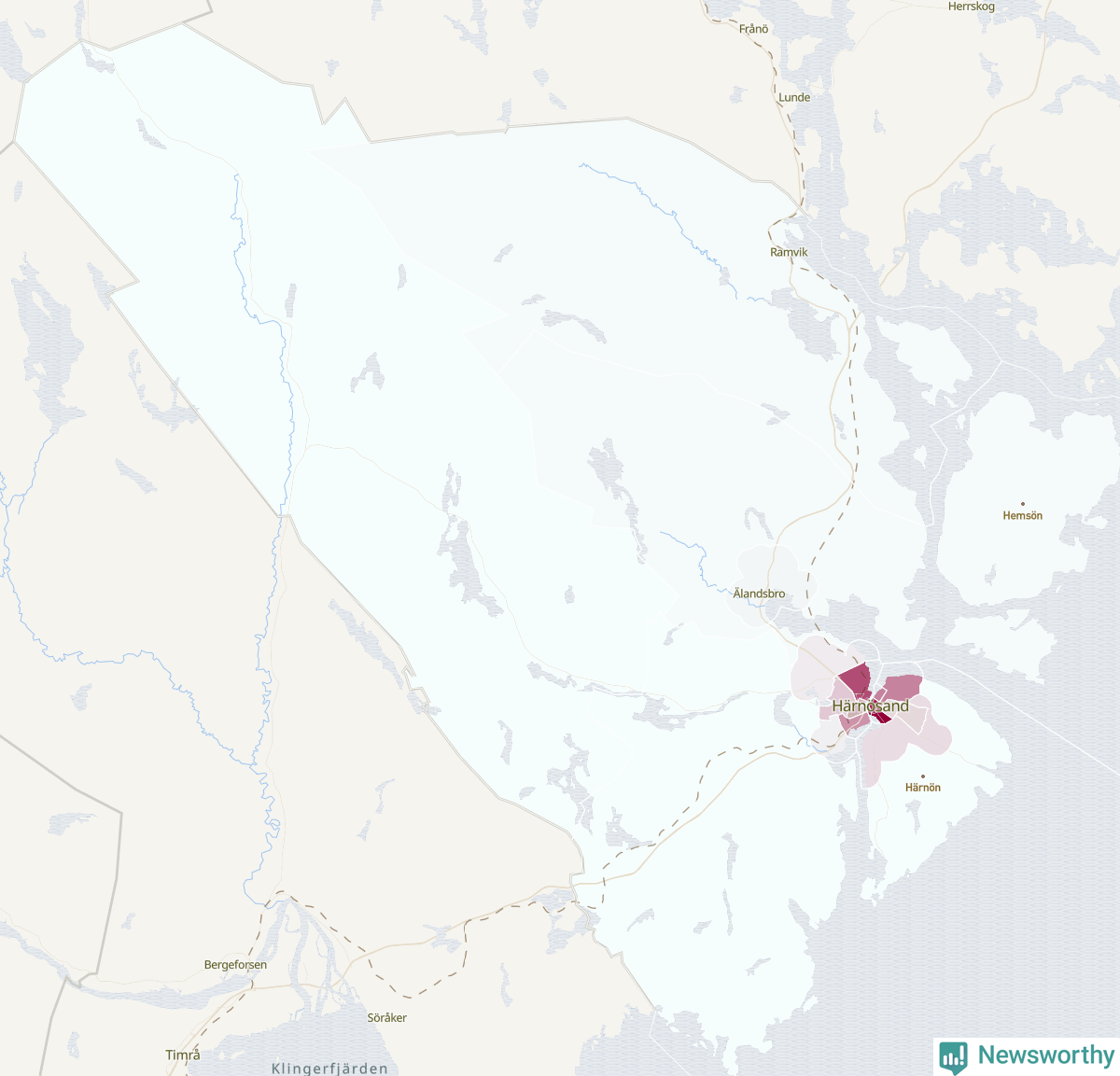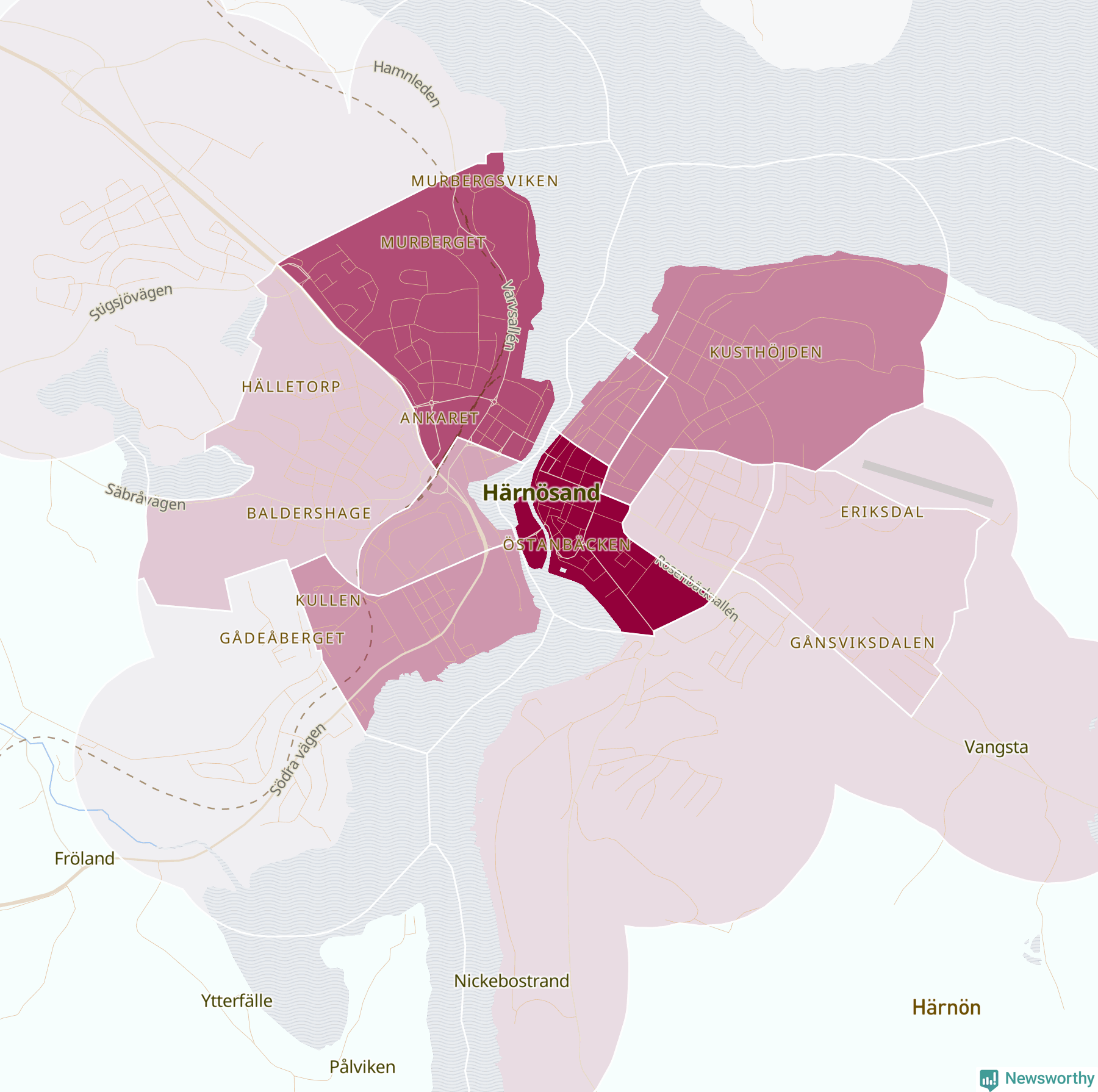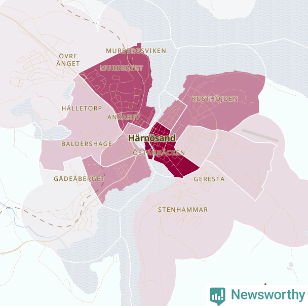 Men alla delar av Härnösand är inte lika hårt drabbade. Det visar data för de senaste fem åren, som Newsworthy har begärt ut från polisen. De anmälda stölderna har kopplats till SCB:s 17 statistiska områden i kommunen. Det rör sig om mellan en handfull och ett sjuttiotal anmälda stölder per område.