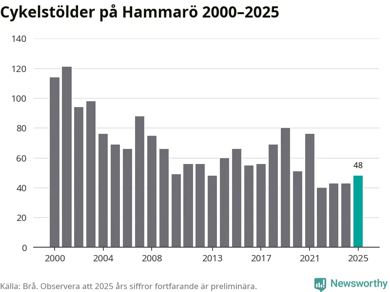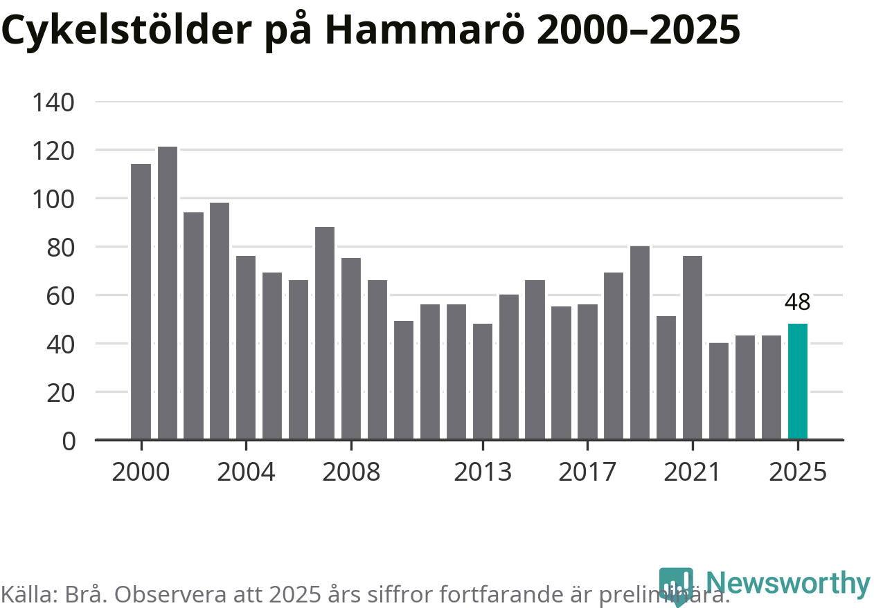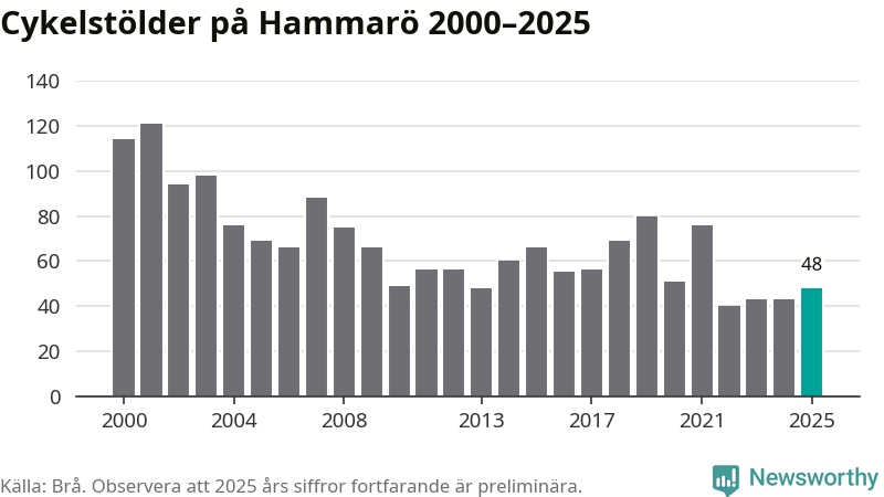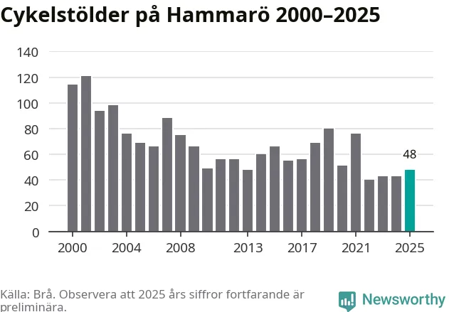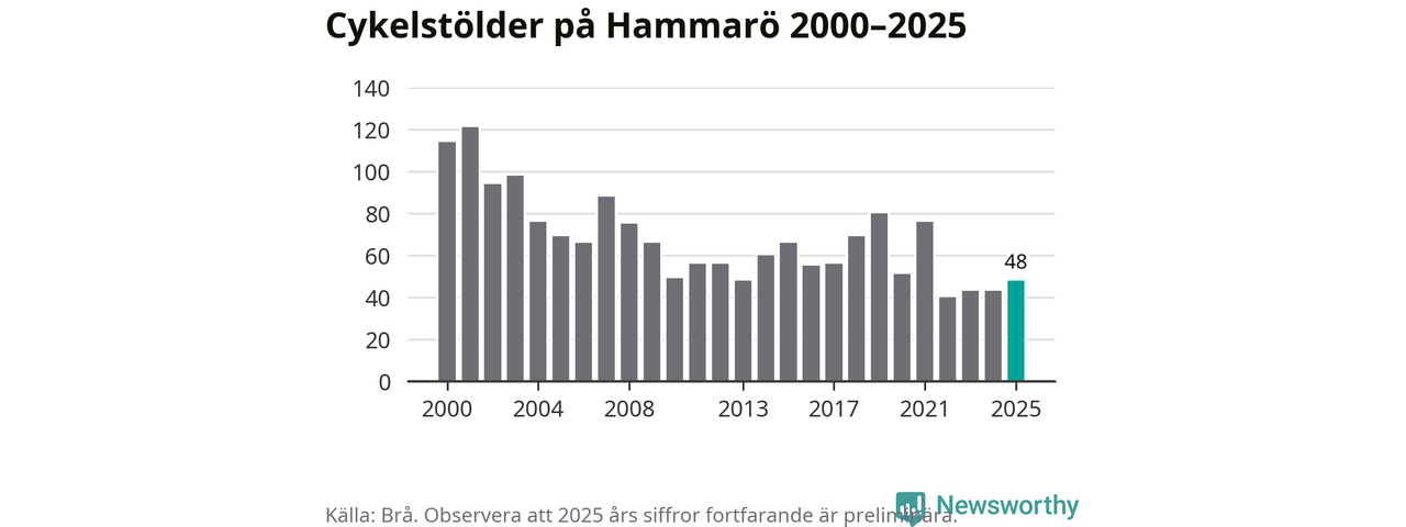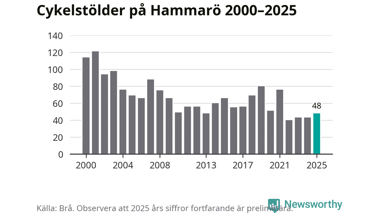 På Hammarö var antalet cykelstölder relativt få i en historisk kontext år 2025, även om det fortfarande är preliminära siffror. Under de senaste 25 åren har det som mest anmälts 121 cykelstölder på ett år (2001), som minst 40 stycken (2022).