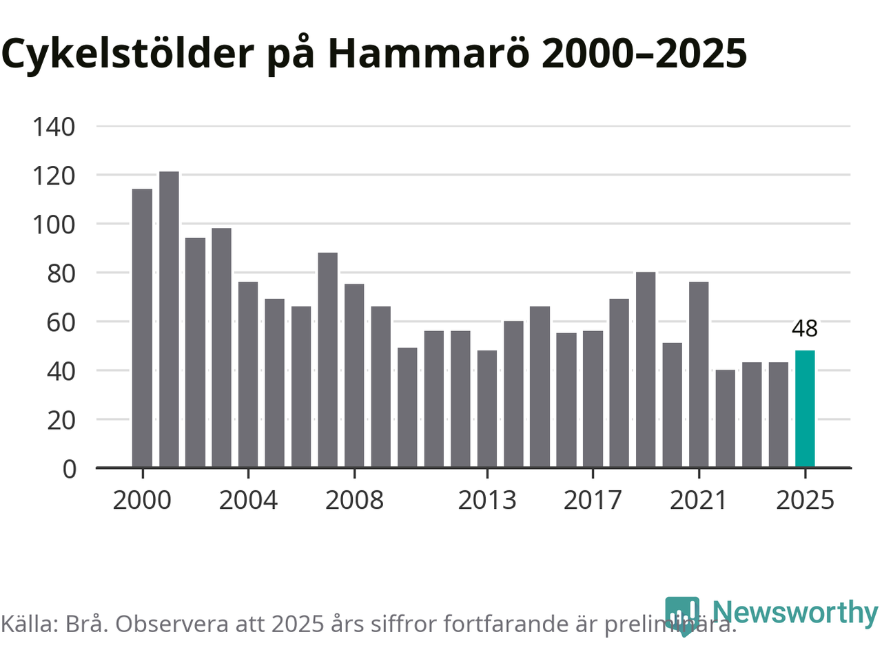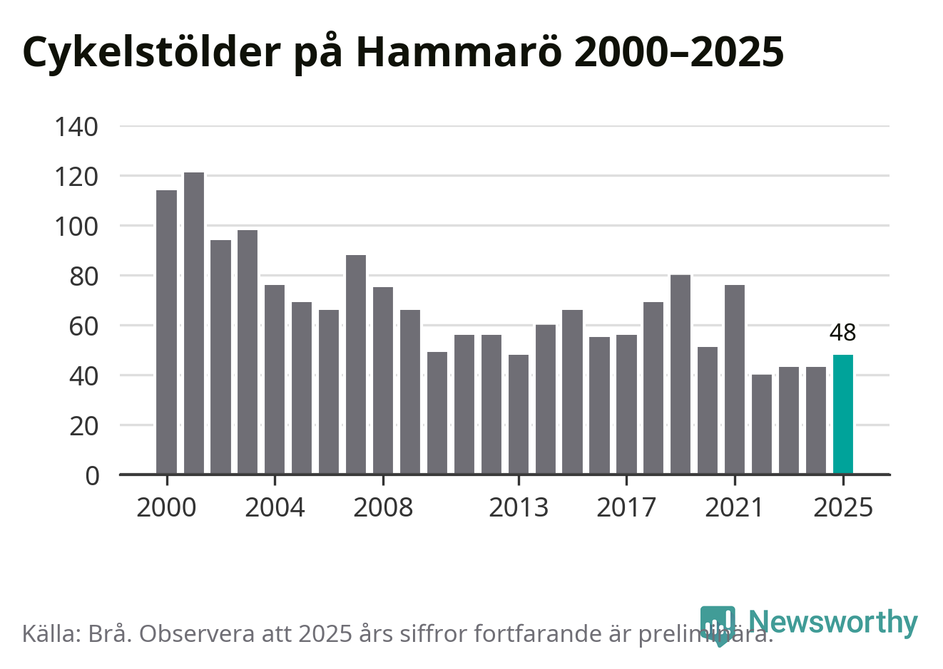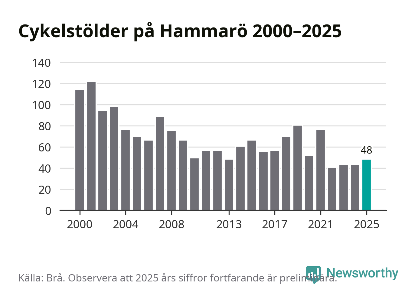 På Hammarö var antalet cykelstölder relativt få i en historisk kontext år 2025, även om det fortfarande är preliminära siffror. Under de senaste 25 åren har det som mest anmälts 121 cykelstölder på ett år (2001), som minst 40 stycken (2022).