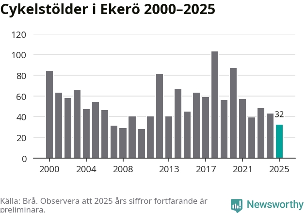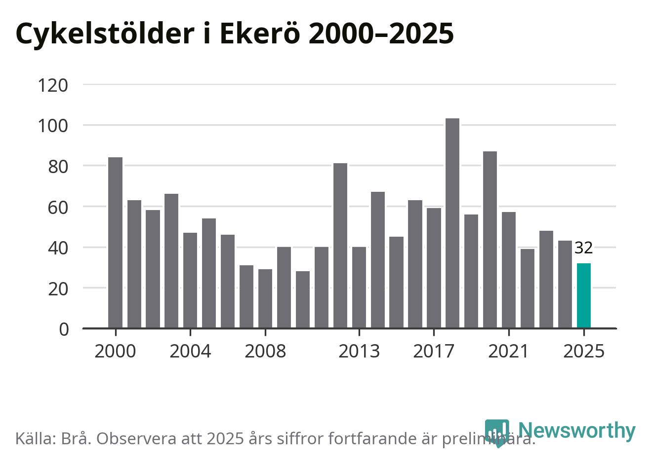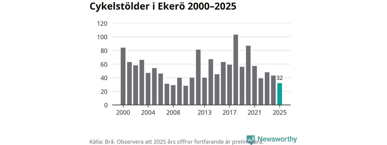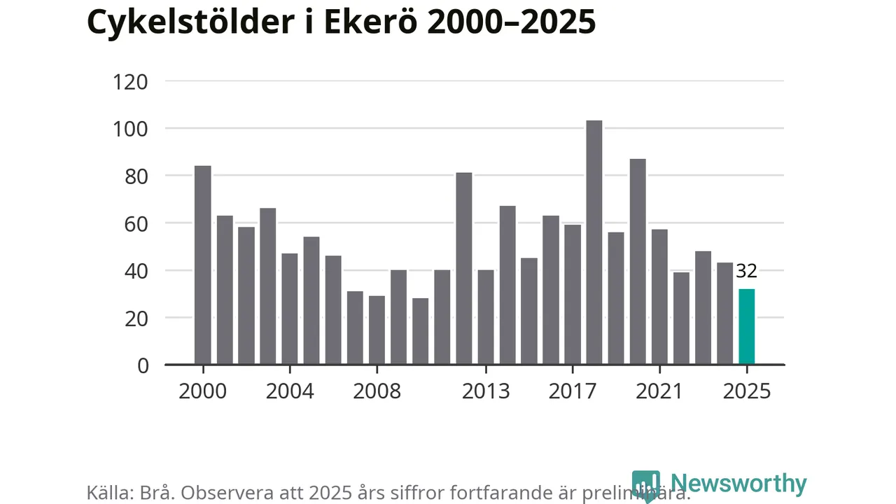 I Ekerö kommun var antalet cykelstölder relativt få i en historisk kontext år 2025, även om det fortfarande är preliminära siffror. Under de senaste 25 åren har det som mest anmälts 103 cykelstölder på ett år (2018), som minst 28 stycken (2010).