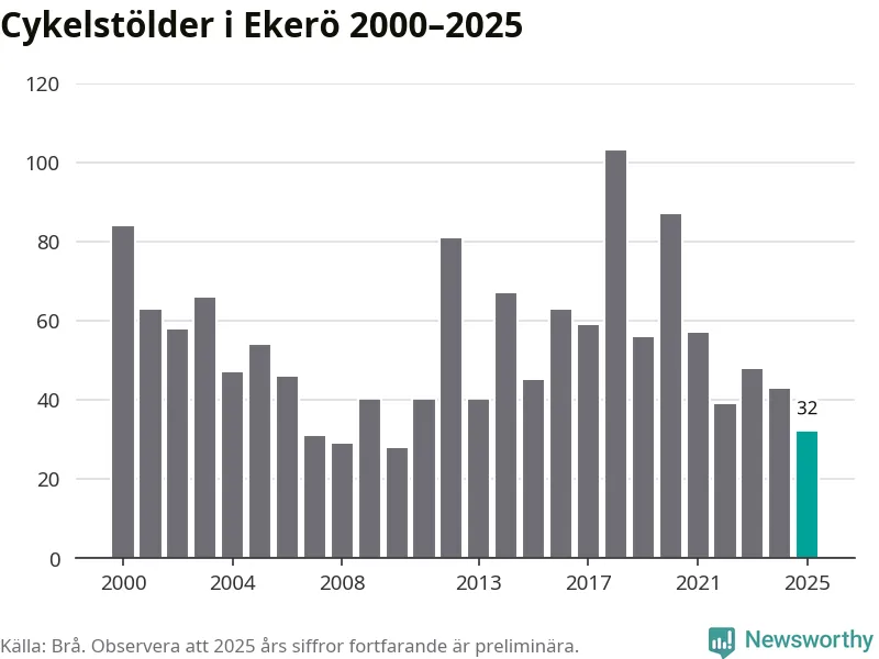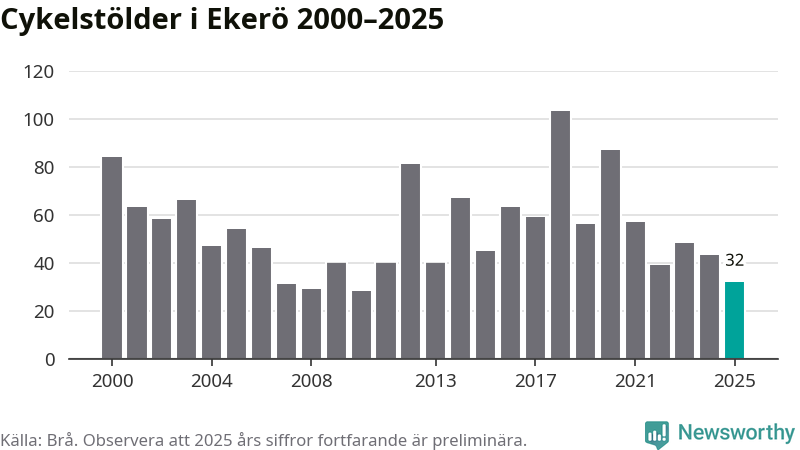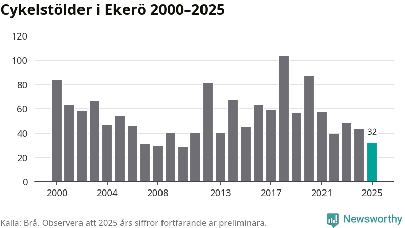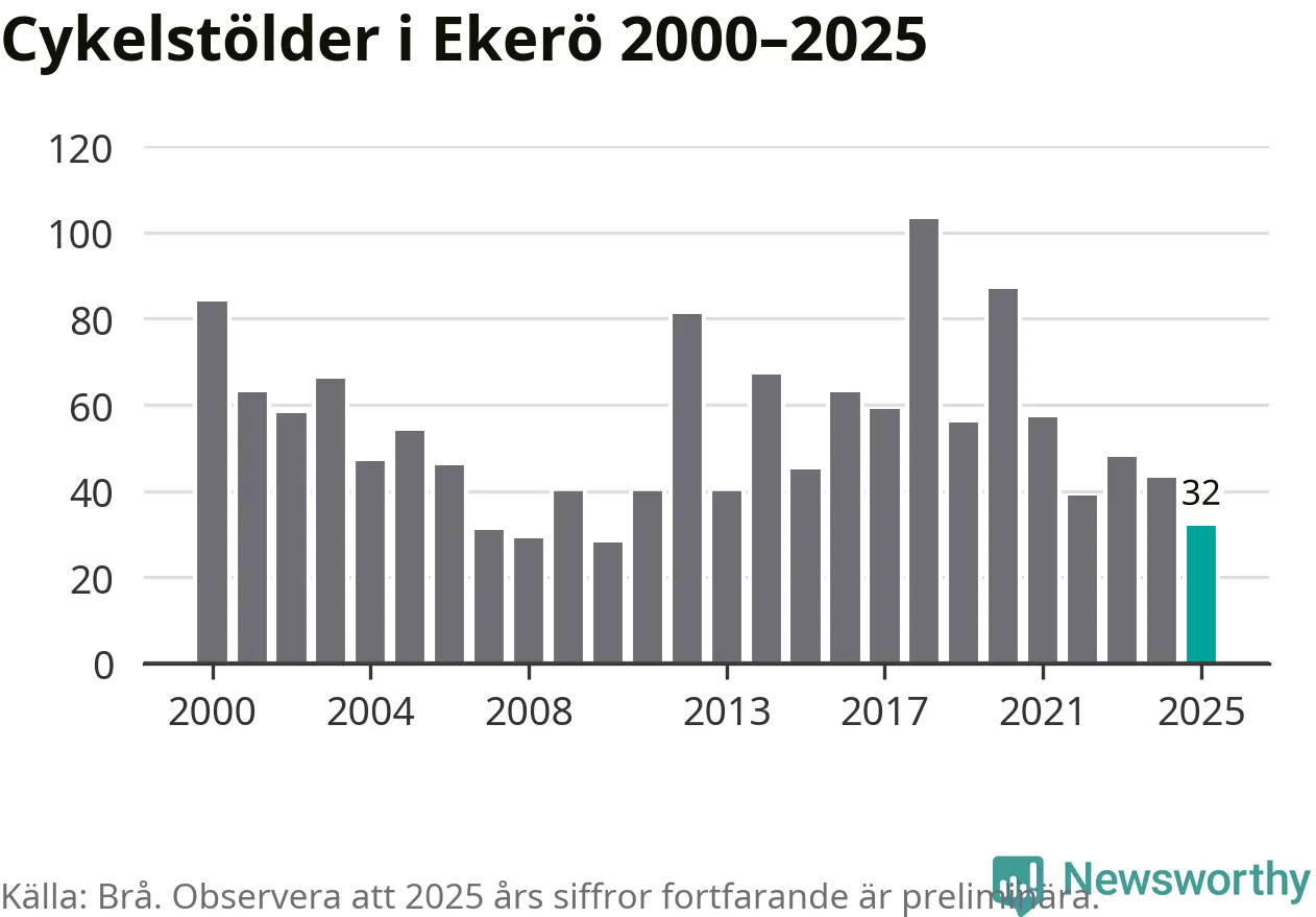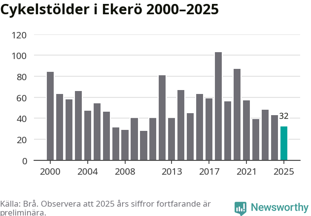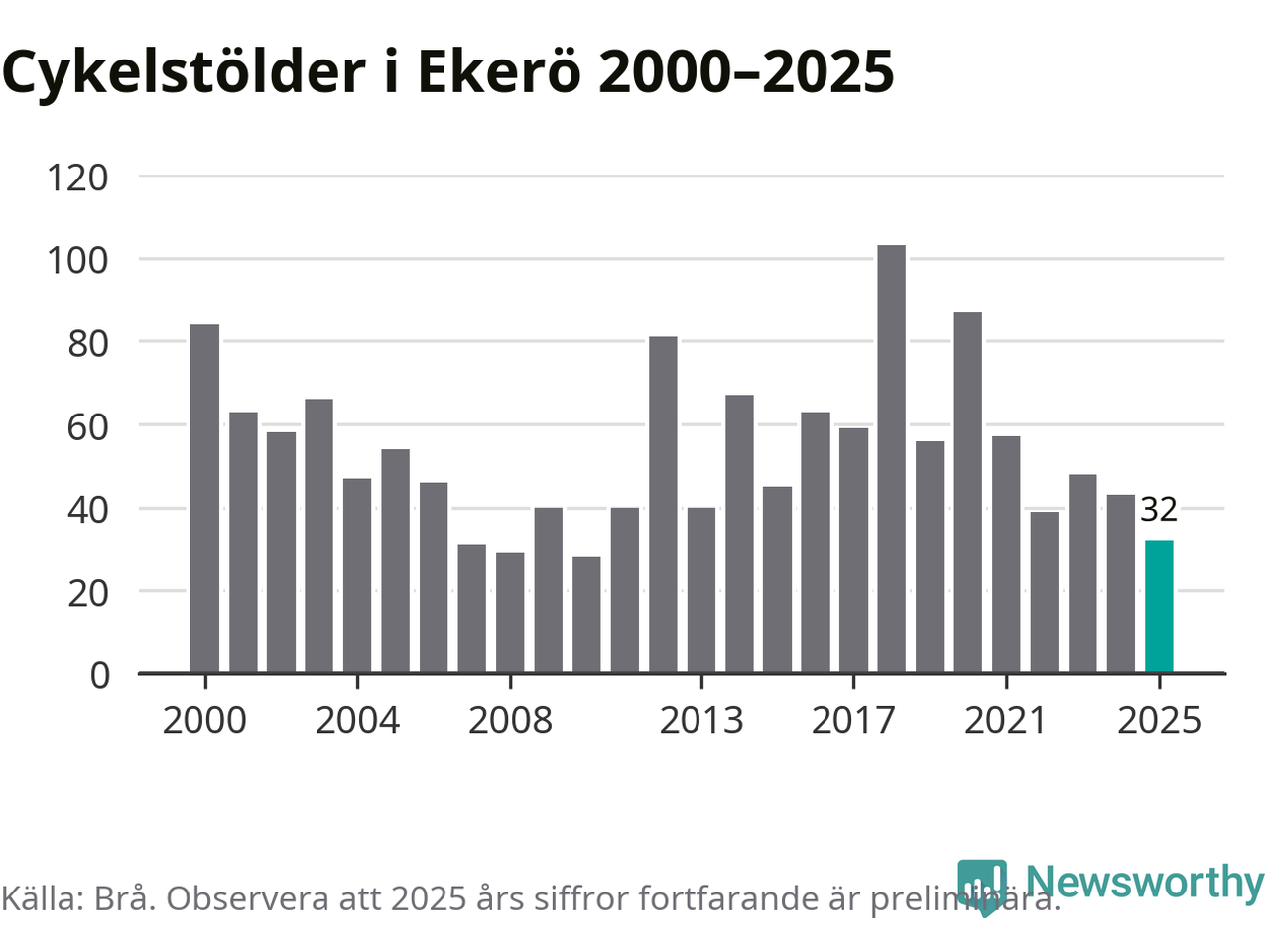 I Ekerö kommun var antalet cykelstölder relativt få i en historisk kontext år 2025, även om det fortfarande är preliminära siffror. Under de senaste 25 åren har det som mest anmälts 103 cykelstölder på ett år (2018), som minst 28 stycken (2010).