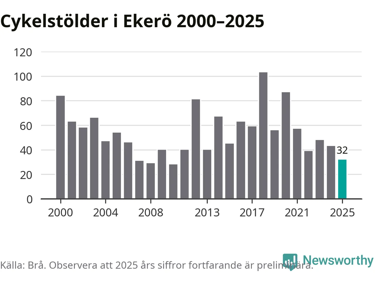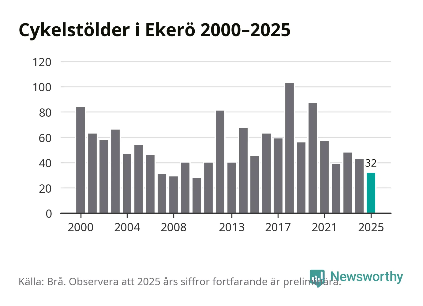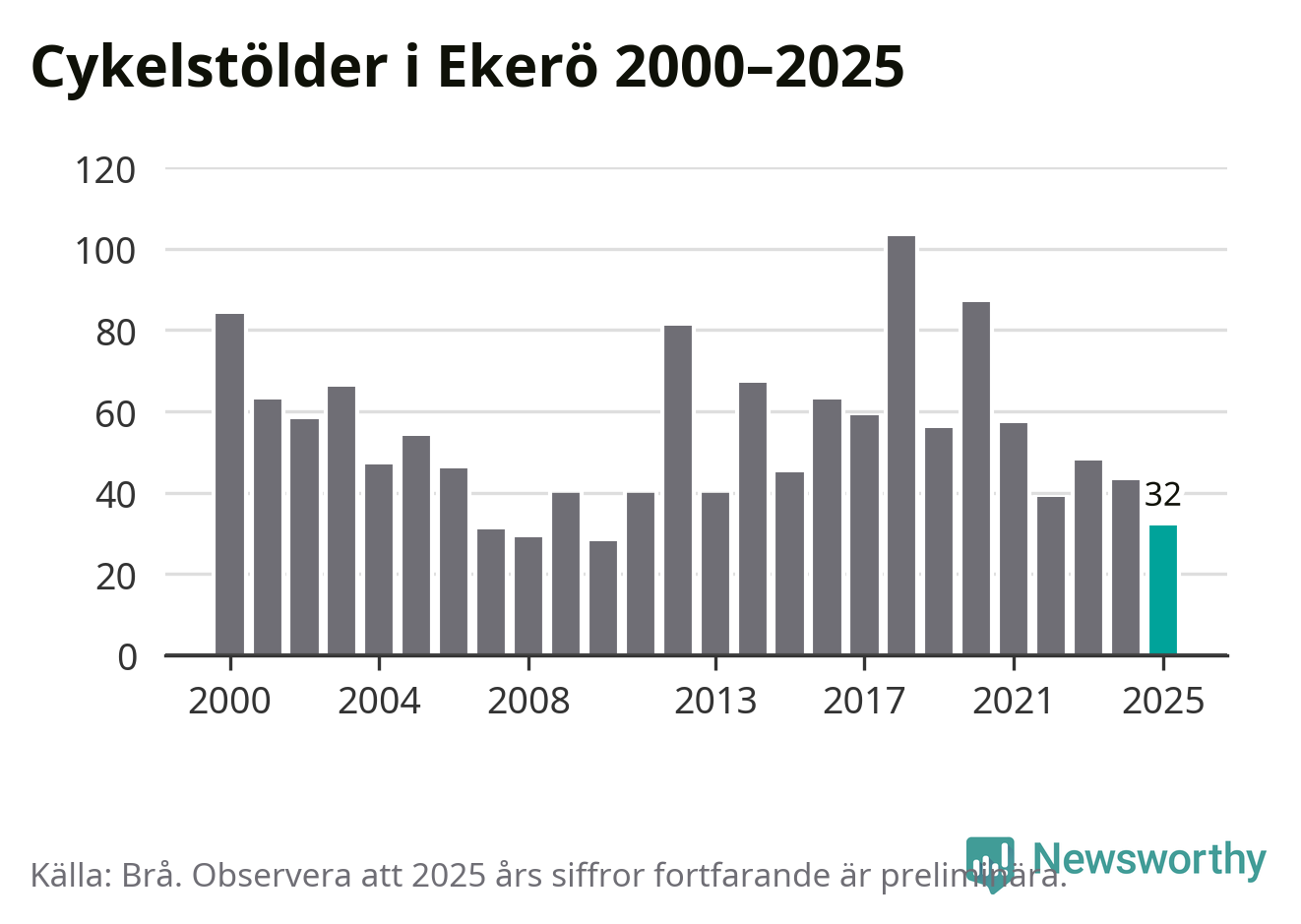 Av de 32 stöldanmälningar i Ekerö 2025 gällde åtta elcyklar, det motsvarar 25 procent. Brå särredovisar elcyklar sedan 2020 och i riket som helhet ökade anmälningarna om stulna elcyklar kraftigt de första åren, för att de senaste tre åren ha legat relativt stilla. Eftersom antalet cykelstölder totalt har minskat under samma tid har andelen elcyklar ökat. I fjol stod elcyklar för 28 procent av alla anmälda cykelstölder i landet.