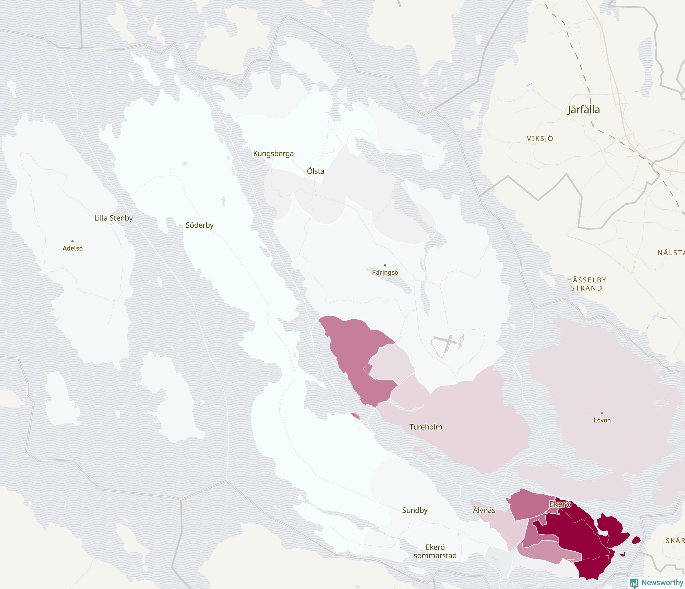 Karta som visar antalet cykelstölder i olika delar av Ekerö, se tabell ovan