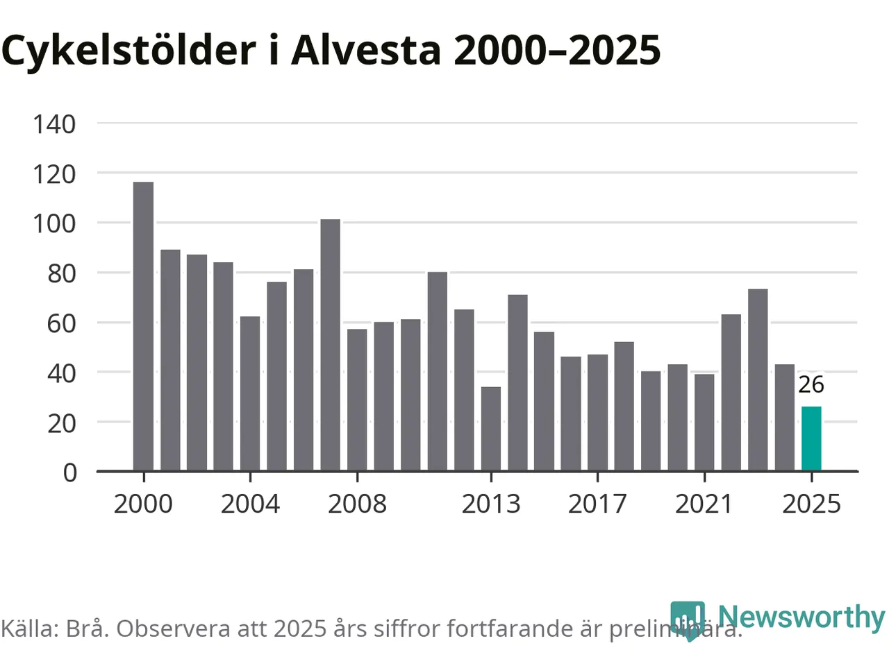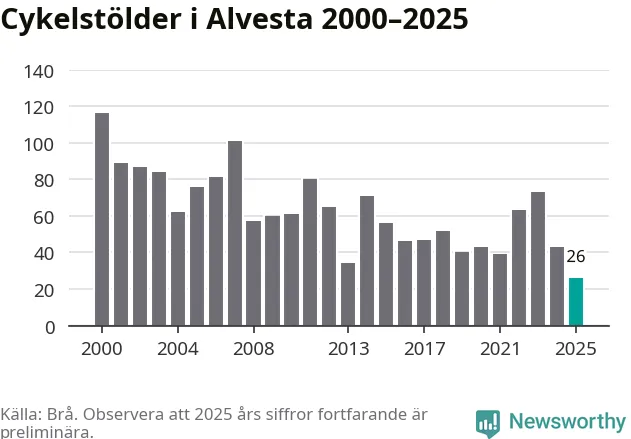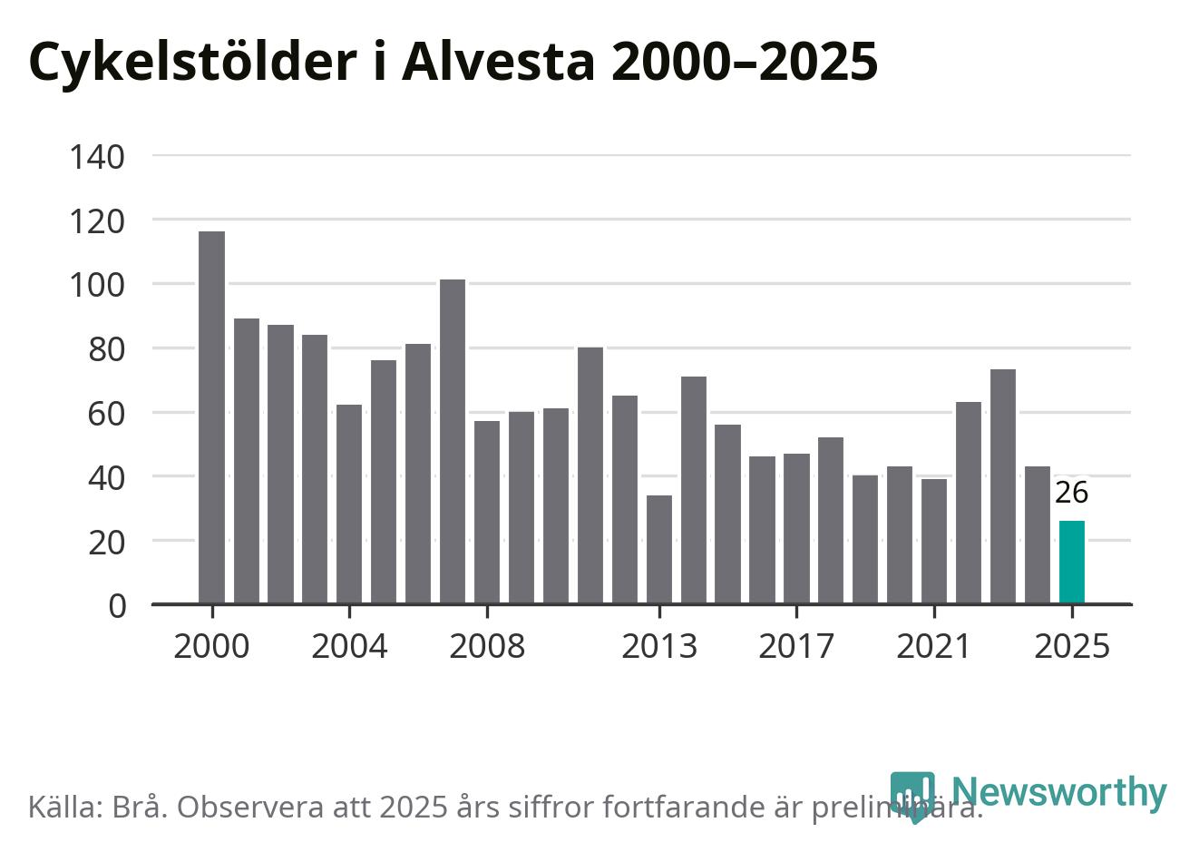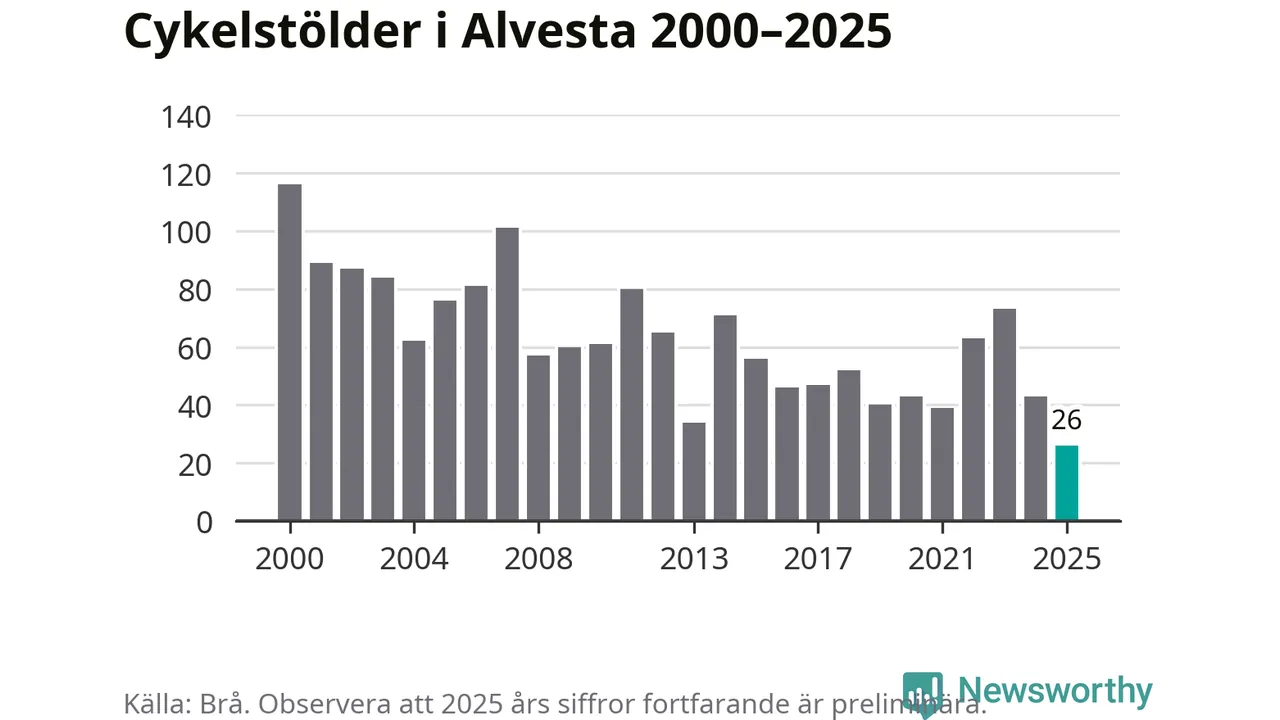 I Alvesta kommun noterades det lägsta antalet cykelstölder under hela 2000-talet år 2025, även om det fortfarande är preliminära siffror. Under de senaste 25 åren har det som mest anmälts 116 cykelstölder på ett år (2000).