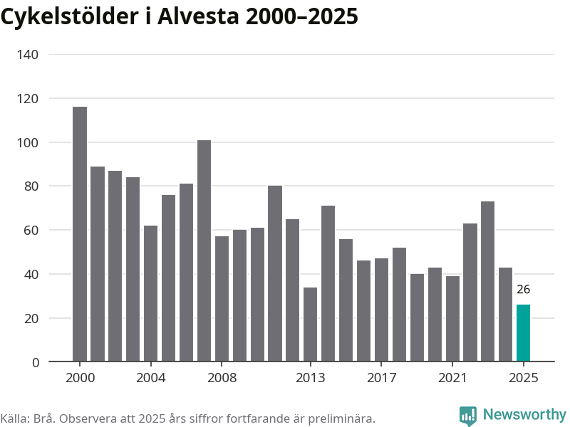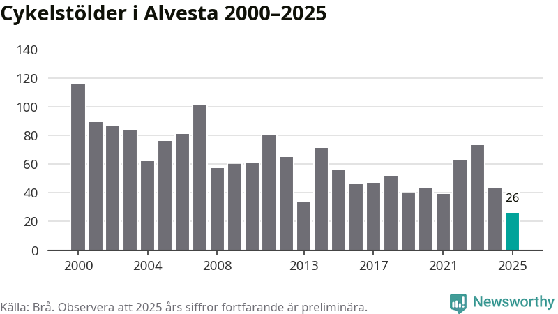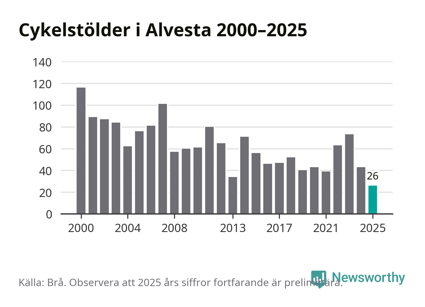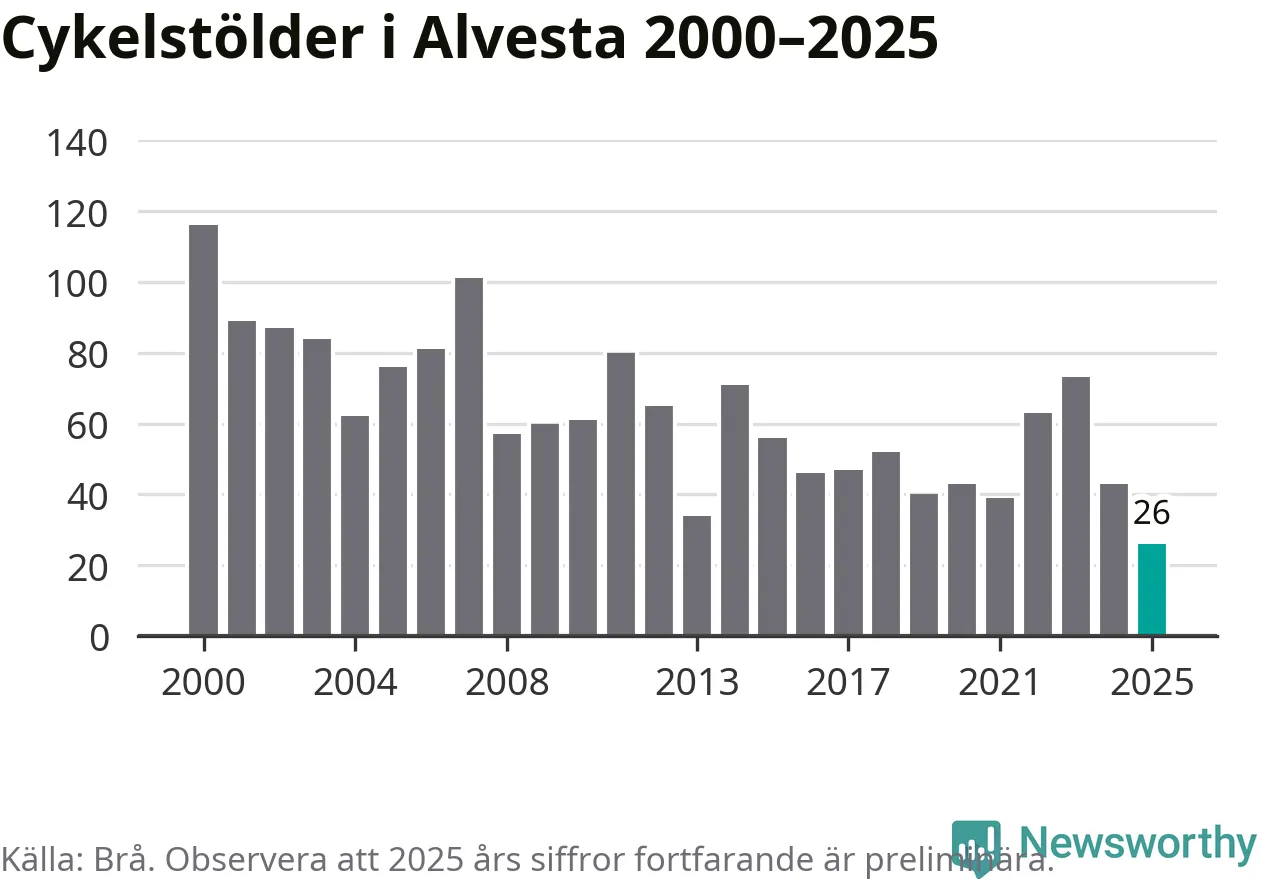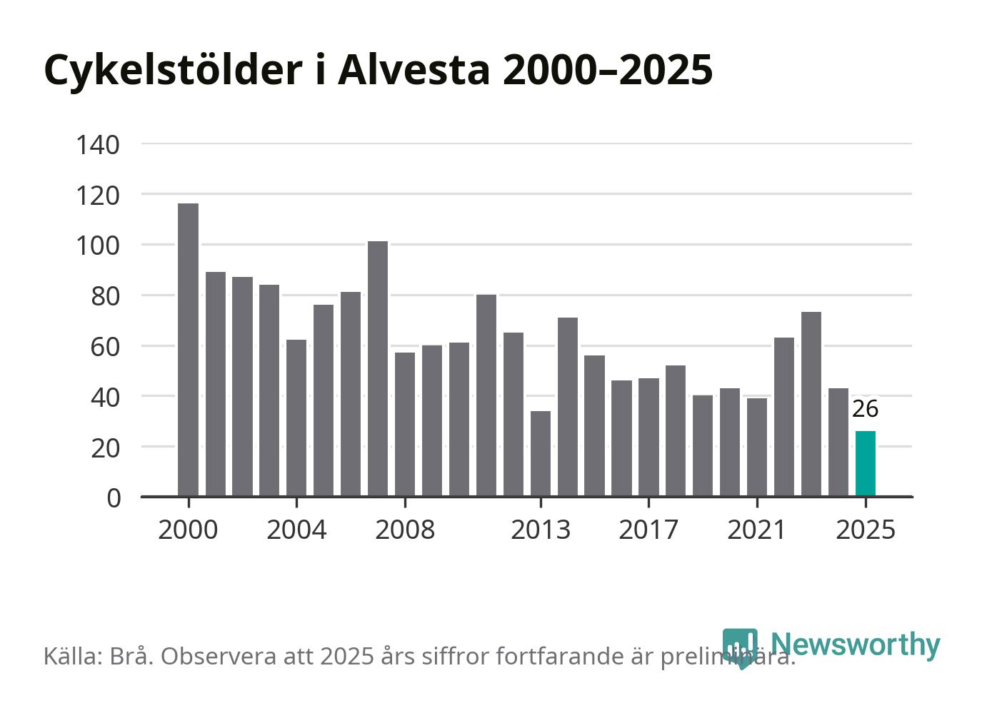 I Alvesta kommun noterades det lägsta antalet cykelstölder under hela 2000-talet år 2025, även om det fortfarande är preliminära siffror. Under de senaste 25 åren har det som mest anmälts 116 cykelstölder på ett år (2000).