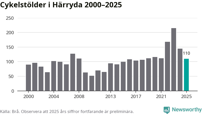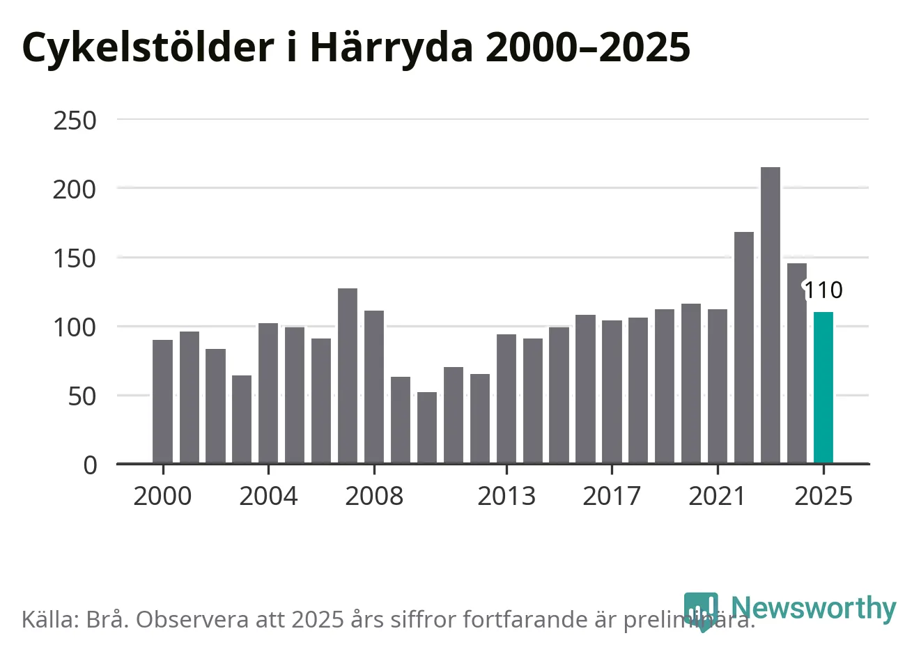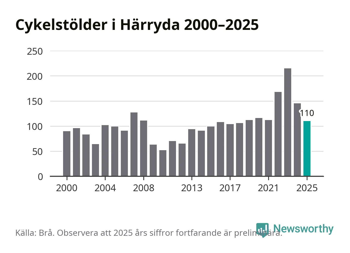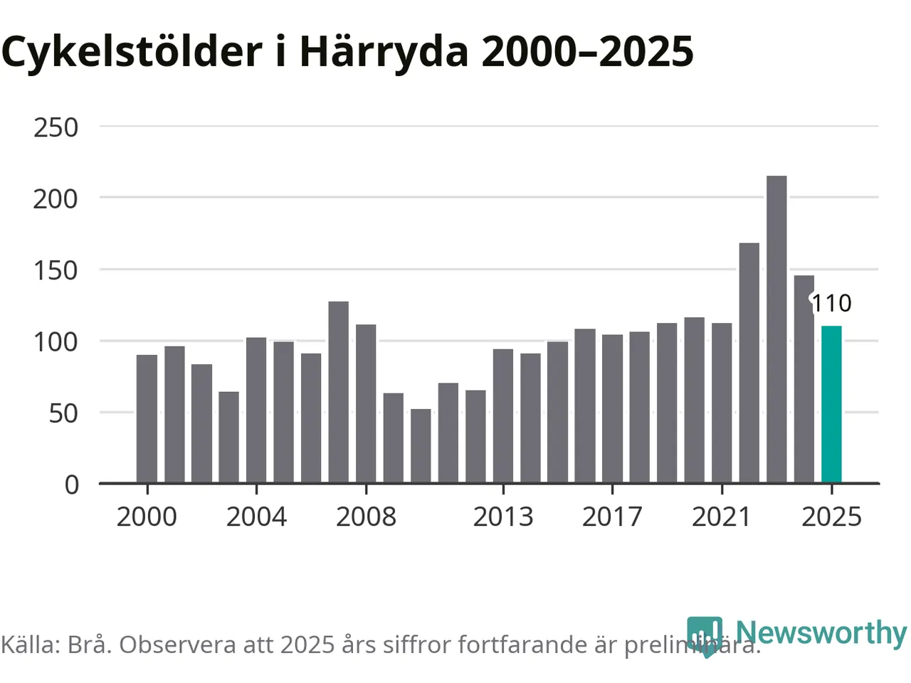 I Härryda kommun var antalet cykelstölder det lägsta sedan 2018. Under de senaste 25 åren har det som mest anmälts 215 cykelstölder på ett år (2023), som minst 52 stycken (2010).