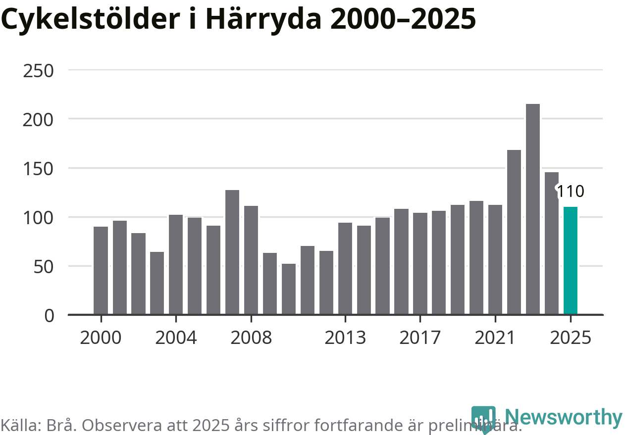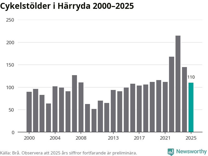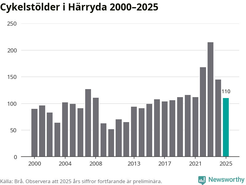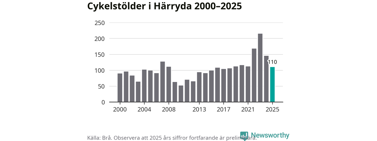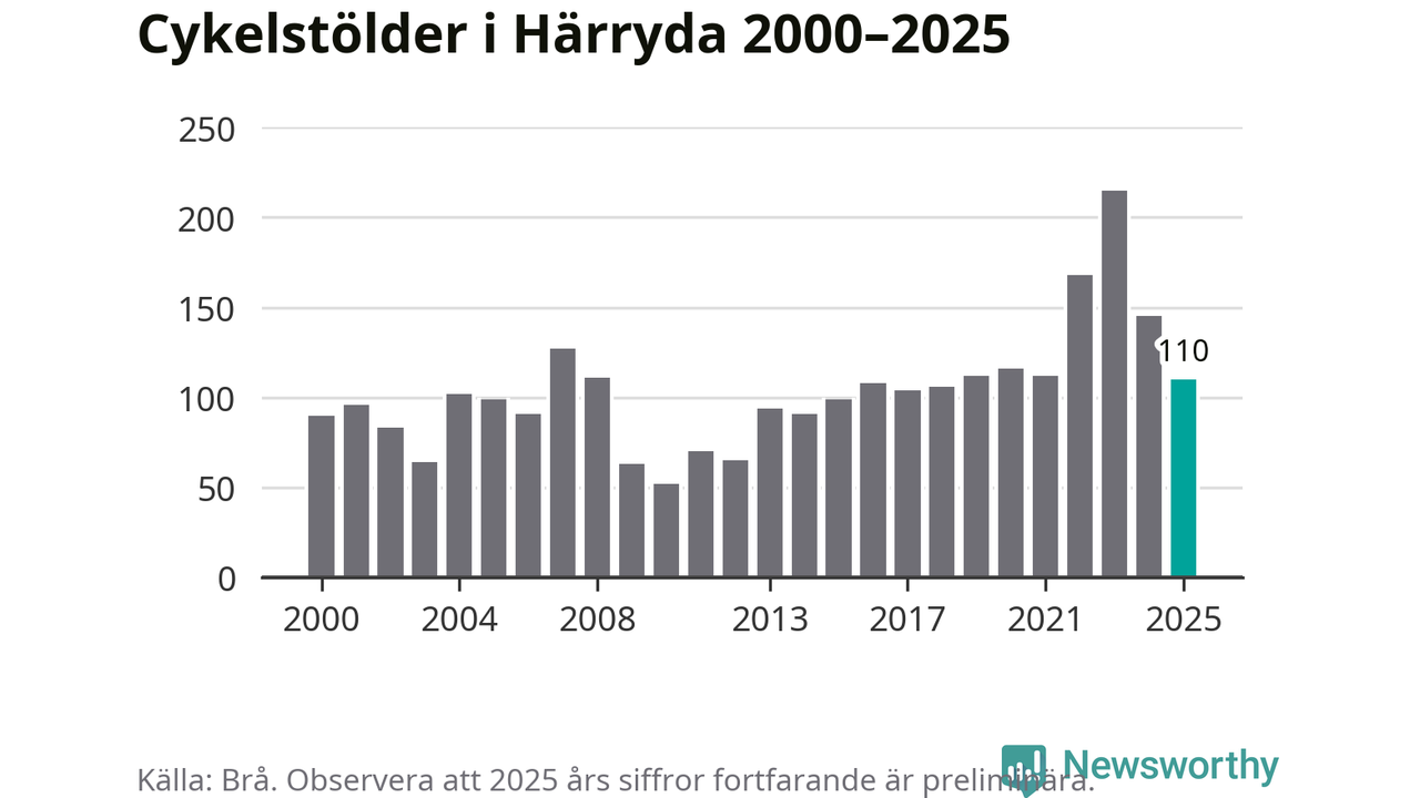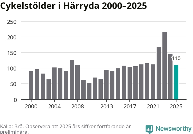 I Härryda kommun var antalet cykelstölder det lägsta sedan 2018. Under de senaste 25 åren har det som mest anmälts 215 cykelstölder på ett år (2023), som minst 52 stycken (2010).