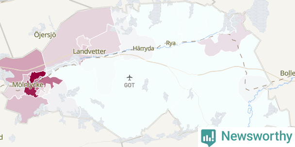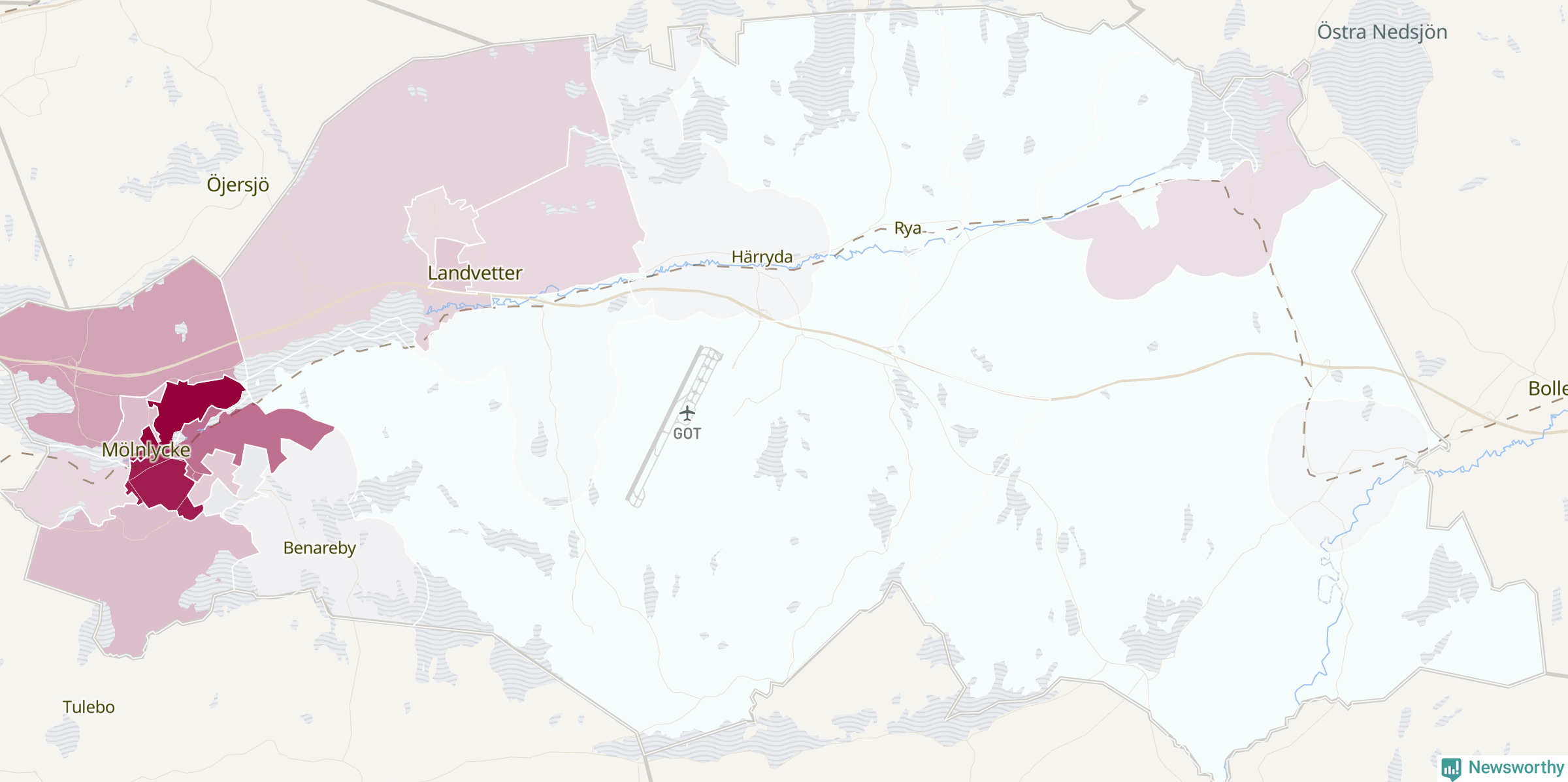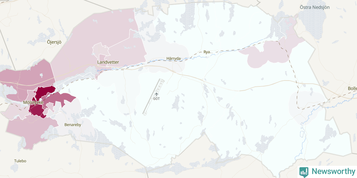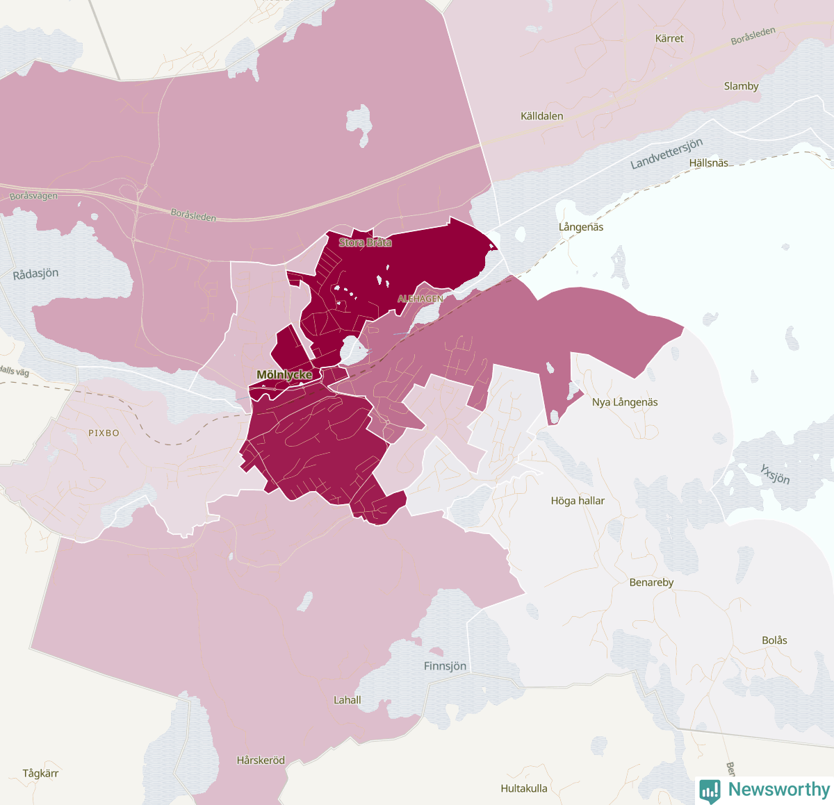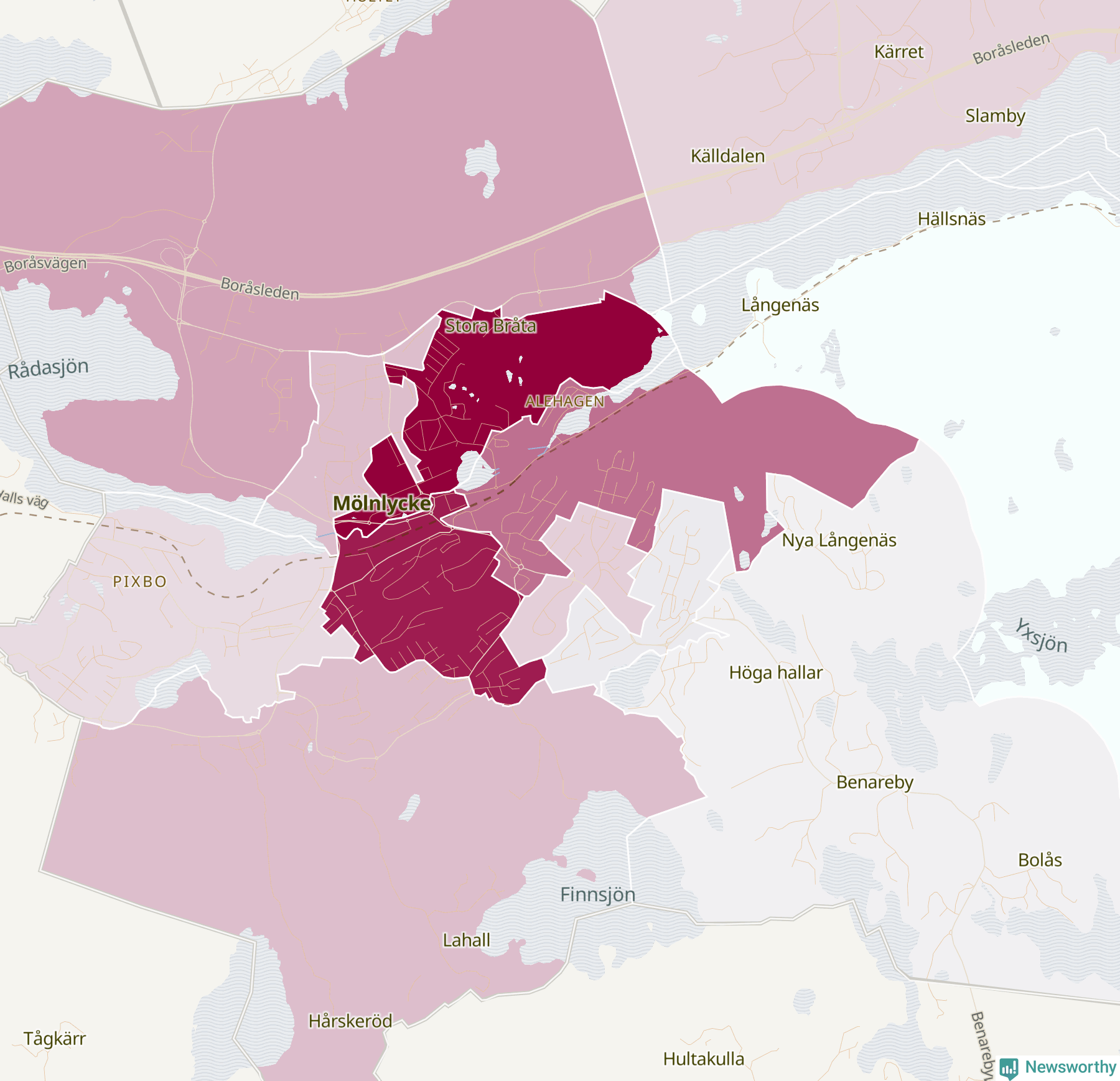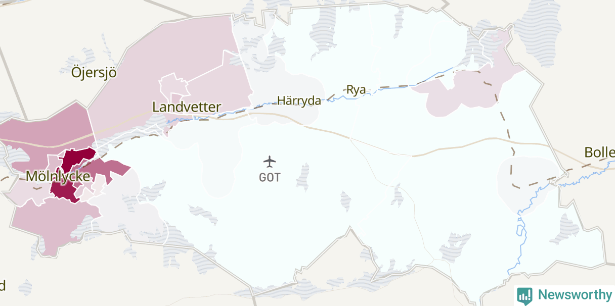 Men alla delar av Härryda är inte lika hårt drabbade. Det visar data för de senaste fem åren, som Newsworthy har begärt ut från polisen. De anmälda stölderna har kopplats till SCB:s 21 statistiska områden i kommunen. Det rör sig om mellan en handfull och drygt 100 anmälda stölder per område.