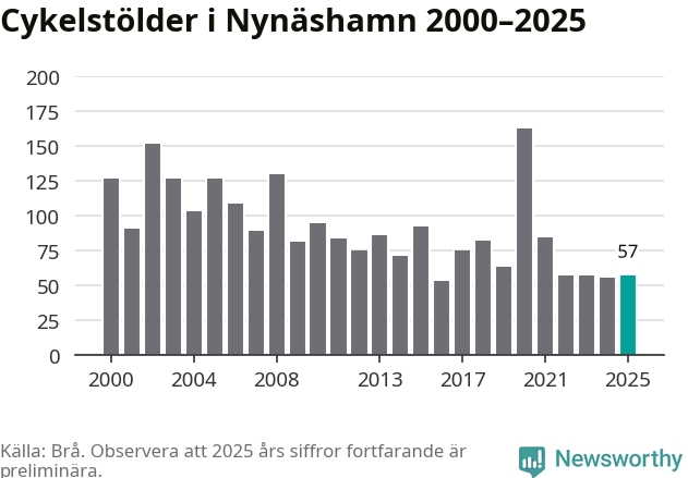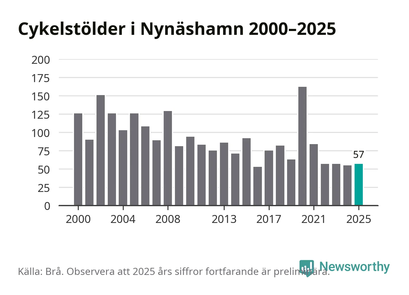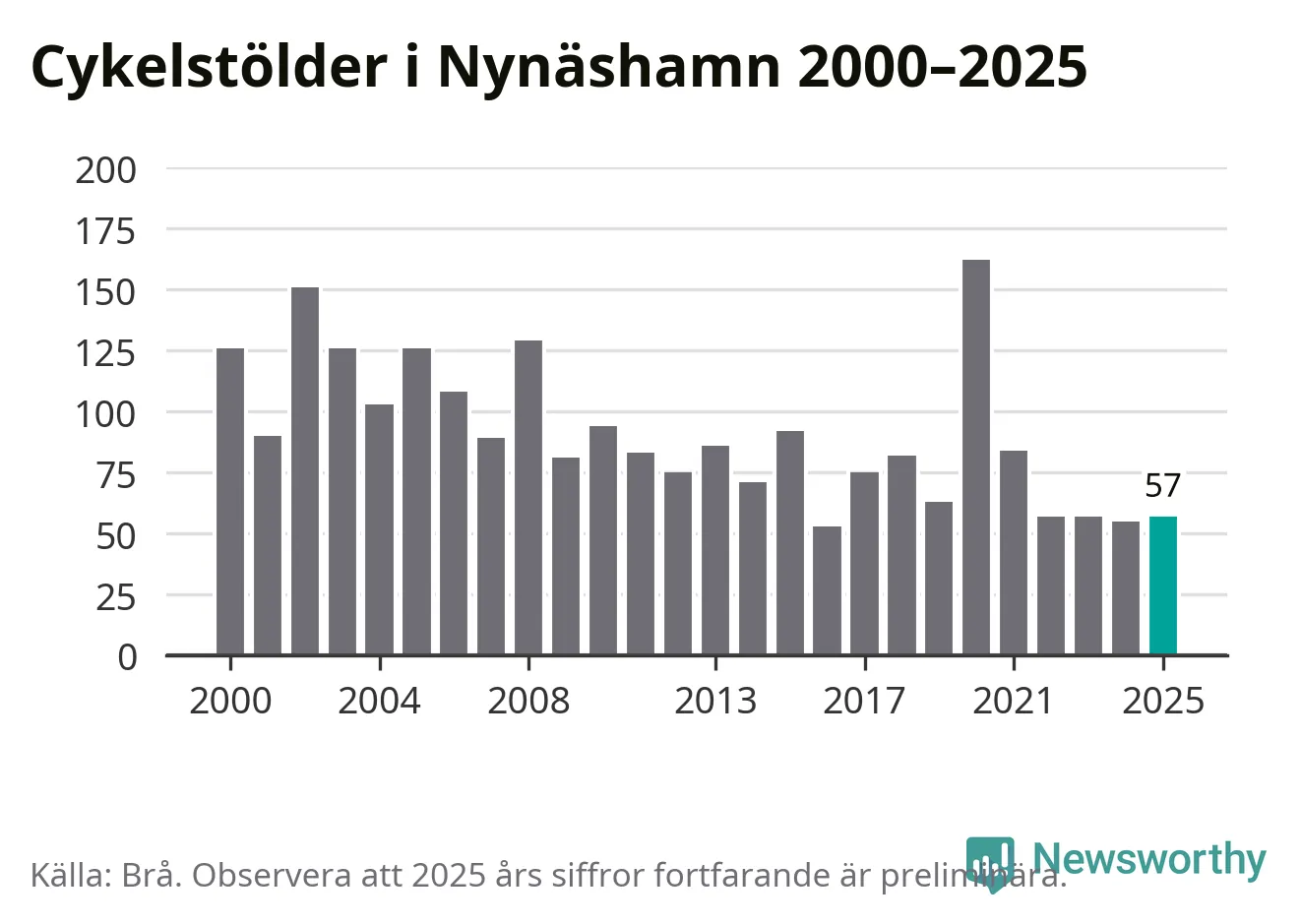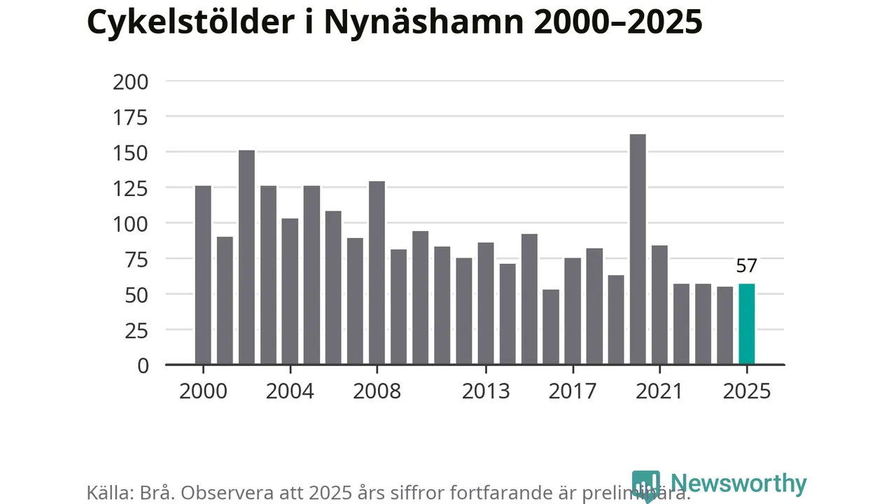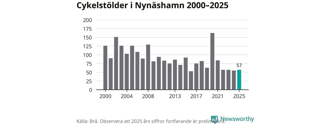 I Nynäshamns kommun var antalet cykelstölder relativt få i en historisk kontext år 2025, även om det fortfarande är preliminära siffror. Under de senaste 25 åren har det som mest anmälts 162 cykelstölder på ett år (2020), som minst 53 stycken (2016).