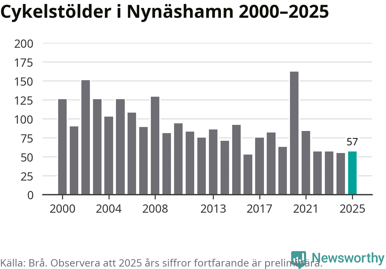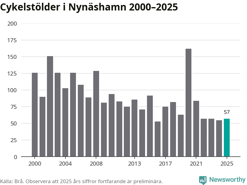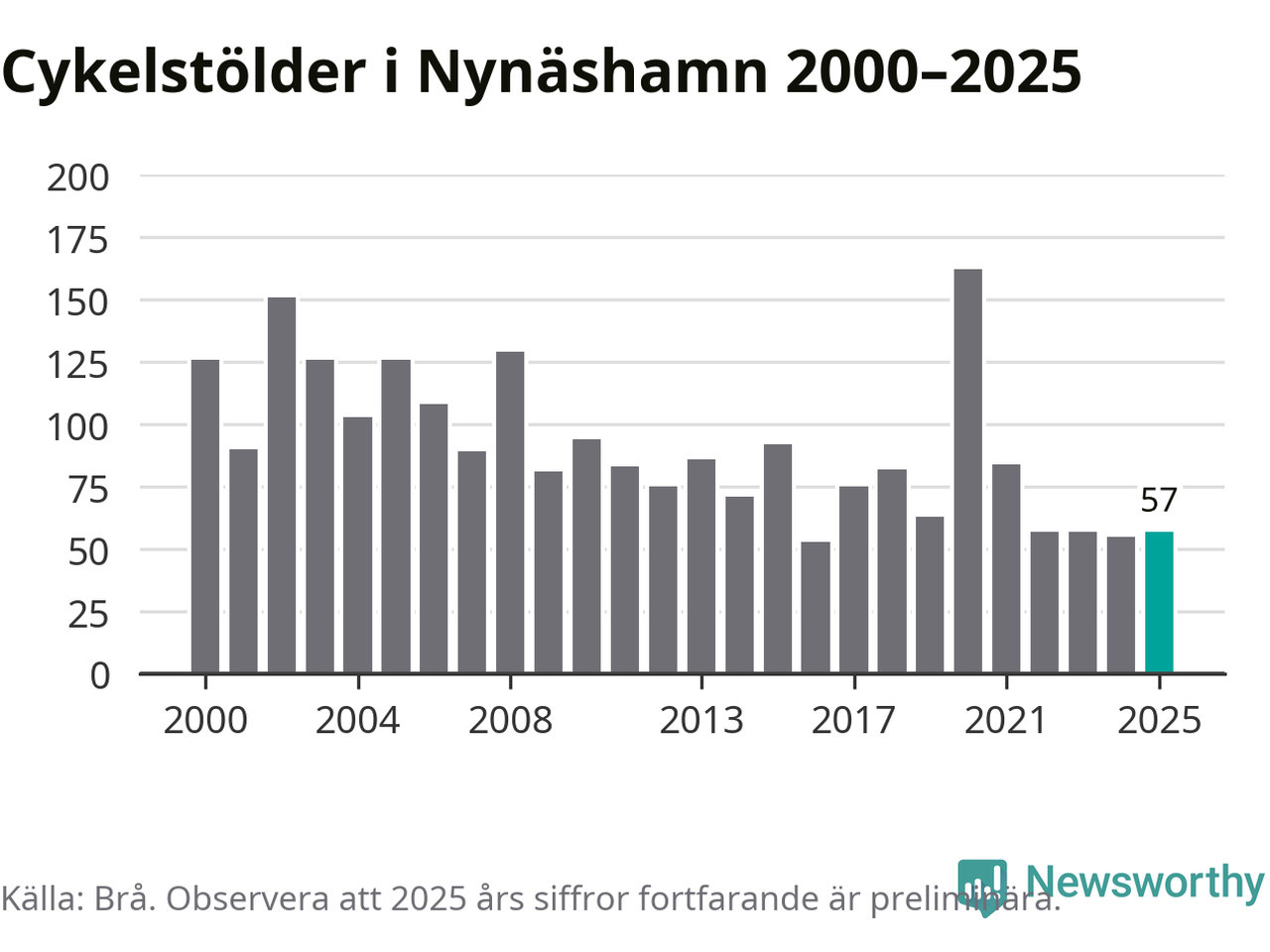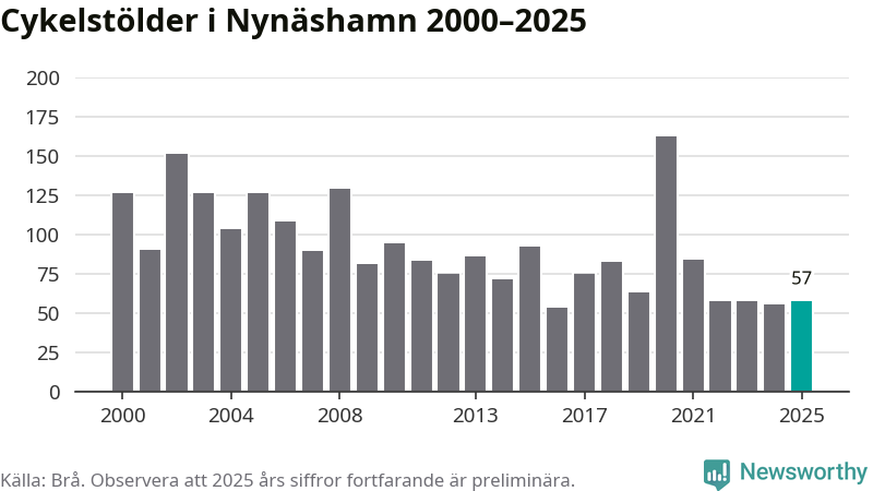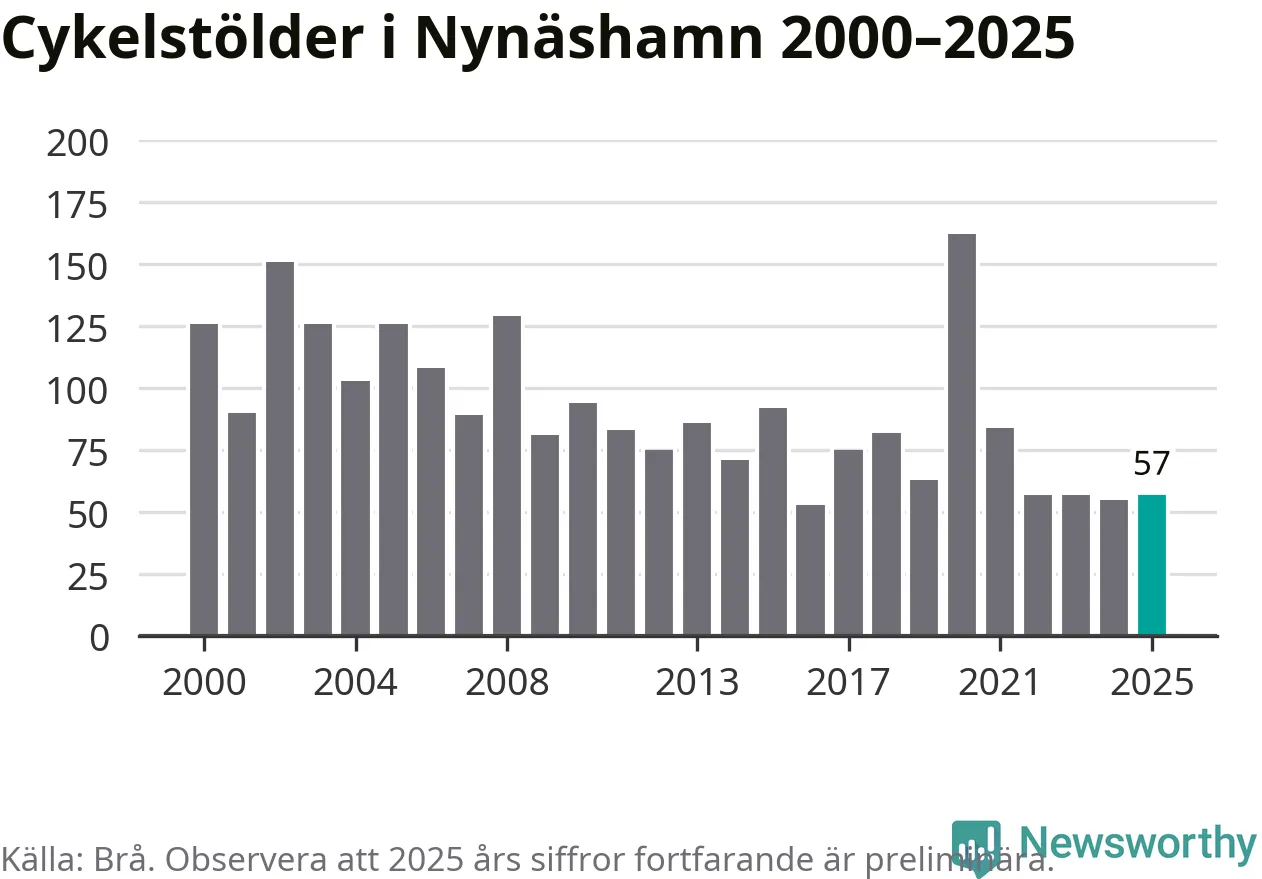 I Nynäshamns kommun var antalet cykelstölder relativt få i en historisk kontext år 2025, även om det fortfarande är preliminära siffror. Under de senaste 25 åren har det som mest anmälts 162 cykelstölder på ett år (2020), som minst 53 stycken (2016).