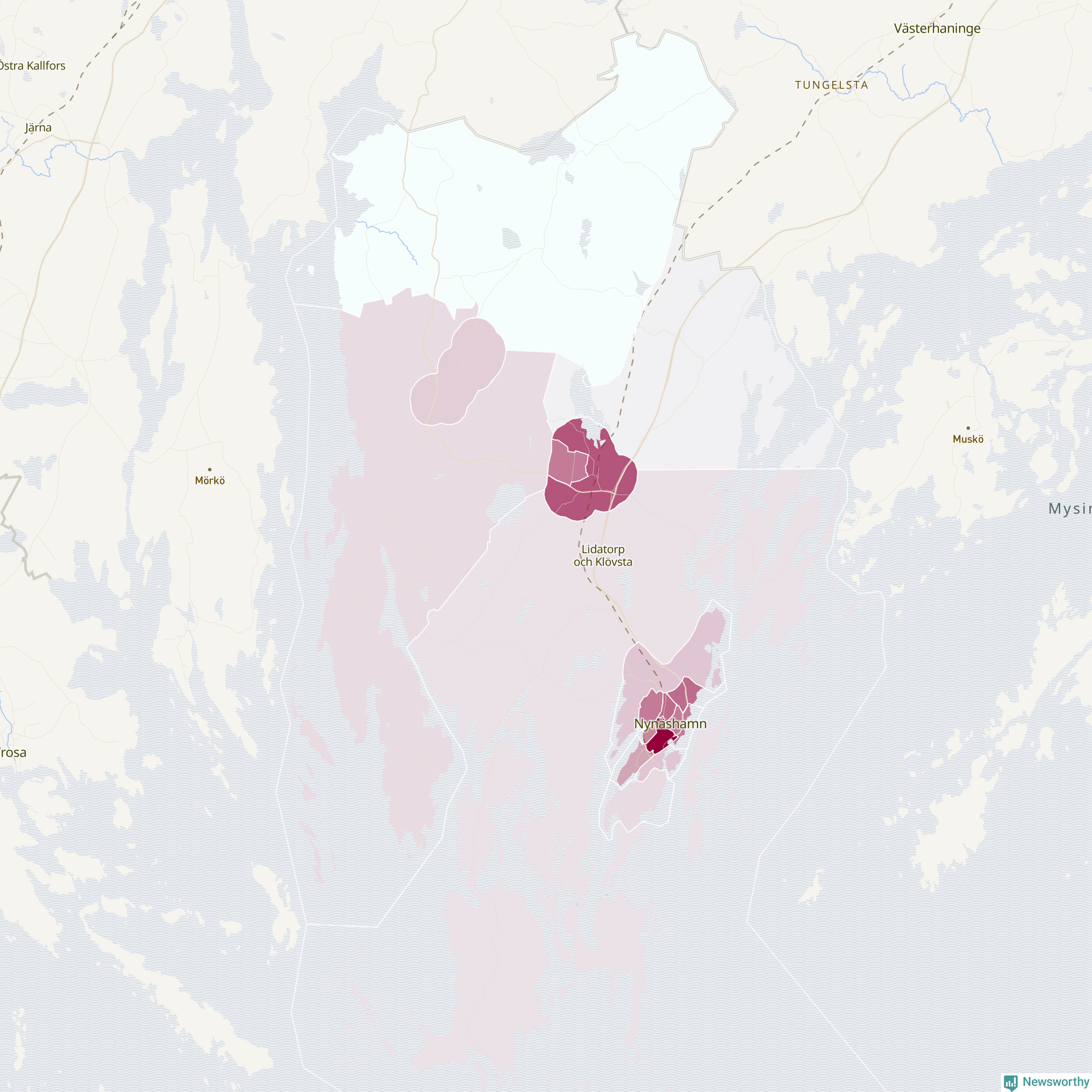 Karta som visar antalet cykelstölder i olika delar av Nynäshamn, se tabell ovan