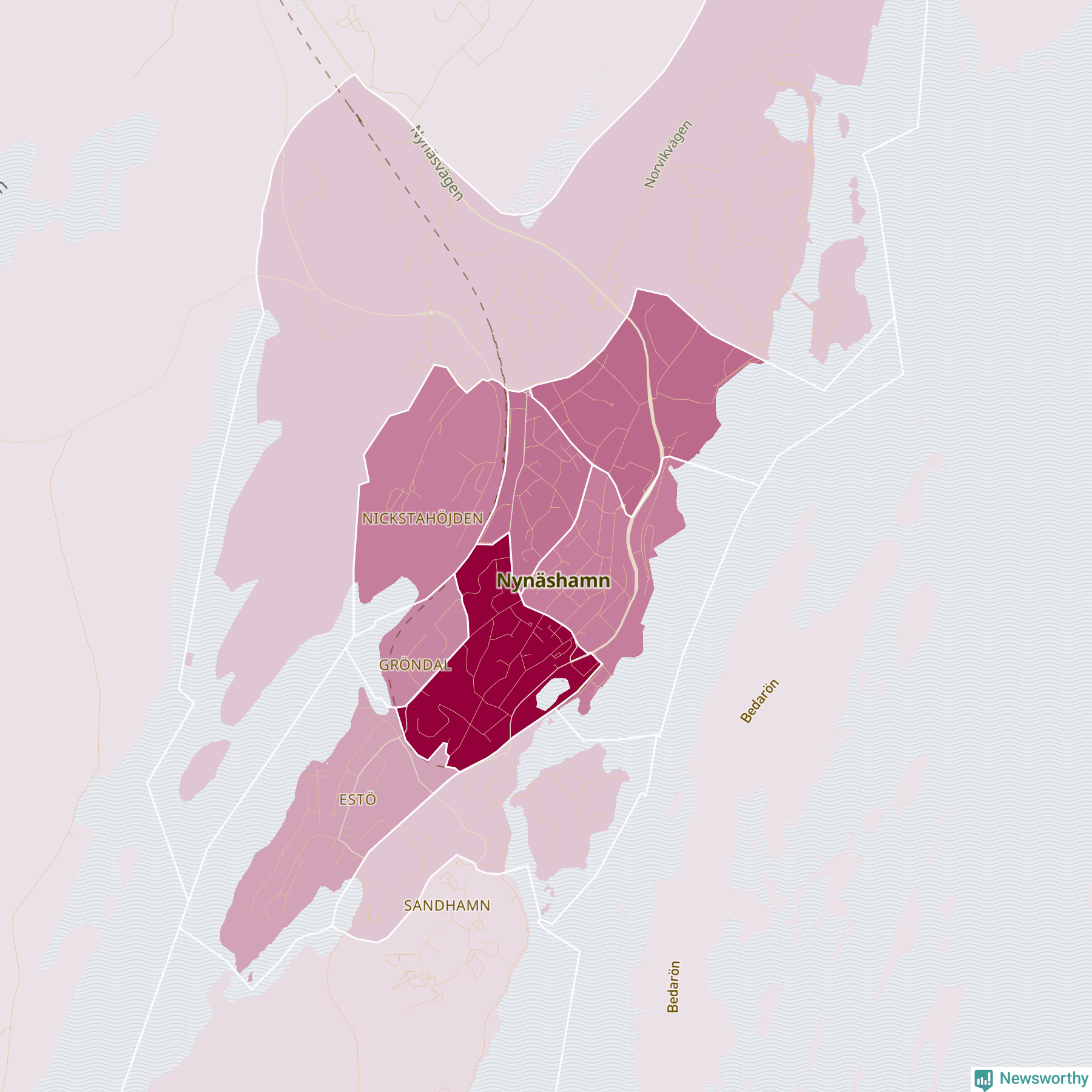Området med flest anmälda cykelstölder i Nynäshamns kommun är delar av Nynäshamns stad-östra, där det handlar om 37 anmälningar under perioden 2020–2025.