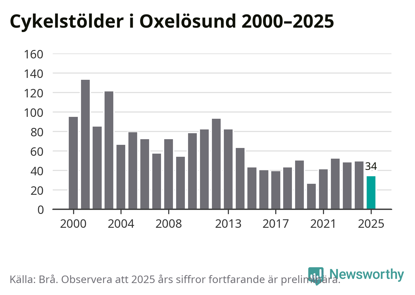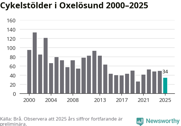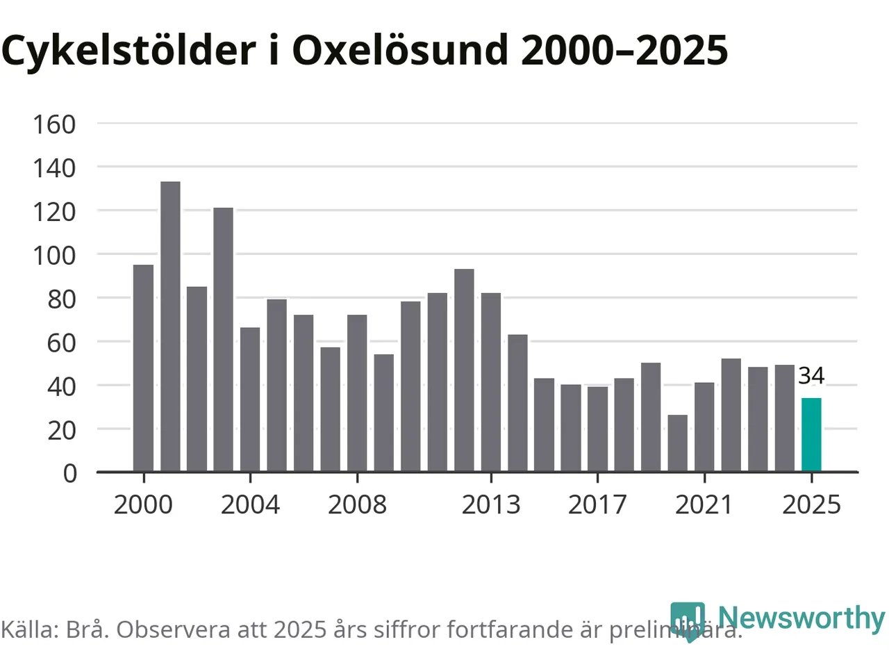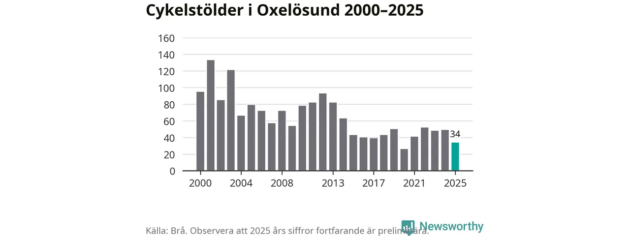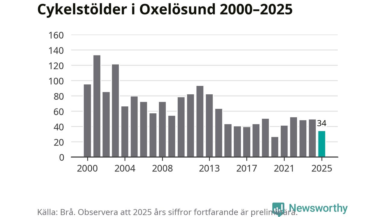 I Oxelösunds kommun var antalet cykelstölder relativt få i en historisk kontext år 2025, även om det fortfarande är preliminära siffror. Under de senaste 25 åren har det som mest anmälts 133 cykelstölder på ett år (2001), som minst 26 stycken (2020).