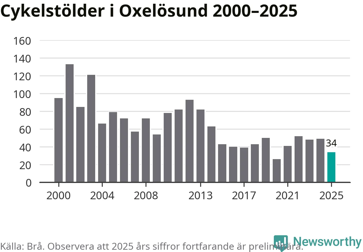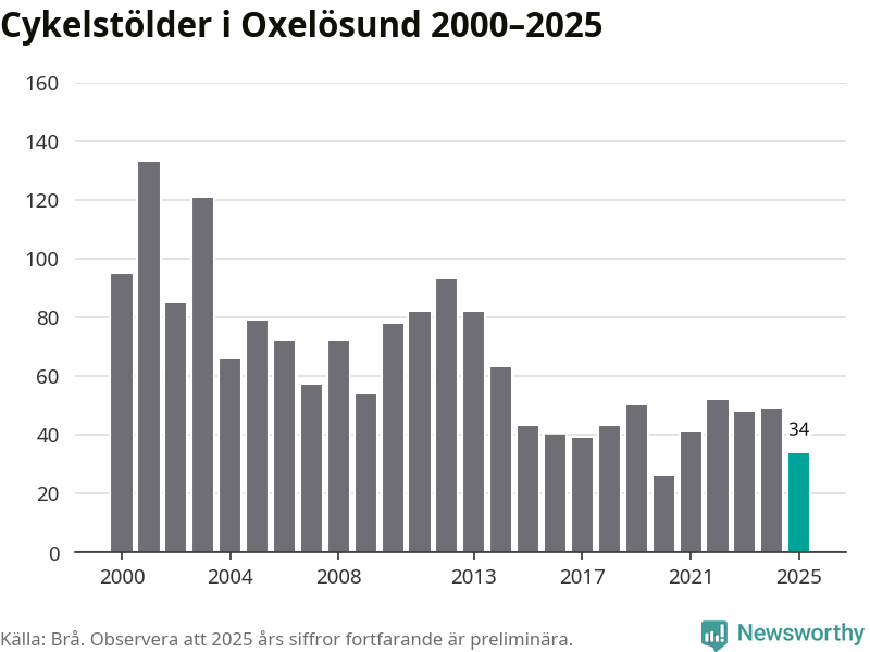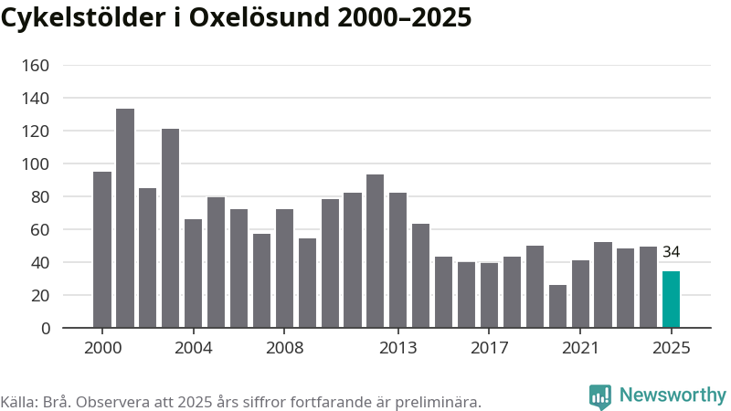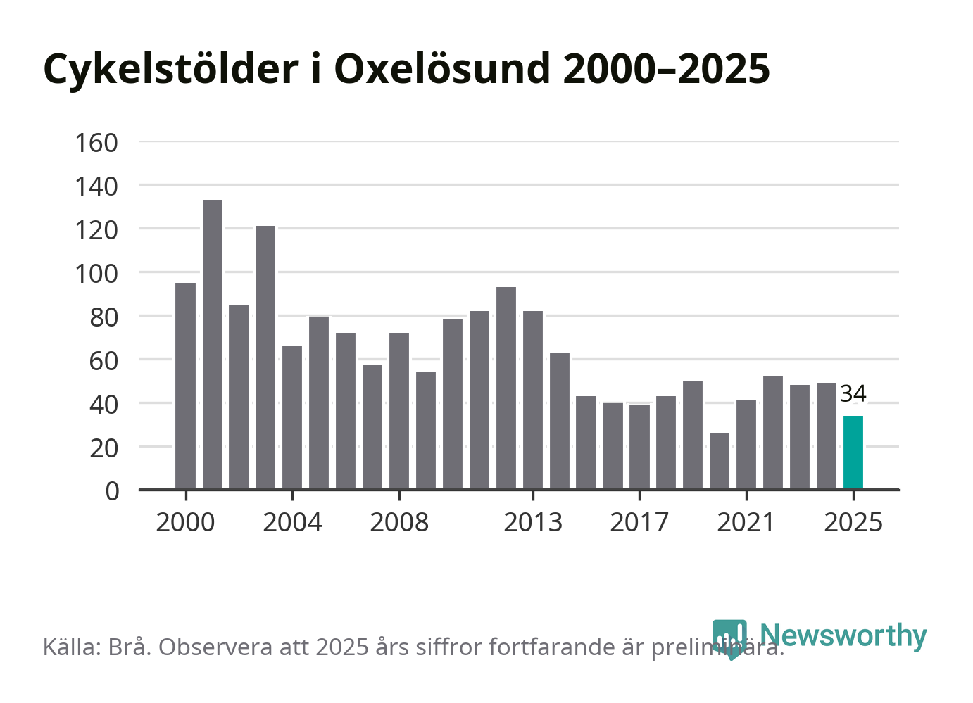 I Oxelösunds kommun var antalet cykelstölder relativt få i en historisk kontext år 2025, även om det fortfarande är preliminära siffror. Under de senaste 25 åren har det som mest anmälts 133 cykelstölder på ett år (2001), som minst 26 stycken (2020).
