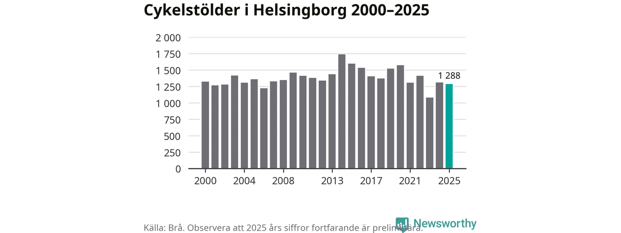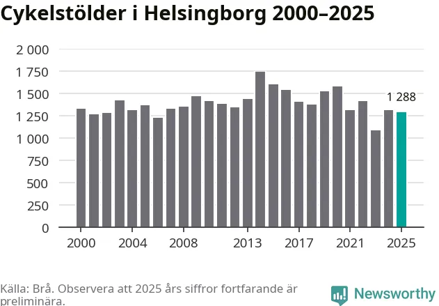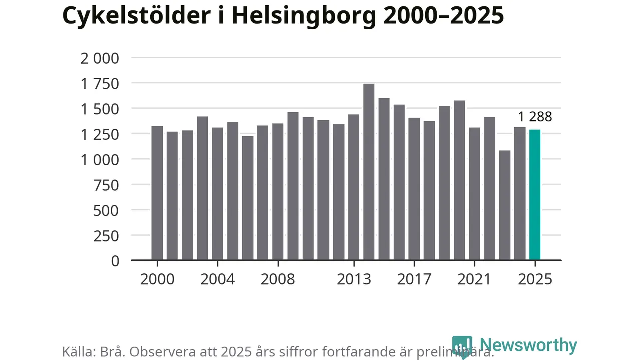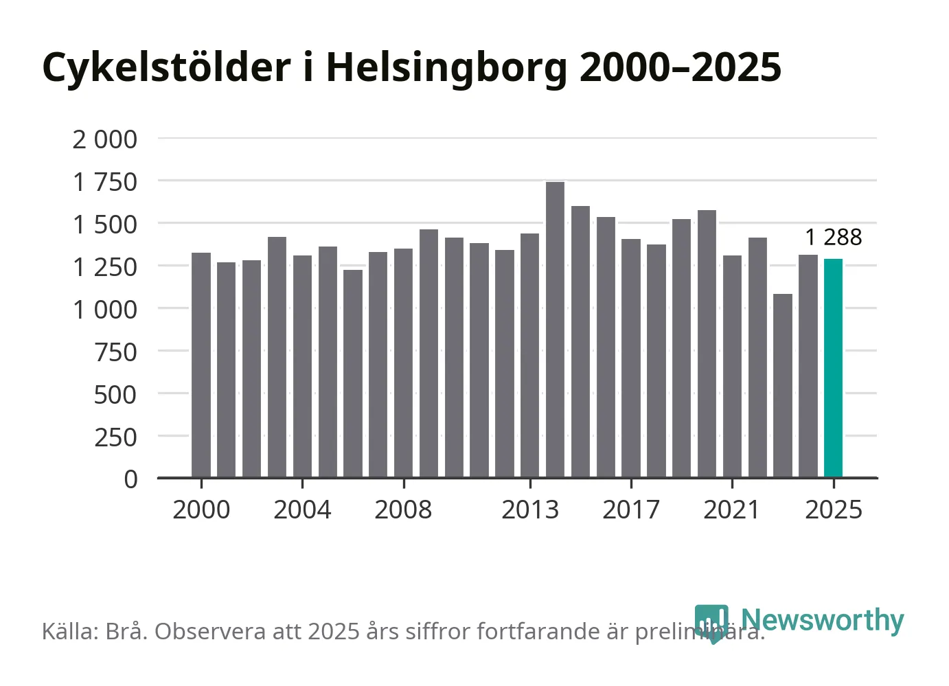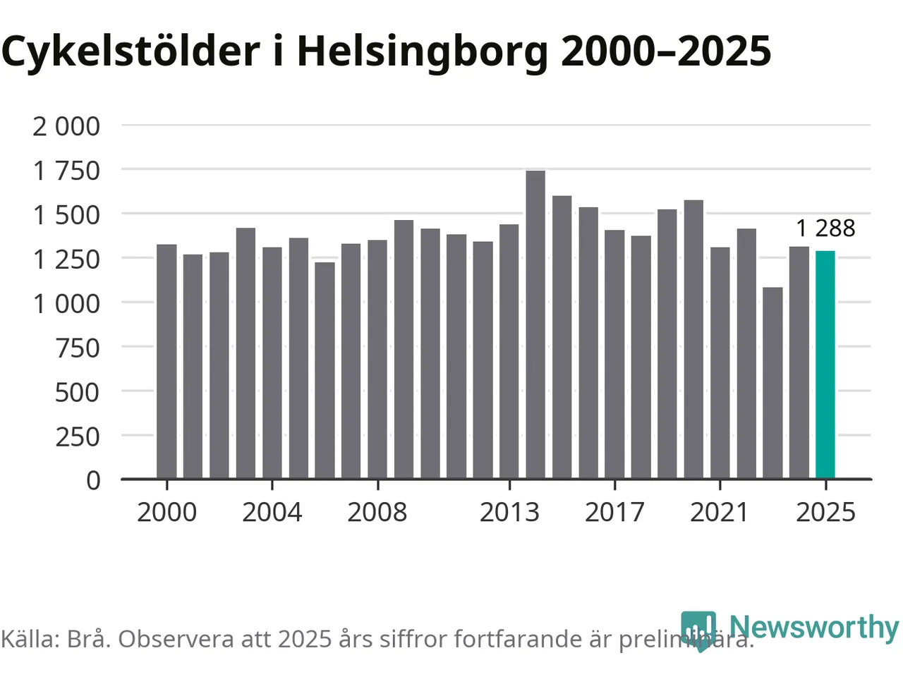 I Helsingborgs kommun var antalet cykelstölder relativt få i en historisk kontext år 2025, även om det fortfarande är preliminära siffror. Under de senaste 25 åren har det som mest anmälts 1 739 cykelstölder på ett år (2014), som minst 1 082 stycken (2023).