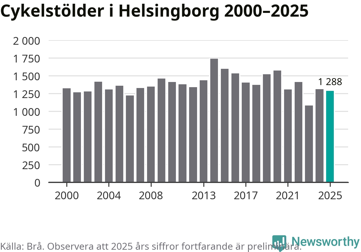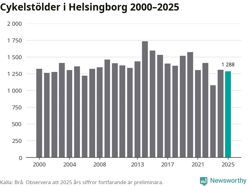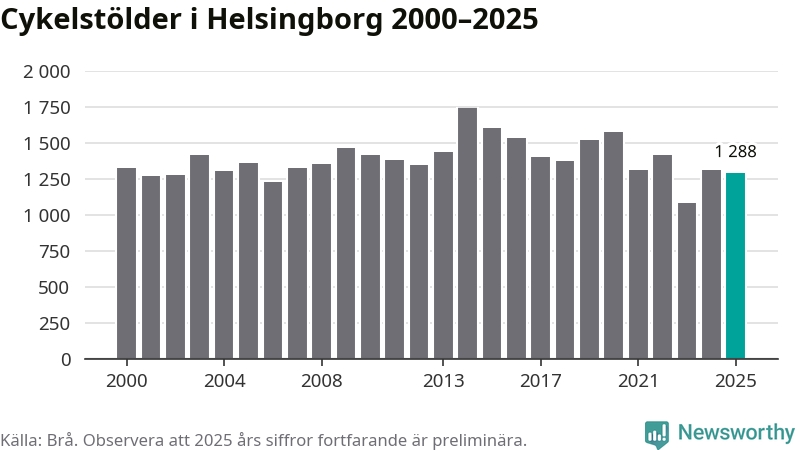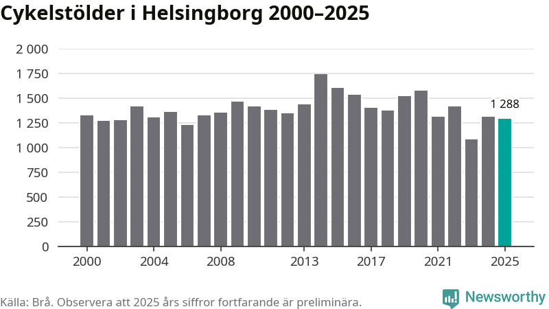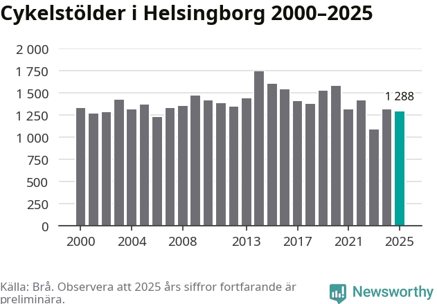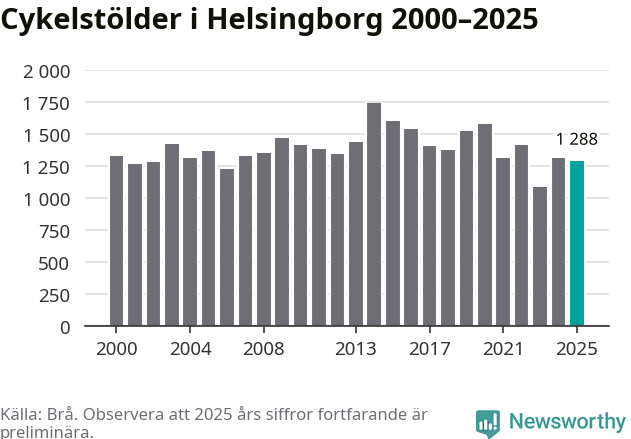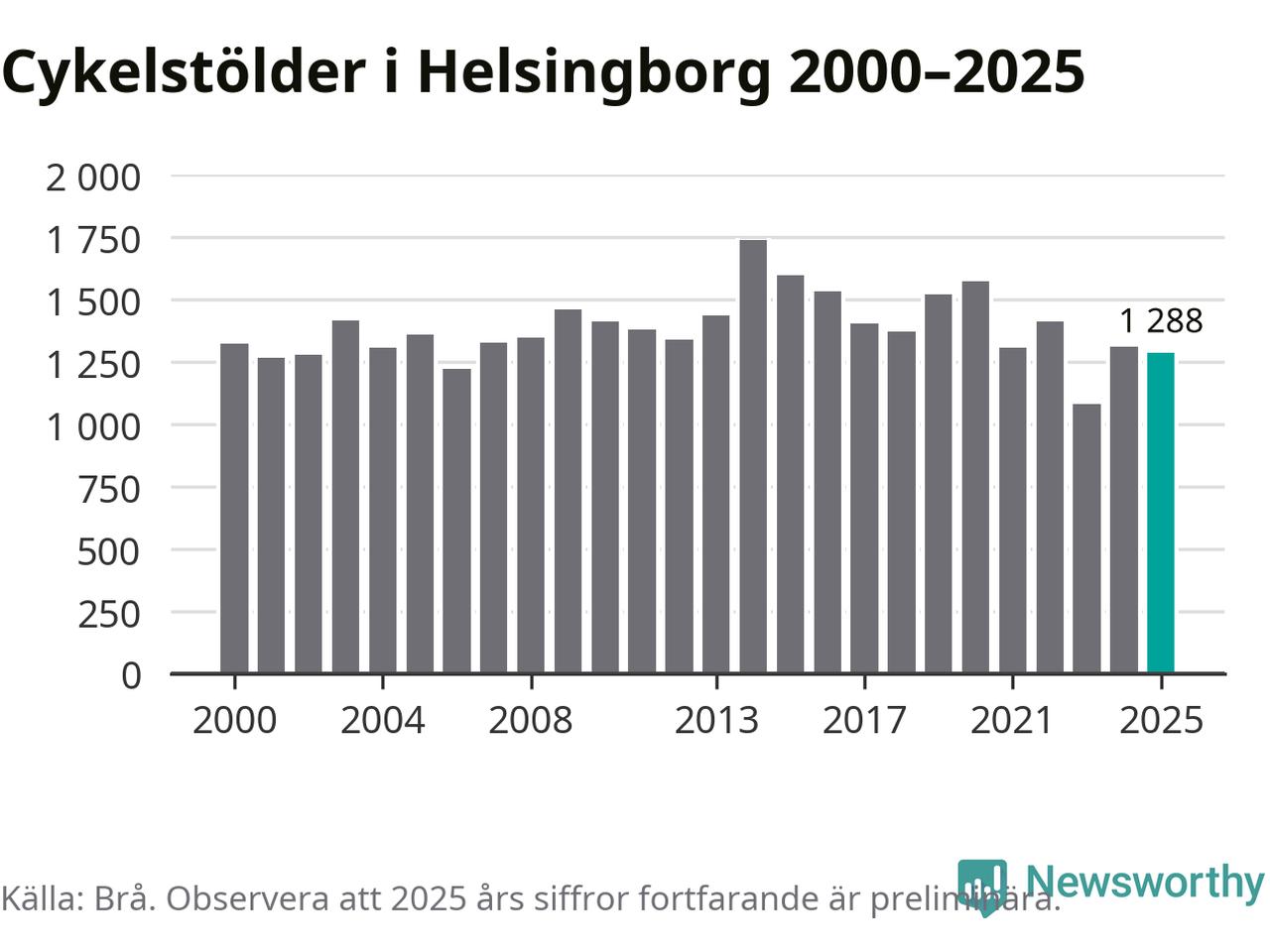 I Helsingborgs kommun var antalet cykelstölder relativt få i en historisk kontext år 2025, även om det fortfarande är preliminära siffror. Under de senaste 25 åren har det som mest anmälts 1 739 cykelstölder på ett år (2014), som minst 1 082 stycken (2023).