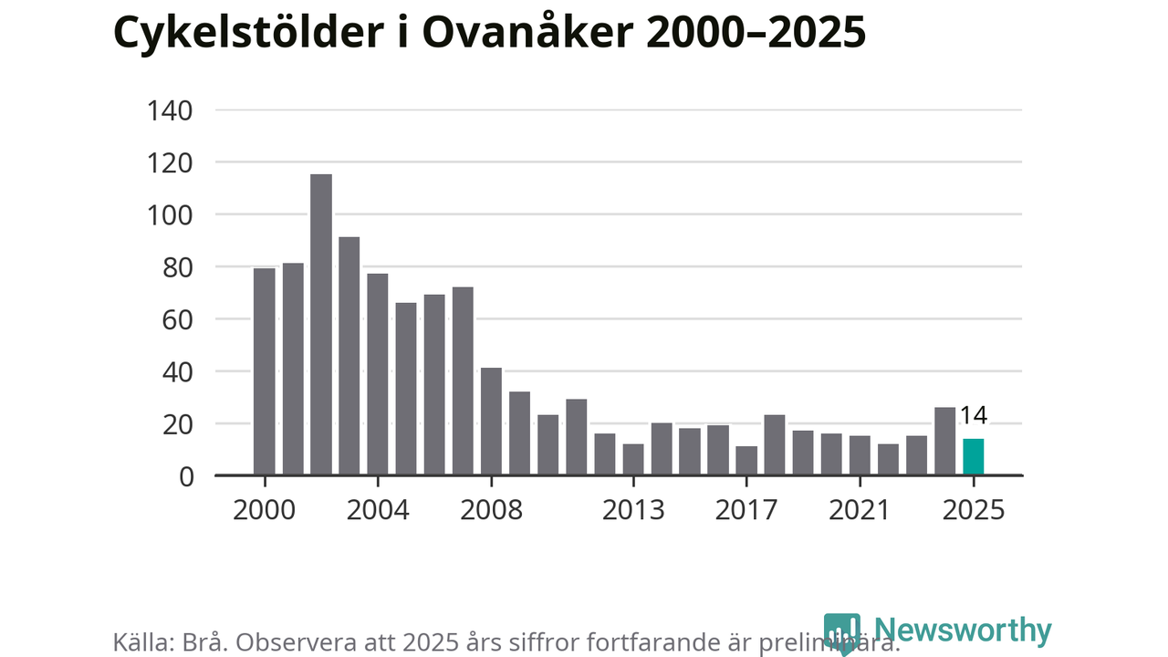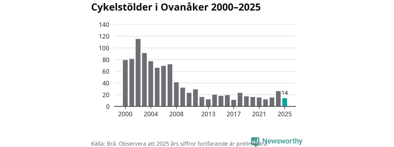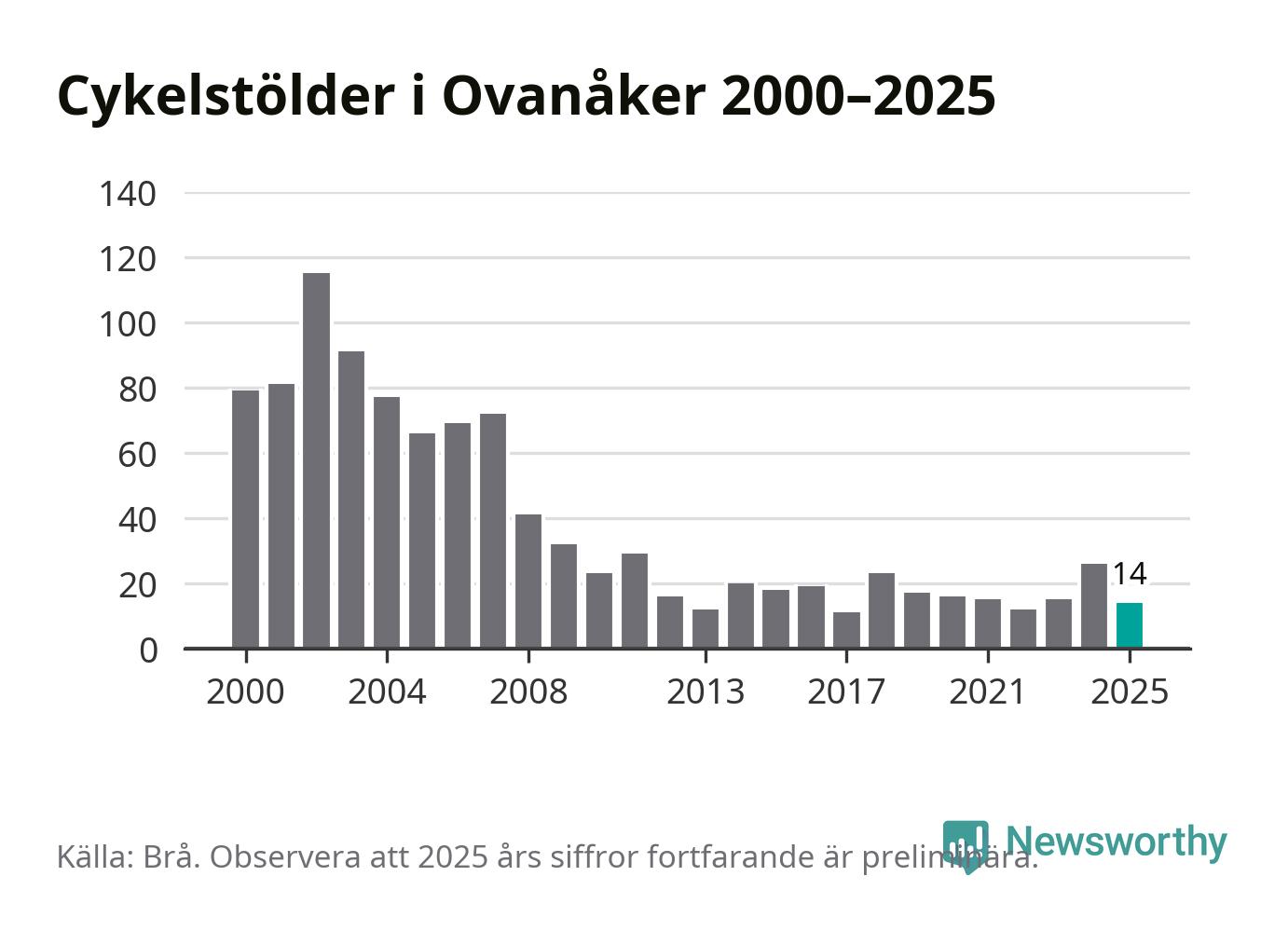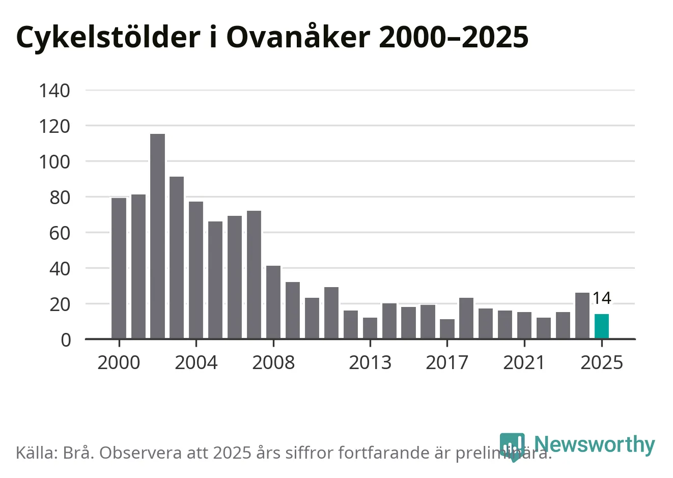 I Ovanåkers kommun var antalet cykelstölder relativt få i en historisk kontext år 2025, även om det fortfarande är preliminära siffror. Under de senaste 25 åren har det som mest anmälts 115 cykelstölder på ett år (2002), som minst 11 stycken (2017).