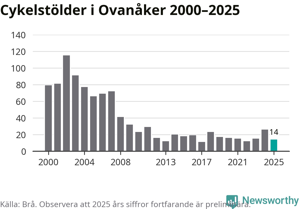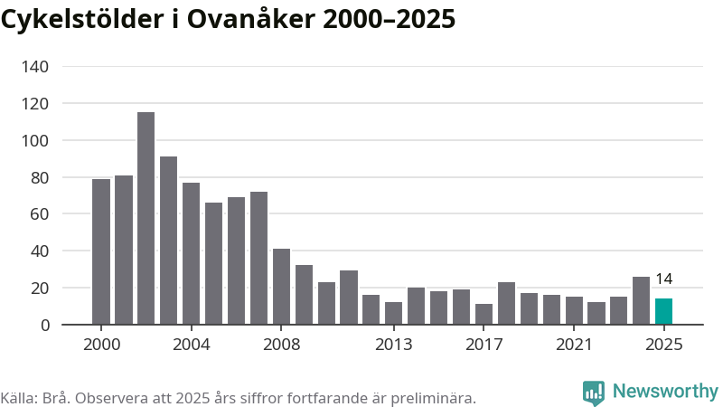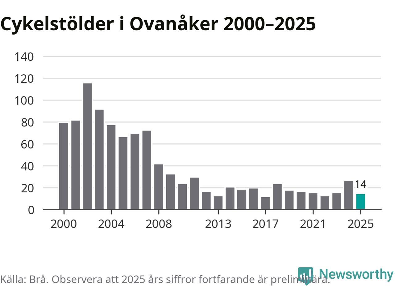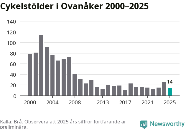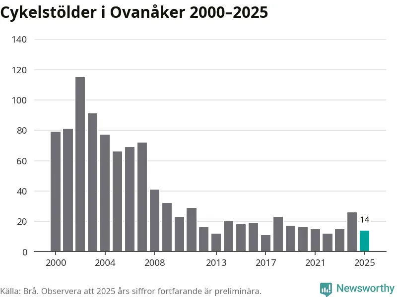 I Ovanåkers kommun var antalet cykelstölder relativt få i en historisk kontext år 2025, även om det fortfarande är preliminära siffror. Under de senaste 25 åren har det som mest anmälts 115 cykelstölder på ett år (2002), som minst 11 stycken (2017).