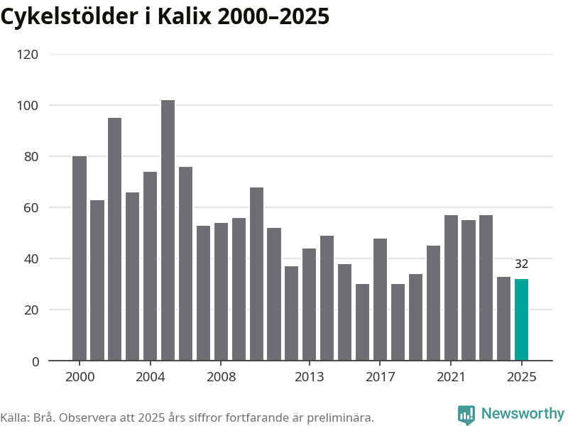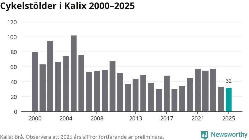 I Kalix kommun var antalet cykelstölder relativt få i en historisk kontext år 2025, även om det fortfarande är preliminära siffror. Under de senaste 25 åren har det som mest anmälts 102 cykelstölder på ett år (2005), som minst 30 stycken (2016 och 2018).
