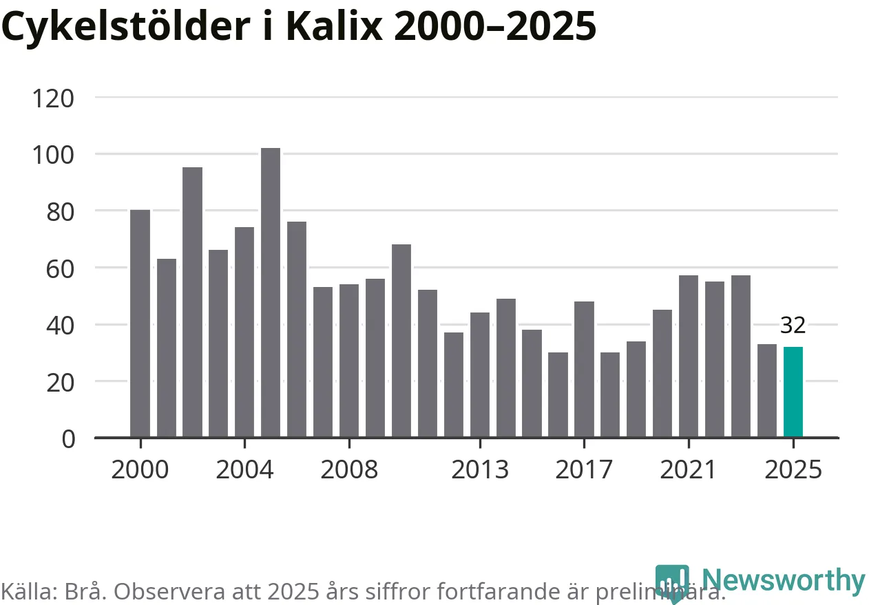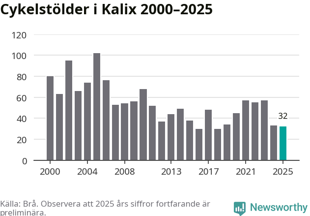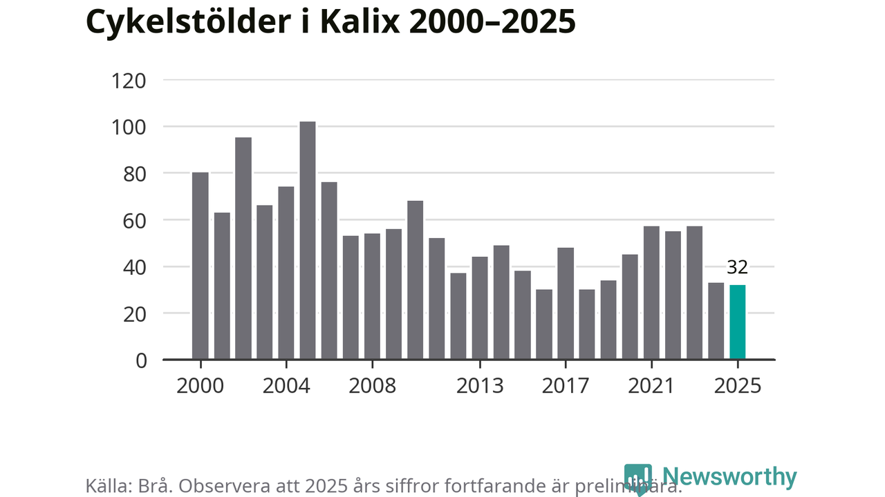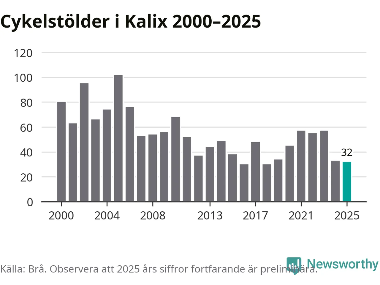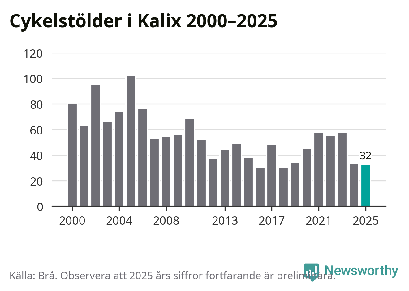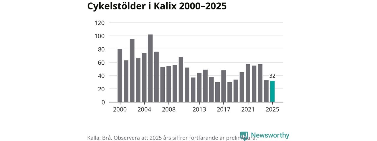 Av de 32 stöldanmälningar i Kalix 2025 gällde fyra elcyklar, det motsvarar 13 procent. Brå särredovisar elcyklar sedan 2020 och i riket som helhet ökade anmälningarna om stulna elcyklar kraftigt de första åren, för att de senaste tre åren ha legat relativt stilla. Eftersom antalet cykelstölder totalt har minskat under samma tid har andelen elcyklar ökat. I fjol stod elcyklar för 28 procent av alla anmälda cykelstölder i landet.