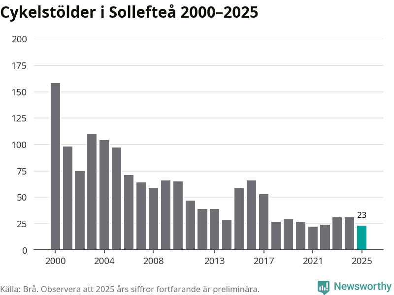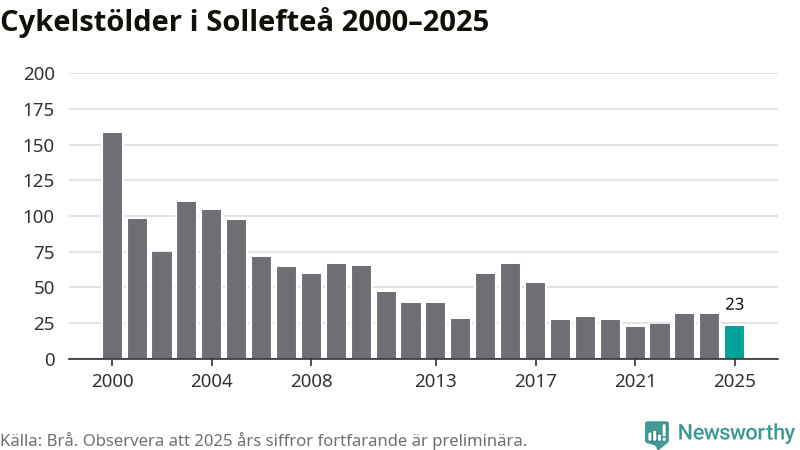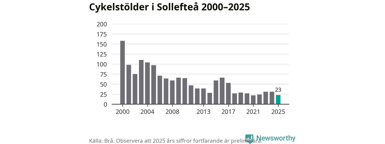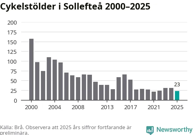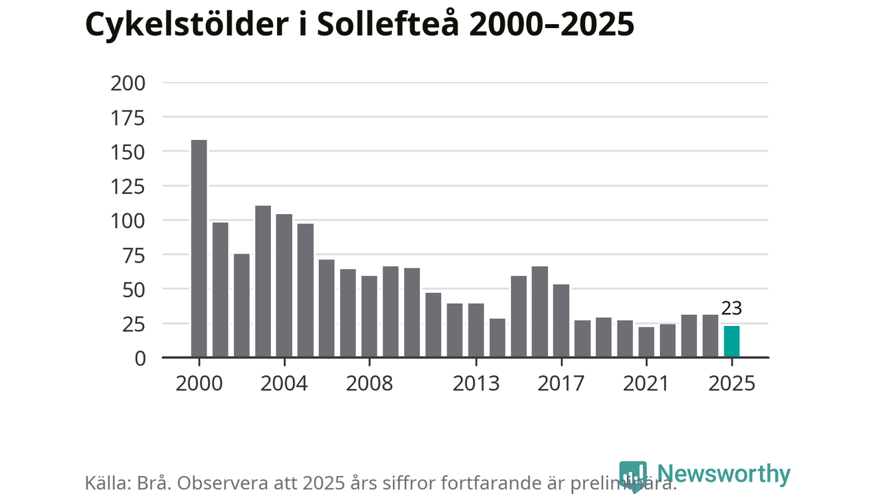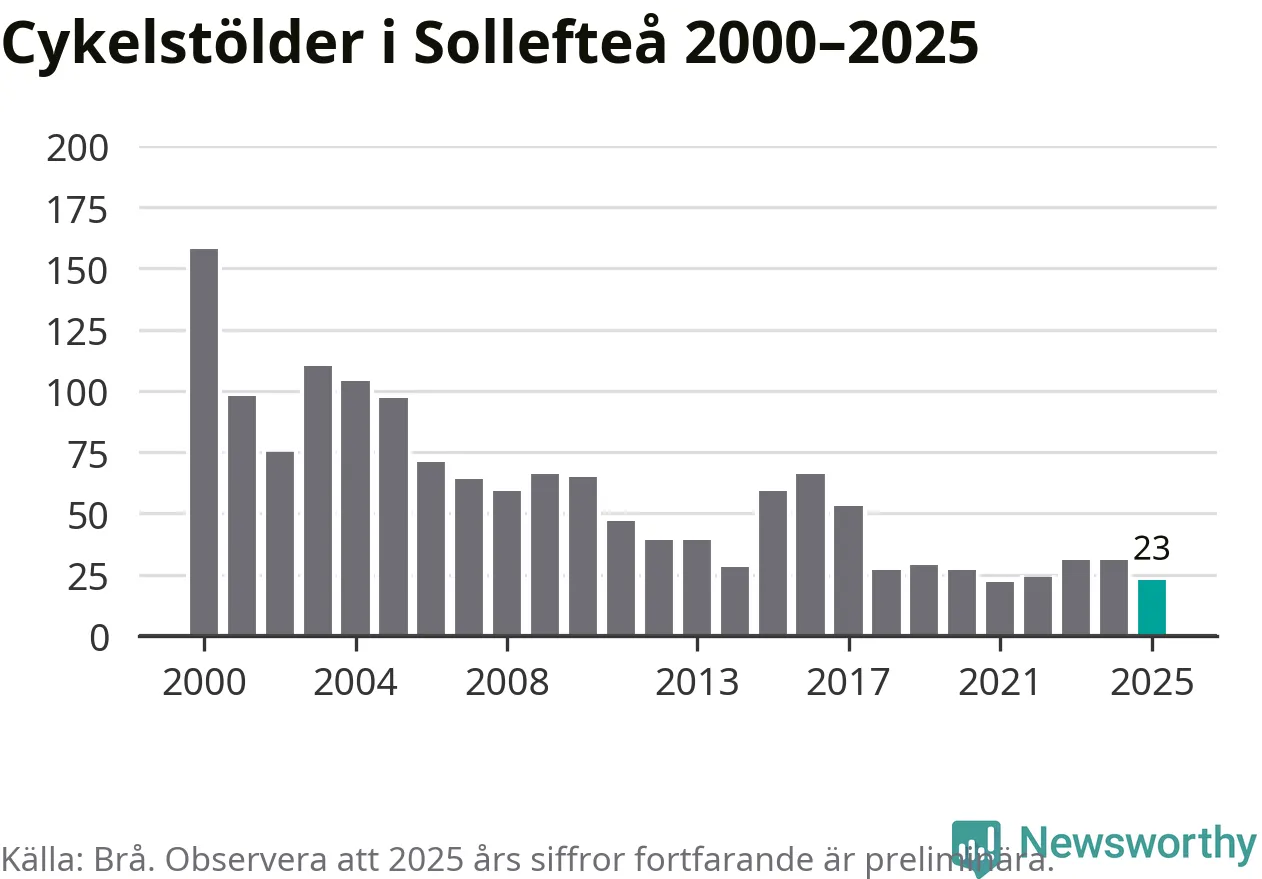 I Sollefteå kommun var antalet cykelstölder relativt få i en historisk kontext år 2025, även om det fortfarande är preliminära siffror. Under de senaste 25 åren har det som mest anmälts 158 cykelstölder på ett år (2000), som minst 22 stycken (2021).