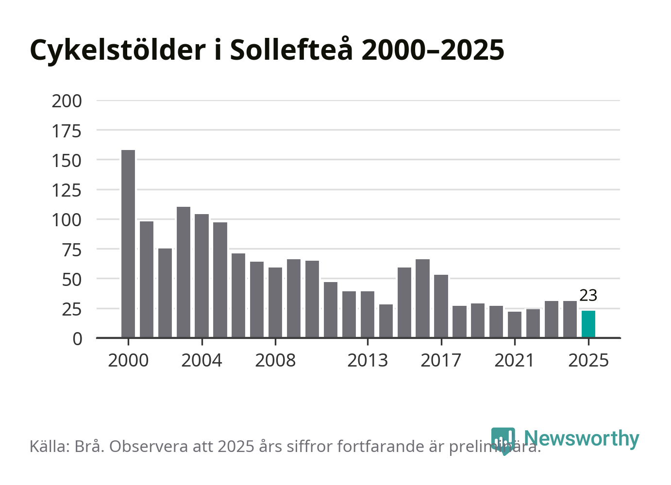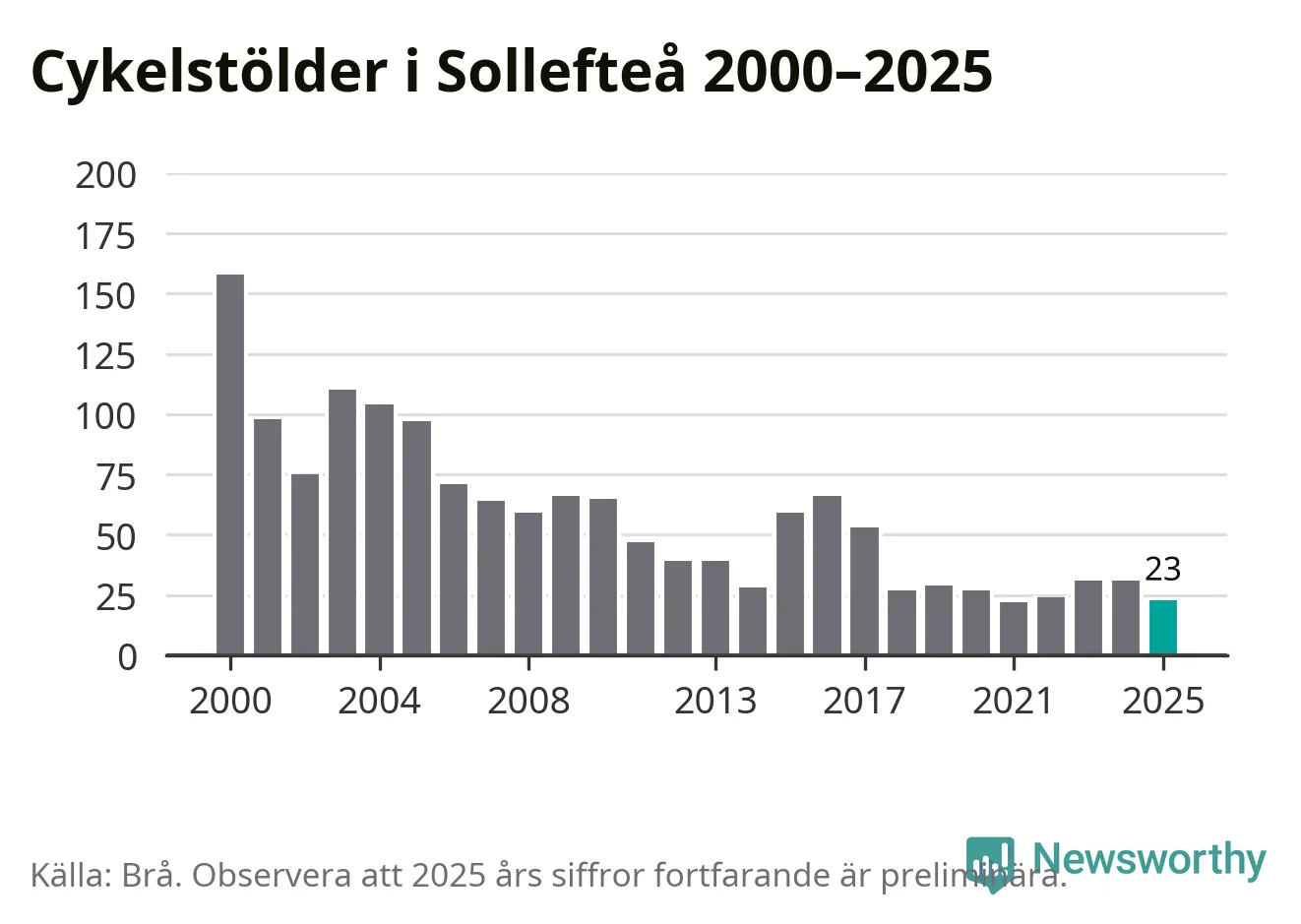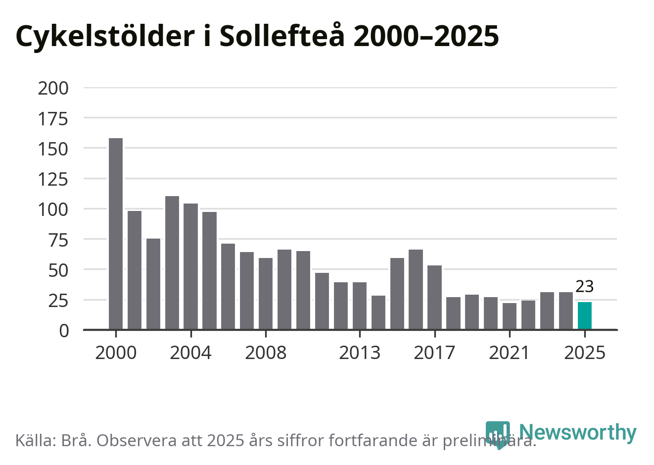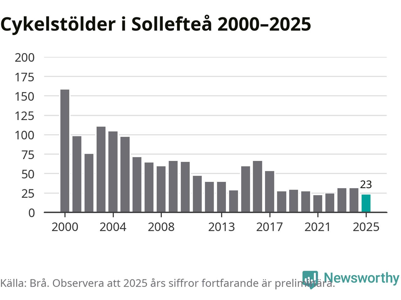I Sollefteå kommun var antalet cykelstölder relativt få i en historisk kontext år 2025, även om det fortfarande är preliminära siffror. Under de senaste 25 åren har det som mest anmälts 158 cykelstölder på ett år (2000), som minst 22 stycken (2021).