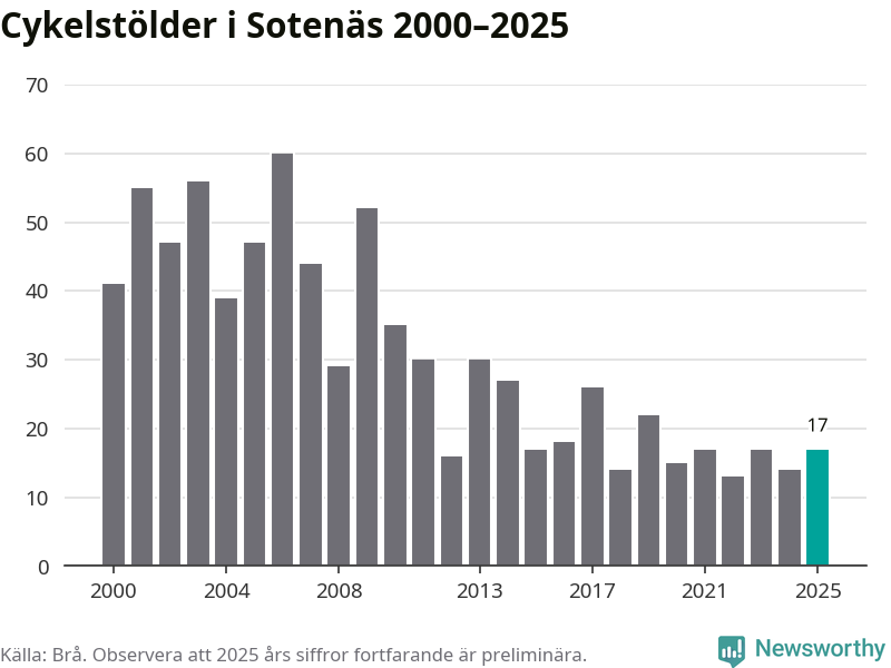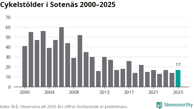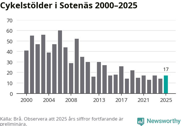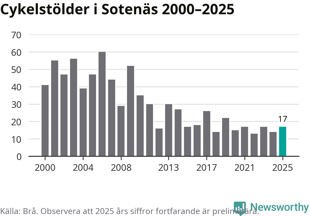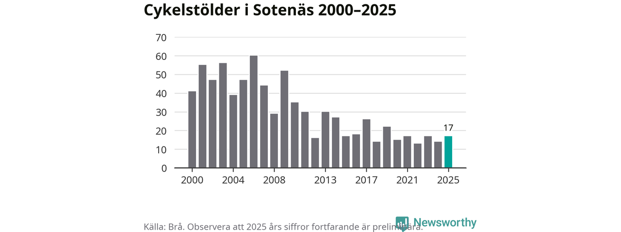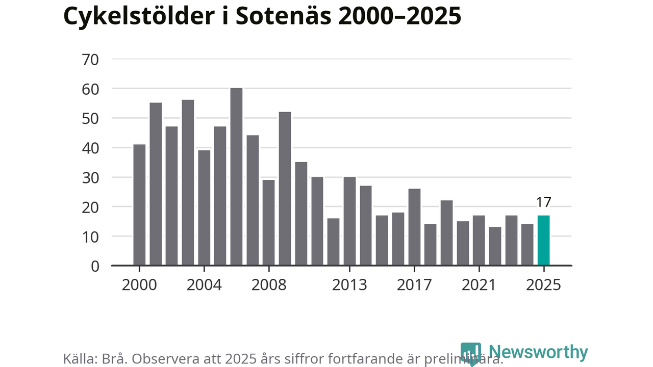 I Sotenäs kommun var antalet cykelstölder relativt få i en historisk kontext år 2025, även om det fortfarande är preliminära siffror. Under de senaste 25 åren har det som mest anmälts 60 cykelstölder på ett år (2006), som minst 13 stycken (2022).