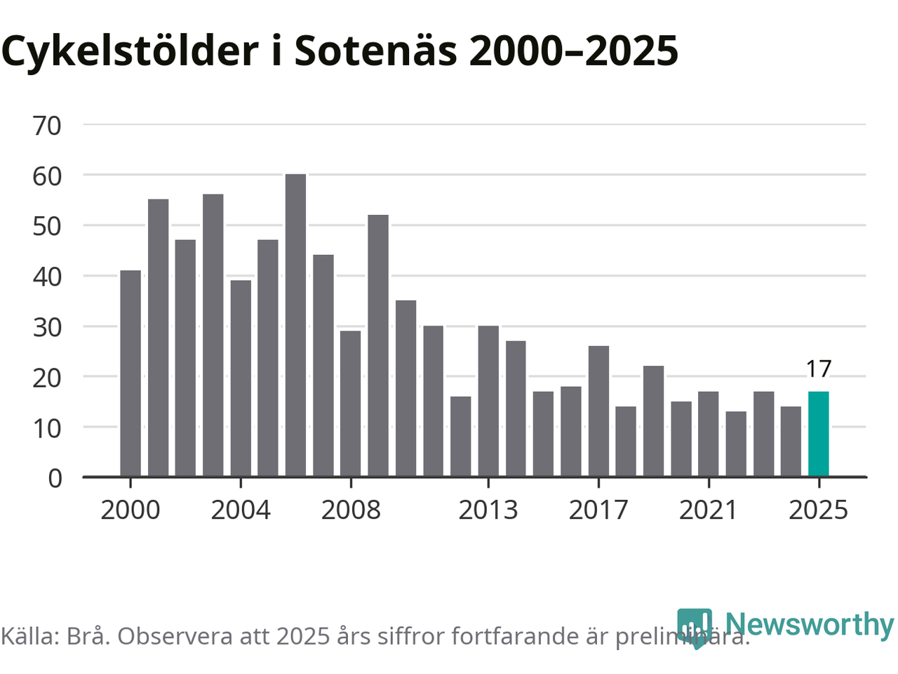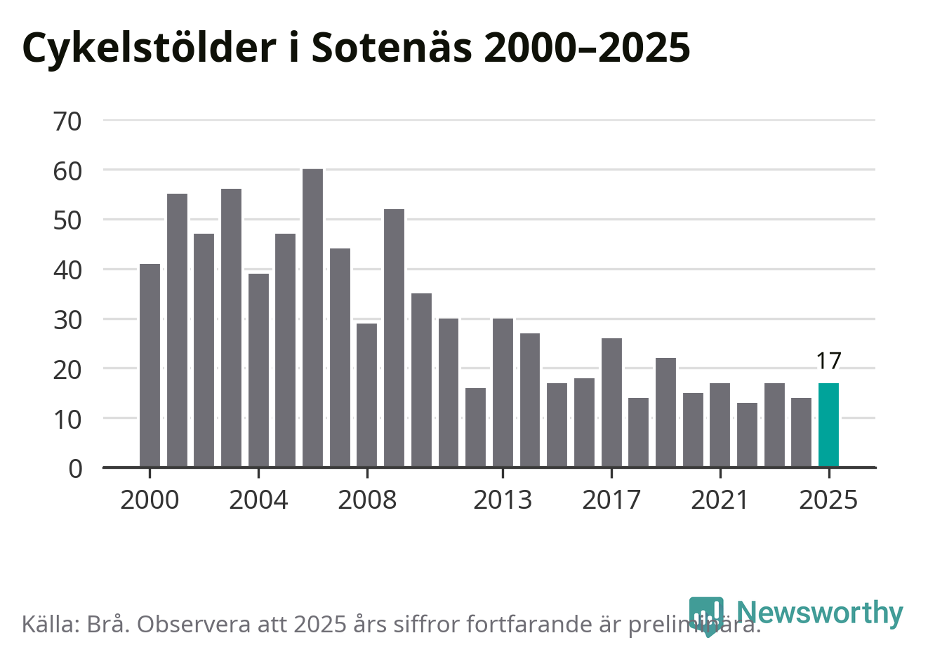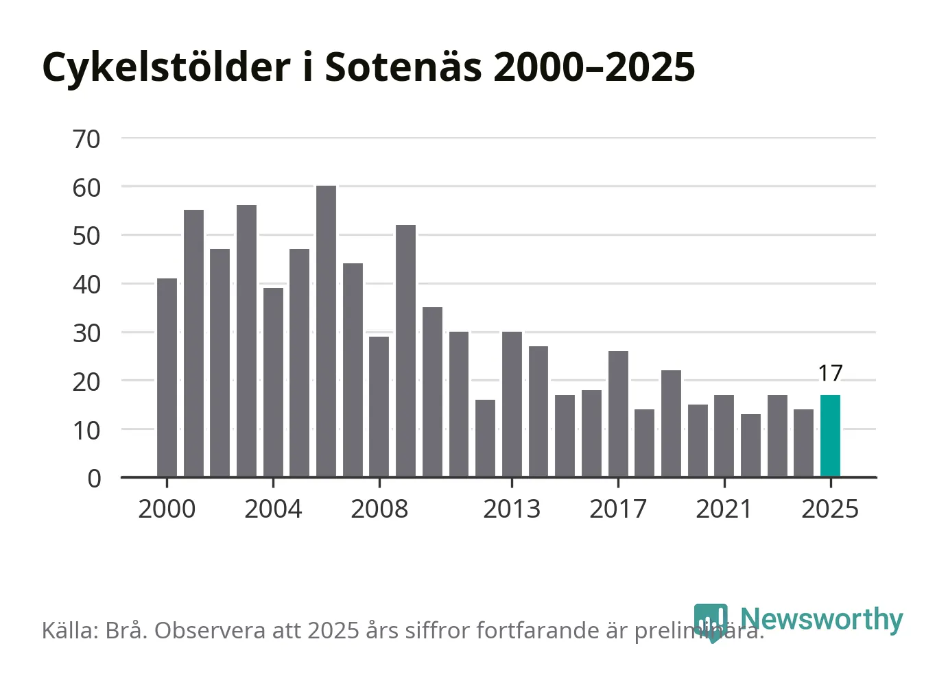 I Sotenäs kommun var antalet cykelstölder relativt få i en historisk kontext år 2025, även om det fortfarande är preliminära siffror. Under de senaste 25 åren har det som mest anmälts 60 cykelstölder på ett år (2006), som minst 13 stycken (2022).