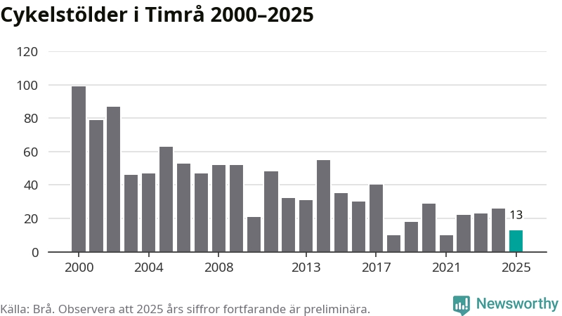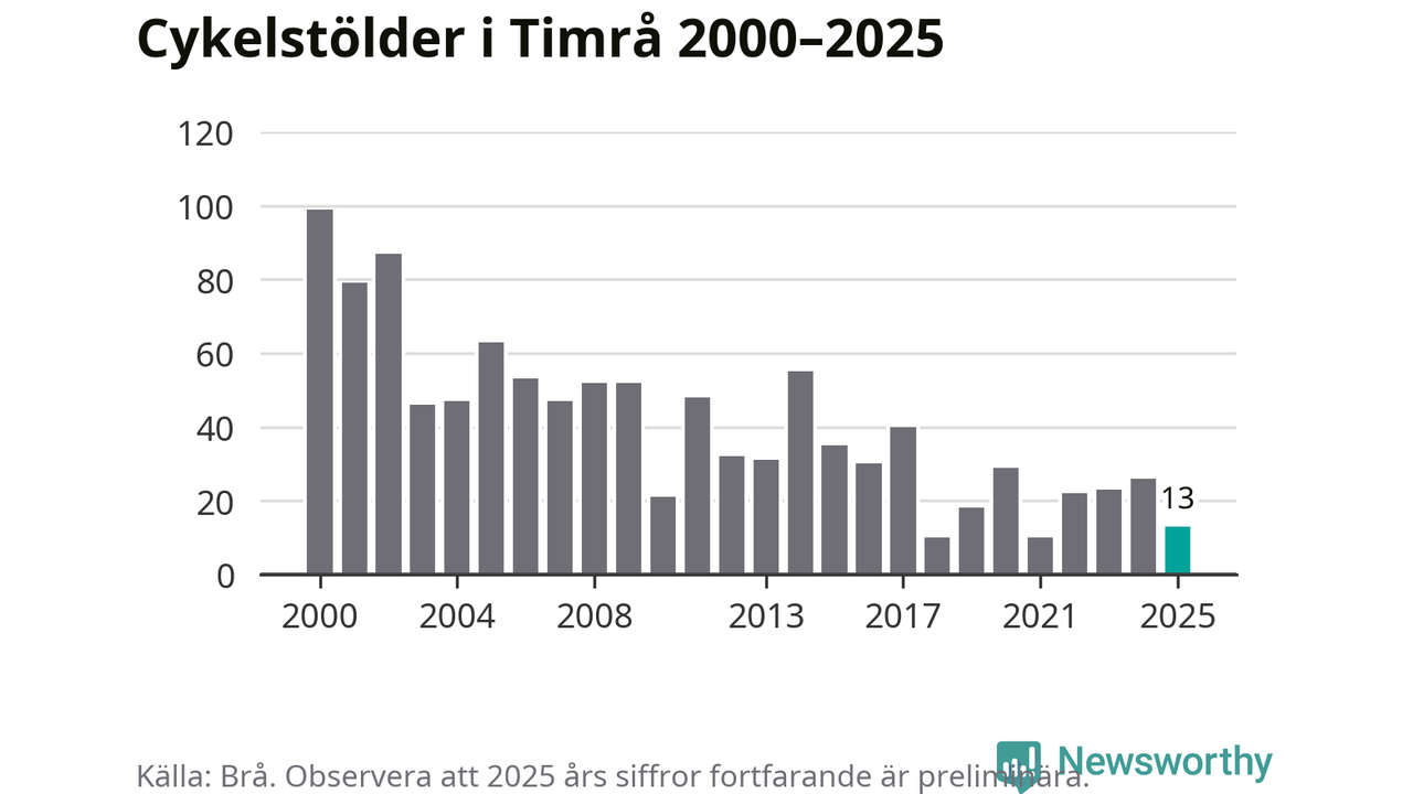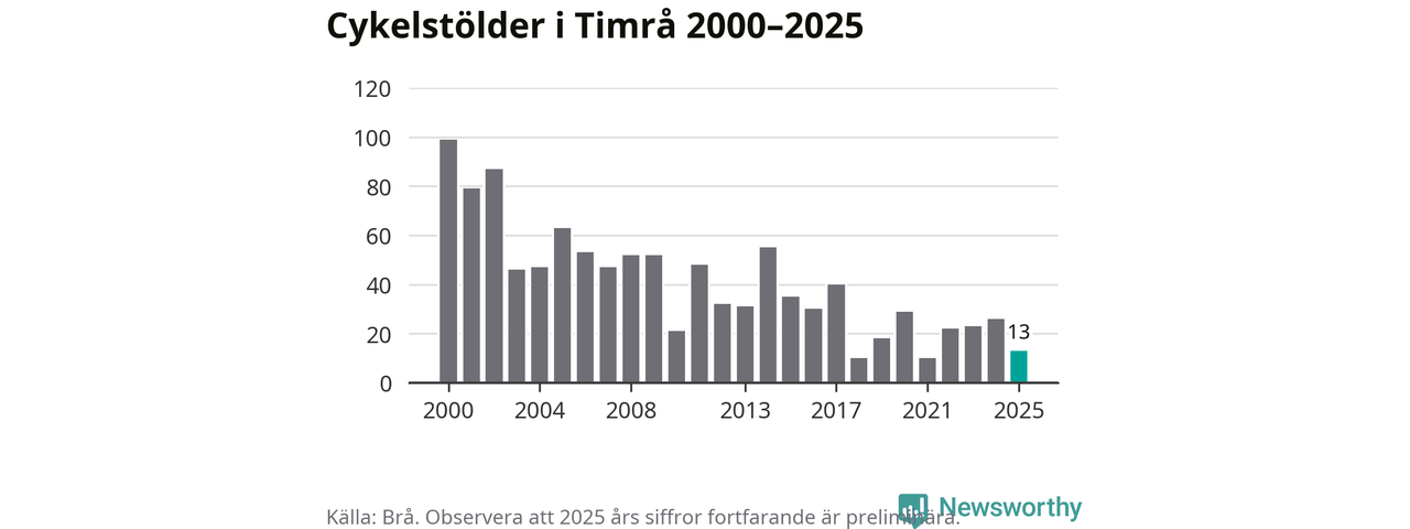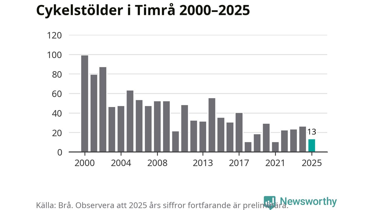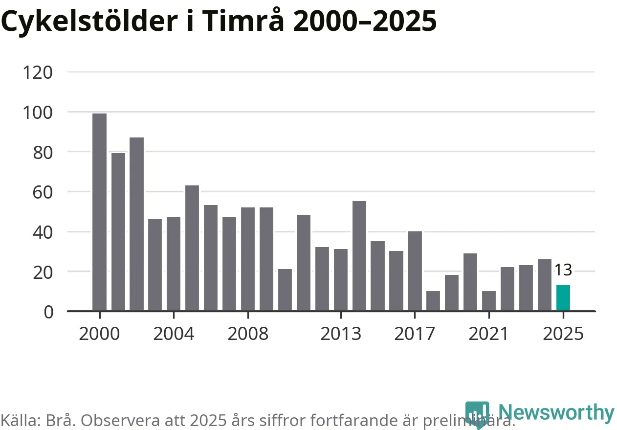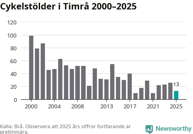 I Timrå kommun var antalet cykelstölder relativt få i en historisk kontext år 2025, även om det fortfarande är preliminära siffror. Under de senaste 25 åren har det som mest anmälts 99 cykelstölder på ett år (2000), som minst 10 stycken (2018 och 2021).
