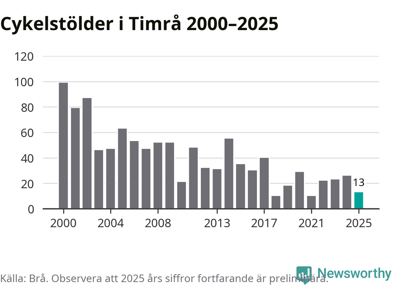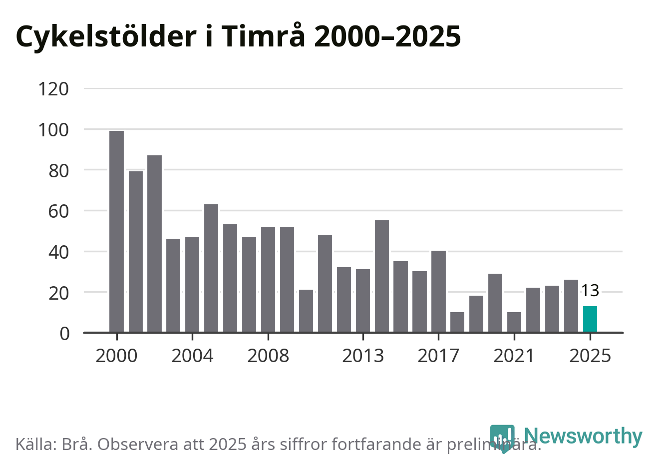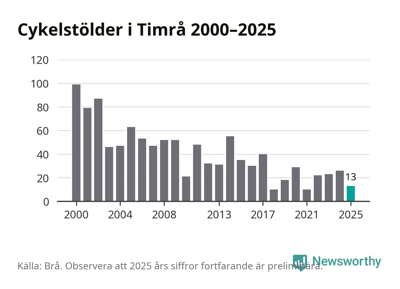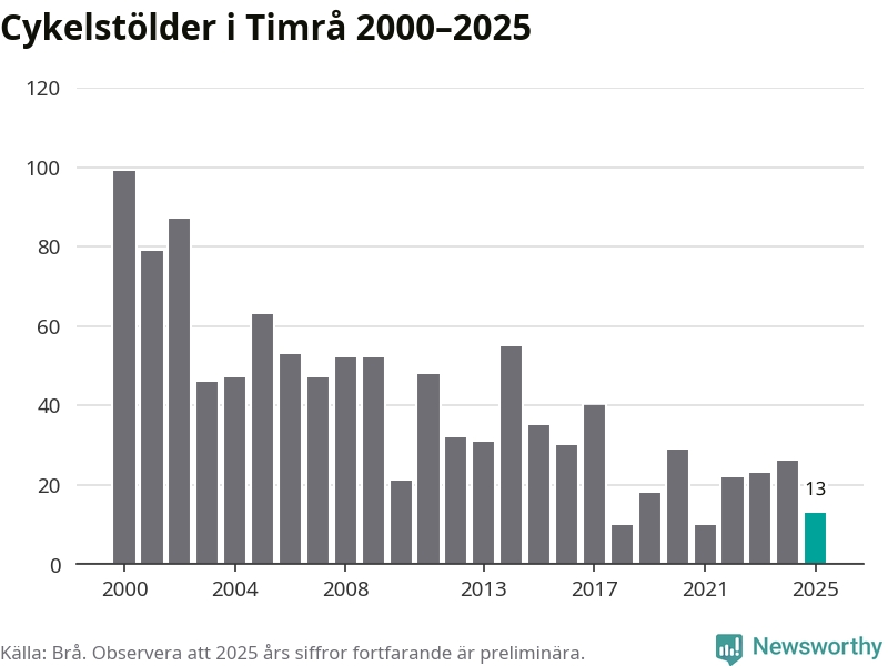 I Timrå kommun var antalet cykelstölder relativt få i en historisk kontext år 2025, även om det fortfarande är preliminära siffror. Under de senaste 25 åren har det som mest anmälts 99 cykelstölder på ett år (2000), som minst 10 stycken (2018 och 2021).