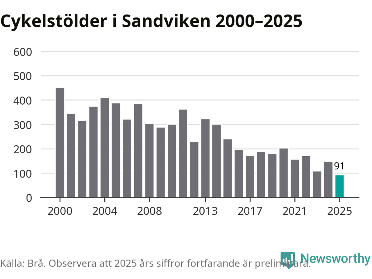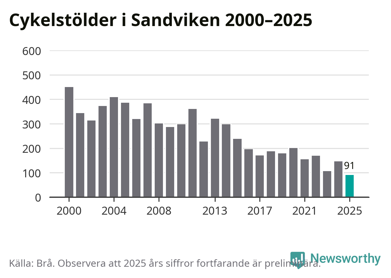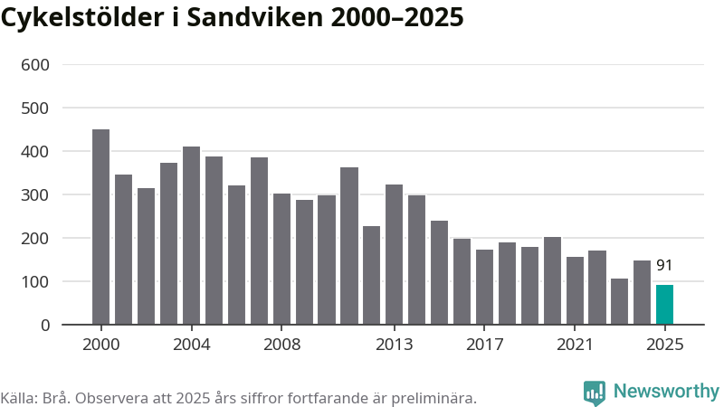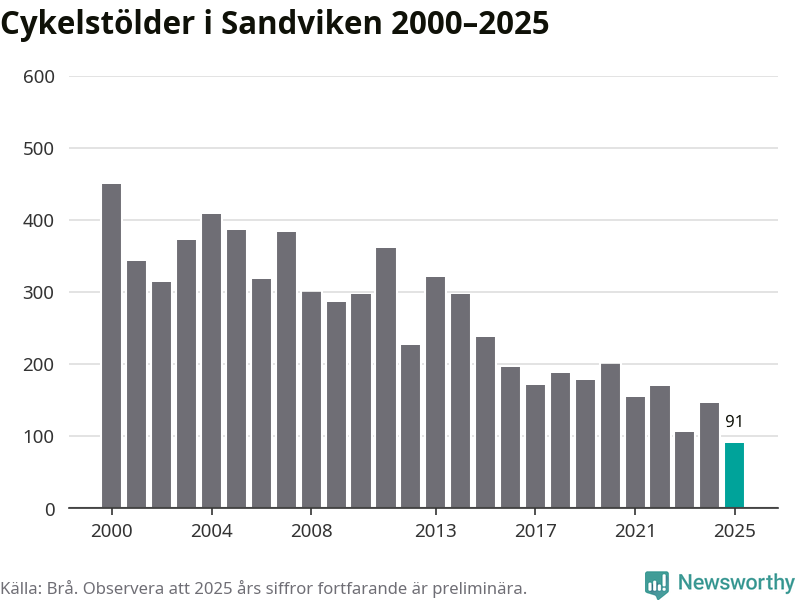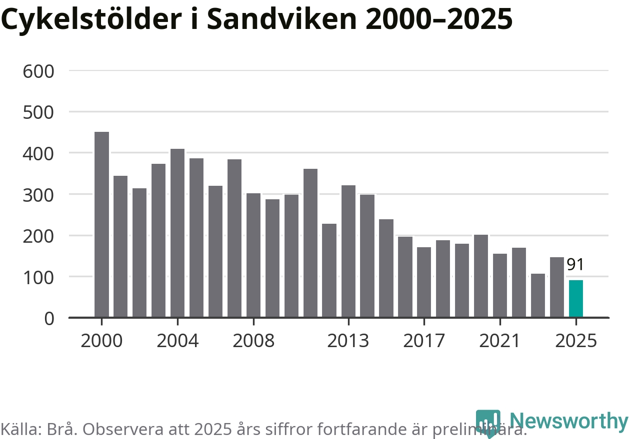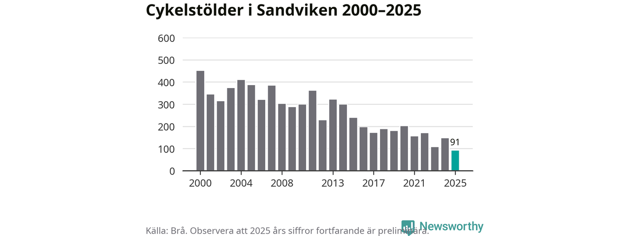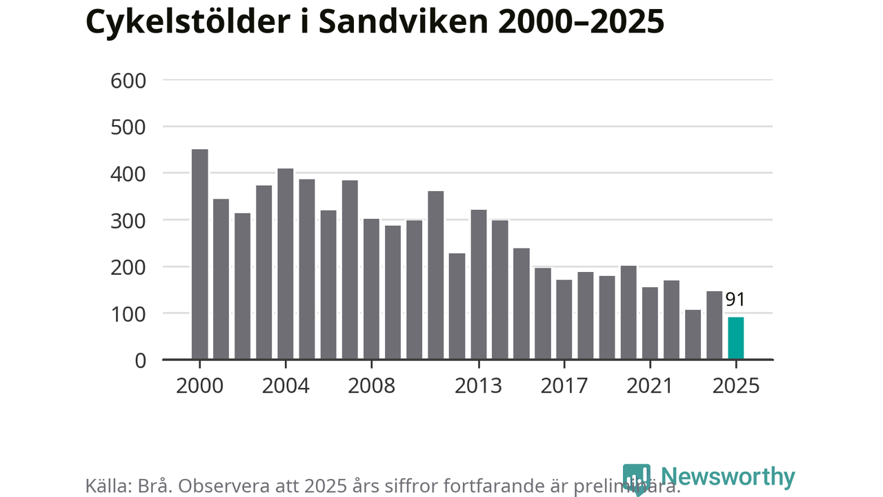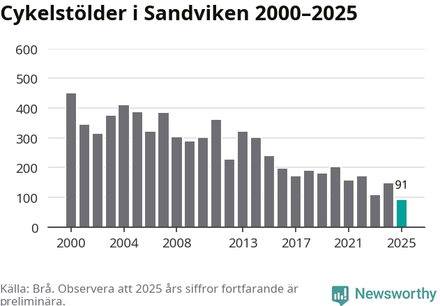 I Sandvikens kommun noterades det lägsta antalet cykelstölder under hela 2000-talet år 2025, även om det fortfarande är preliminära siffror. Under de senaste 25 åren har det som mest anmälts 450 cykelstölder på ett år (2000).