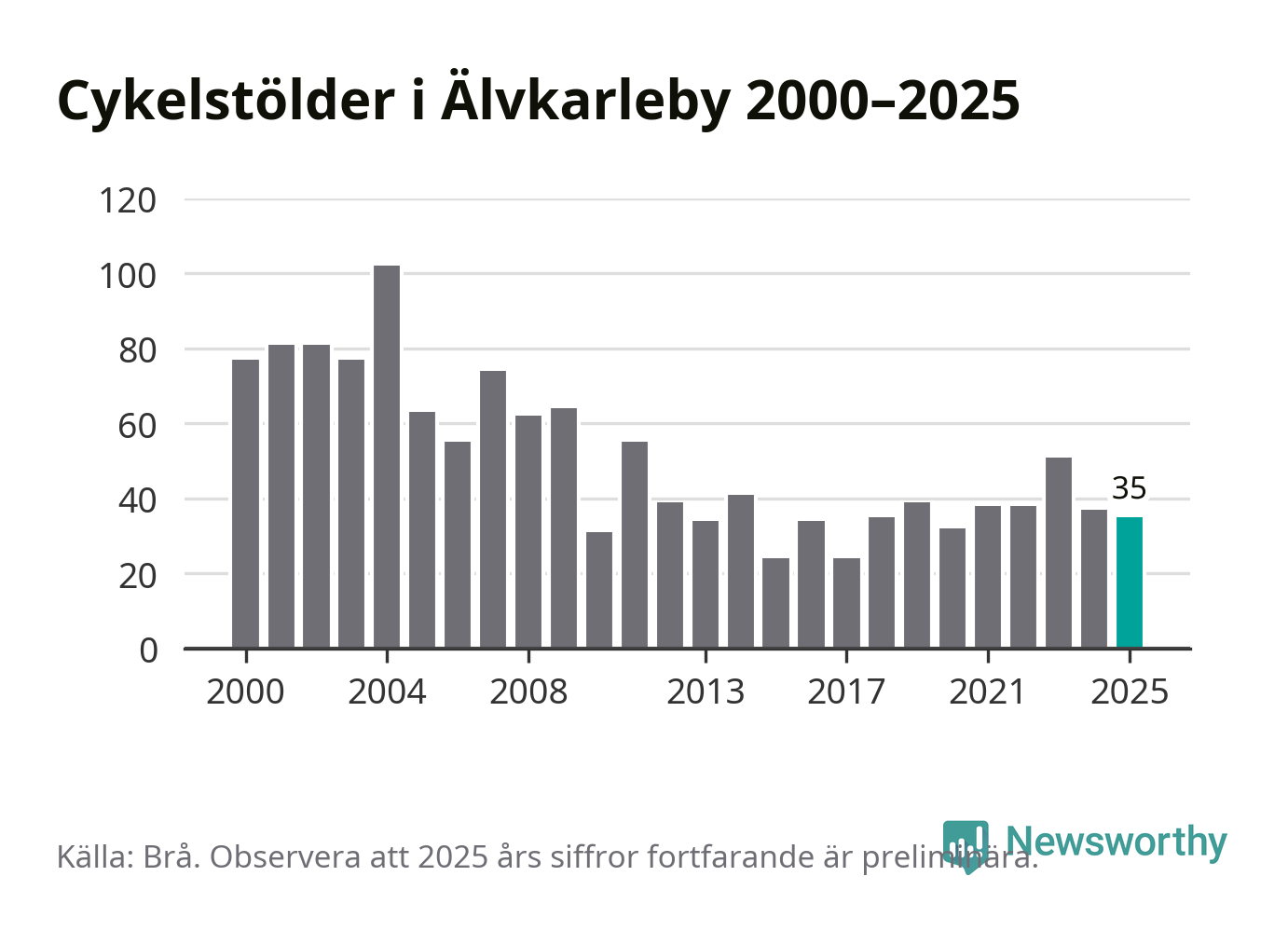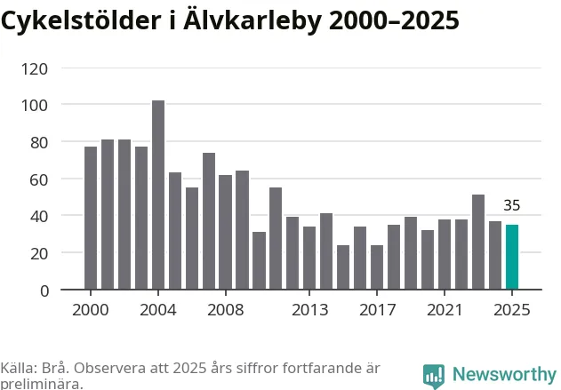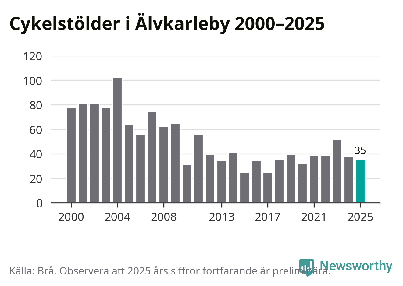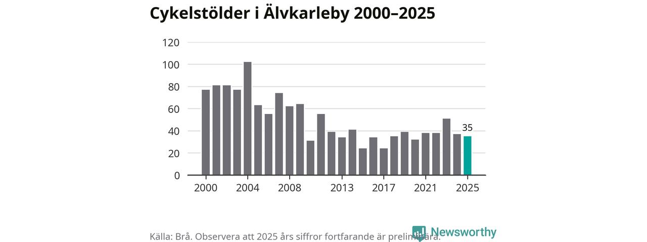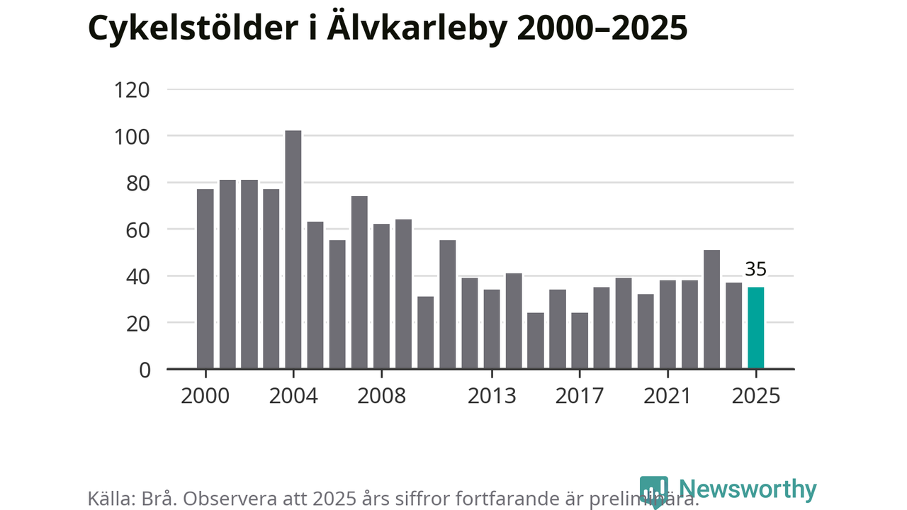 I Älvkarleby kommun sticker antalet cykelstölder 2025 inte ut i en historisk kontext. Under de senaste 25 åren har det som mest anmälts 102 cykelstölder på ett år (2004), som minst 24 stycken (2015 och 2017).