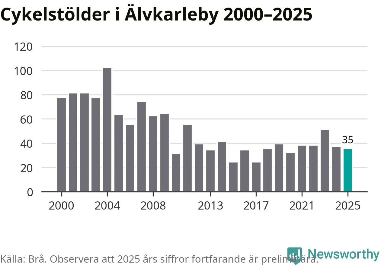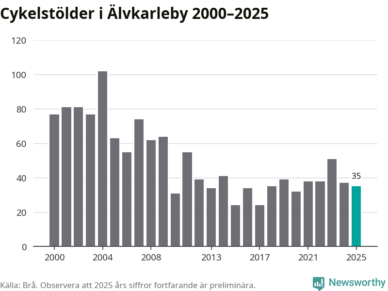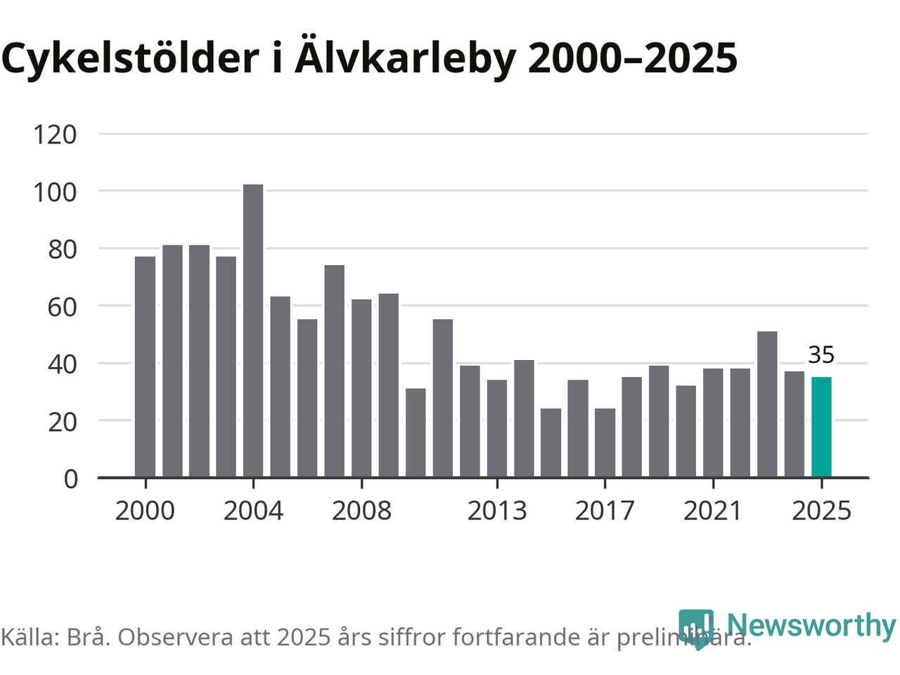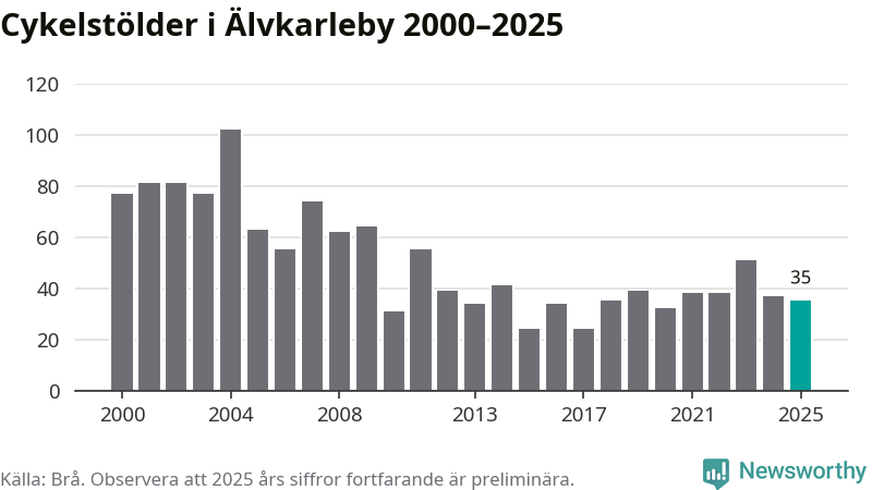 I Älvkarleby kommun sticker antalet cykelstölder 2025 inte ut i en historisk kontext. Under de senaste 25 åren har det som mest anmälts 102 cykelstölder på ett år (2004), som minst 24 stycken (2015 och 2017).
