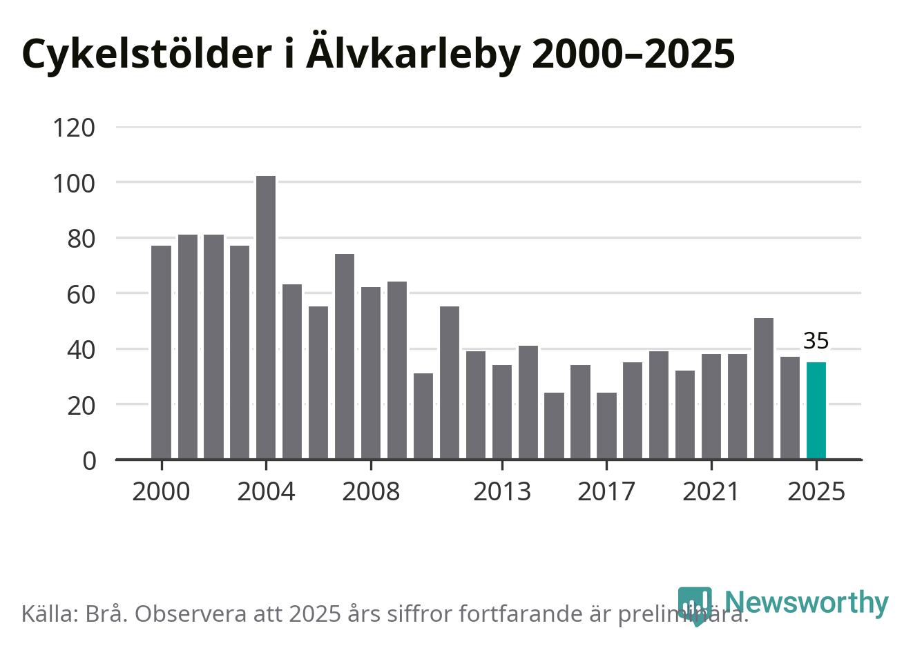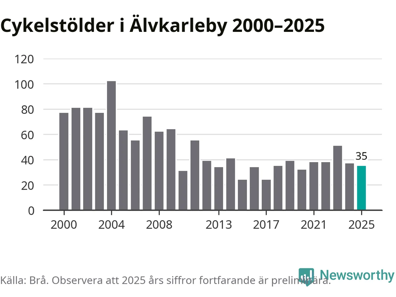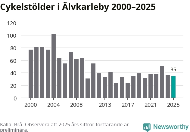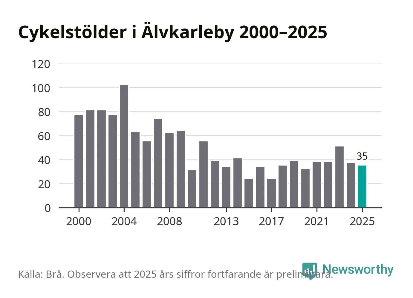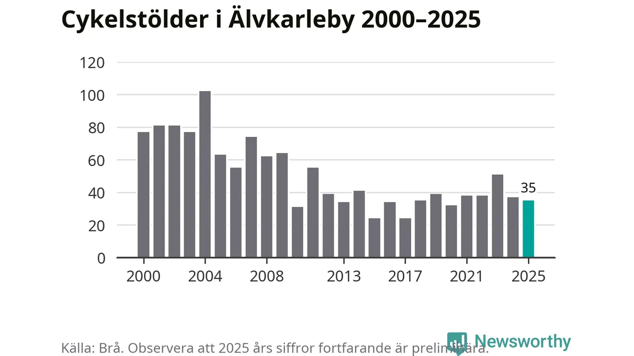 Av de 35 stöldanmälningar i Älvkarleby 2025 gällde sex elcyklar, det motsvarar 17 procent. Brå särredovisar elcyklar sedan 2020 och i riket som helhet ökade anmälningarna om stulna elcyklar kraftigt de första åren, för att de senaste tre åren ha legat relativt stilla. Eftersom antalet cykelstölder totalt har minskat under samma tid har andelen elcyklar ökat. I fjol stod elcyklar för 28 procent av alla anmälda cykelstölder i landet.