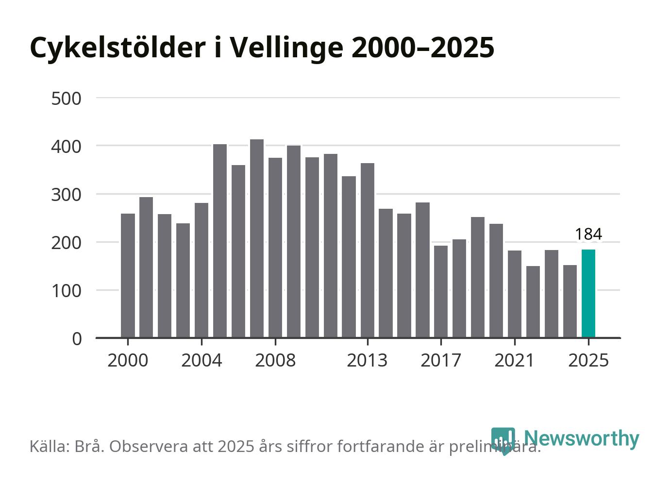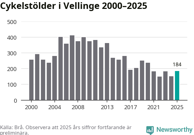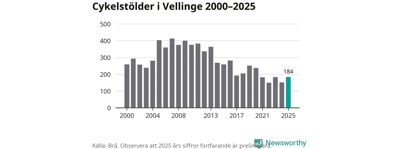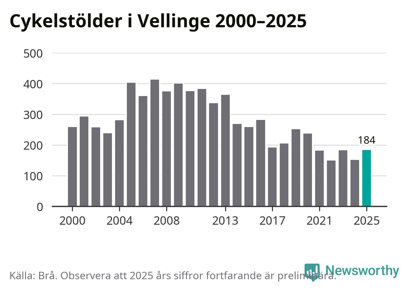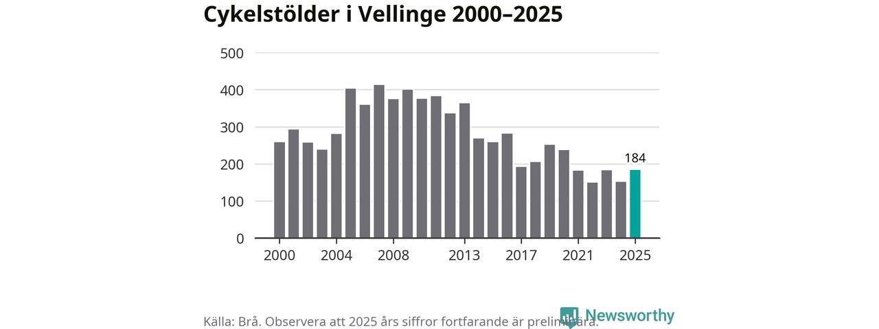 I Vellinge kommun var antalet cykelstölder relativt få i en historisk kontext år 2025, även om det fortfarande är preliminära siffror. Under de senaste 25 åren har det som mest anmälts 412 cykelstölder på ett år (2007), som minst 149 stycken (2022).