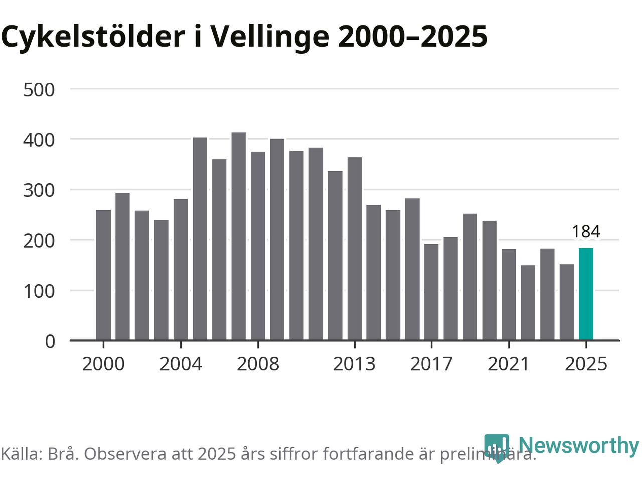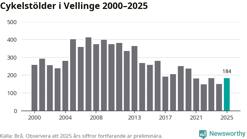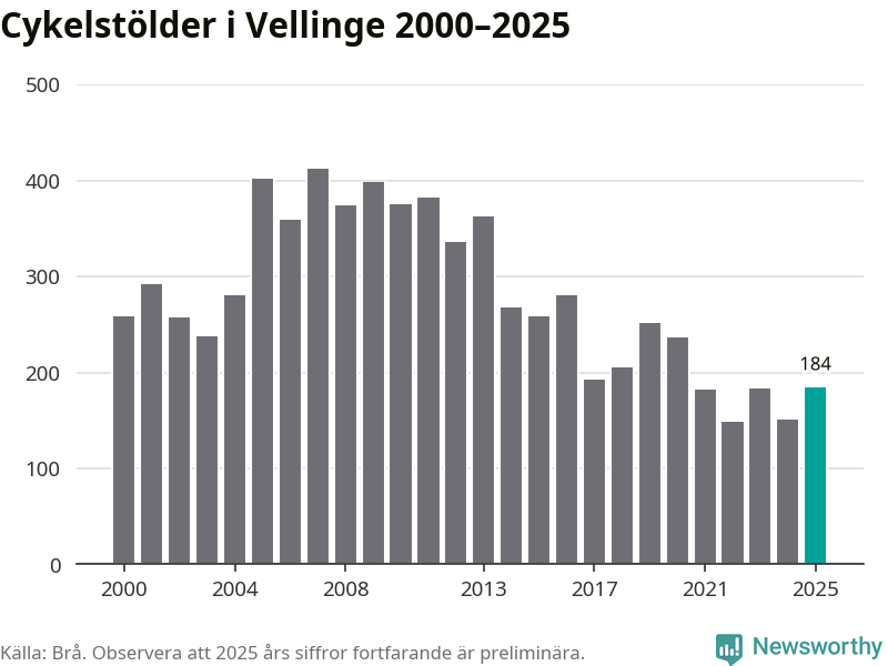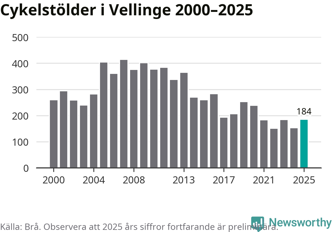 I Vellinge kommun var antalet cykelstölder relativt få i en historisk kontext år 2025, även om det fortfarande är preliminära siffror. Under de senaste 25 åren har det som mest anmälts 412 cykelstölder på ett år (2007), som minst 149 stycken (2022).