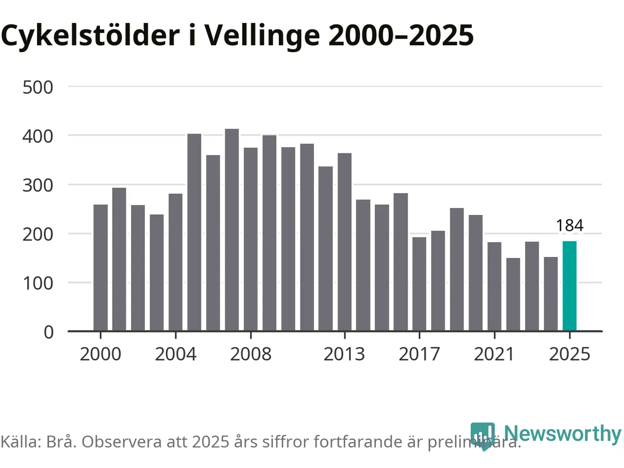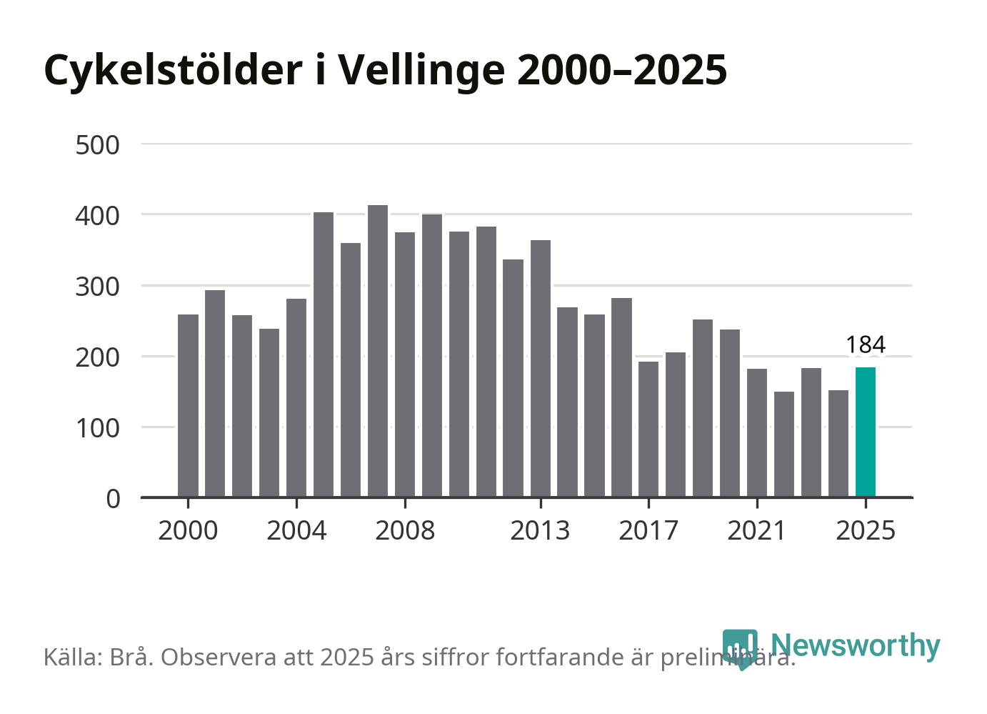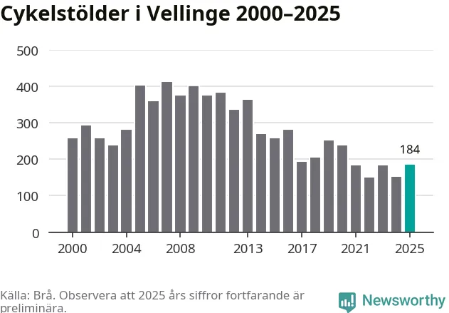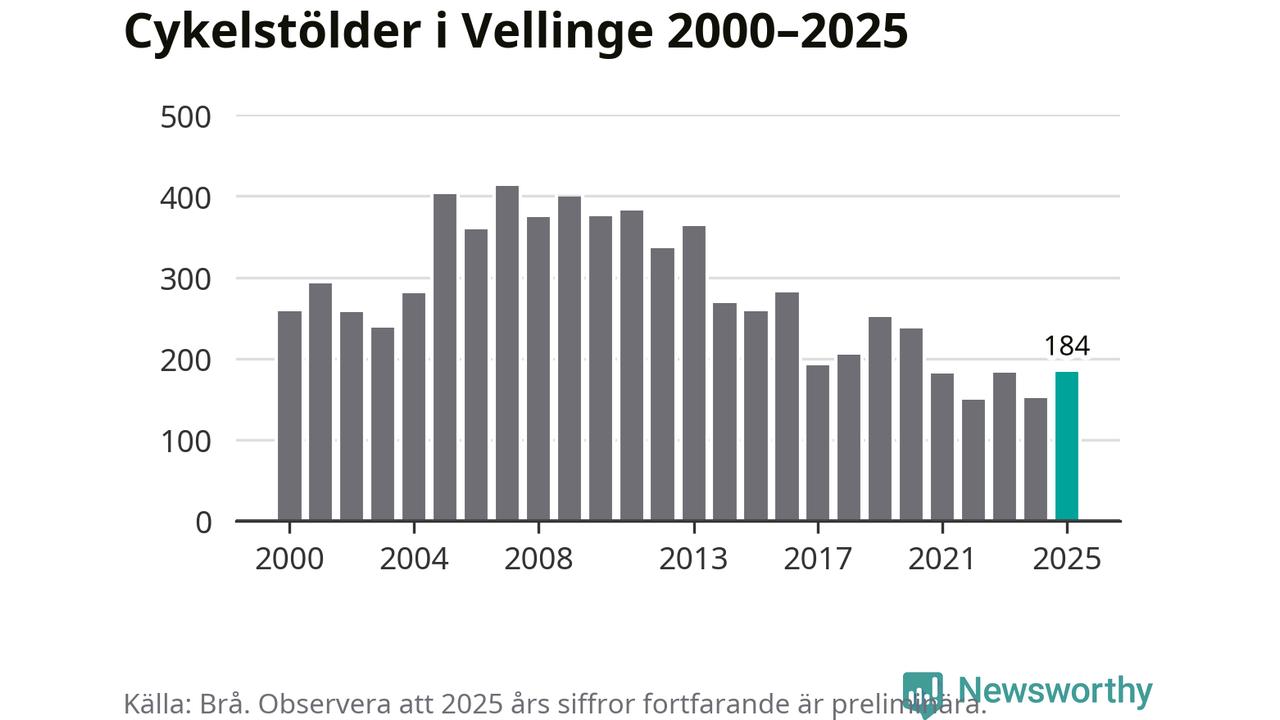 Av de 184 stöldanmälningar i Vellinge 2025 gällde 37 elcyklar, det motsvarar 20 procent. Brå särredovisar elcyklar sedan 2020 och i riket som helhet ökade anmälningarna om stulna elcyklar kraftigt de första åren, för att de senaste tre åren ha legat relativt stilla. Eftersom antalet cykelstölder totalt har minskat under samma tid har andelen elcyklar ökat. I fjol stod elcyklar för 28 procent av alla anmälda cykelstölder i landet.